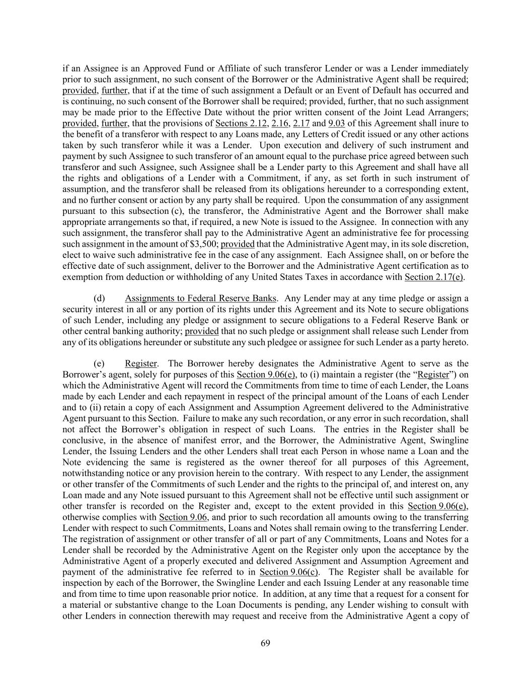69 if an Assignee is an Approved Fund or Affiliate of such transferor Lender or was a Lender immediately prior to such assignment, no such consent of the Borrower or the Administrative Agent shall be required; provided, further, that if at the time of such assignment a Default or an Event of Default has occurred and is continuing, no such consent of the Borrower shall be required; provided, further, that no such assignment may be made prior to the Effective Date without the prior written consent of the Joint Lead Arrangers; provided, further, that the provisions of Sections 2.12, 2.16, 2.17 and 9.03 of this Agreement shall inure to the benefit of a transferor with respect to any Loans made, any Letters of Credit issued or any other actions taken by such transferor while it was a Lender. Upon execution and delivery of such instrument and payment by such Assignee to such transferor of an amount equal to the purchase price agreed between such transferor and such Assignee, such Assignee shall be a Lender party to this Agreement and shall have all the rights and obligations of a Lender with a Commitment, if any, as set forth in such instrument of assumption, and the transferor shall be released from its obligations hereunder to a corresponding extent, and no further consent or action by any party shall be required. Upon the consummation of any assignment pursuant to this subsection (c), the transferor, the Administrative Agent and the Borrower shall make appropriate arrangements so that, if required, a new Note is issued to the Assignee. In connection with any such assignment, the transferor shall pay to the Administrative Agent an administrative fee for processing such assignment in the amount of $3,500; provided that the Administrative Agent may, in its sole discretion, elect to waive such administrative fee in the case of any assignment. Each Assignee shall, on or before the effective date of such assignment, deliver to the Borrower and the Administrative Agent certification as to exemption from deduction or withholding of any United States Taxes in accordance with Section 2.17(e). (d) Assignments to Federal Reserve Banks. Any Lender may at any time pledge or assign a security interest in all or any portion of its rights under this Agreement and its Note to secure obligations of such Lender, including any pledge or assignment to secure obligations to a Federal Reserve Bank or other central banking authority; provided that no such pledge or assignment shall release such Lender from any of its obligations hereunder or substitute any such pledgee or assignee for such Lender as a party hereto. (e) Register. The Borrower hereby designates the Administrative Agent to serve as the Borrower’s agent, solely for purposes of this Section 9.06(e), to (i) maintain a register (the “Register”) on which the Administrative Agent will record the Commitments from time to time of each Lender, the Loans made by each Lender and each repayment in respect of the principal amount of the Loans of each Lender and to (ii) retain a copy of each Assignment and Assumption Agreement delivered to the Administrative Agent pursuant to this Section. Failure to make any such recordation, or any error in such recordation, shall not affect the Borrower’s obligation in respect of such Loans. The entries in the Register shall be conclusive, in the absence of manifest error, and the Borrower, the Administrative Agent, Swingline Lender, the Issuing Lenders and the other Lenders shall treat each Person in whose name a Loan and the Note evidencing the same is registered as the owner thereof for all purposes of this Agreement, notwithstanding notice or any provision herein to the contrary. With respect to any Lender, the assignment or other transfer of the Commitments of such Lender and the rights to the principal of, and interest on, any Loan made and any Note issued pursuant to this Agreement shall not be effective until such assignment or other transfer is recorded on the Register and, except to the extent provided in this Section 9.06(e), otherwise complies with Section 9.06, and prior to such recordation all amounts owing to the transferring Lender with respect to such Commitments, Loans and Notes shall remain owing to the transferring Lender. The registration of assignment or other transfer of all or part of any Commitments, Loans and Notes for a Lender shall be recorded by the Administrative Agent on the Register only upon the acceptance by the Administrative Agent of a properly executed and delivered Assignment and Assumption Agreement and payment of the administrative fee referred to in Section 9.06(c). The Register shall be available for inspection by each of the Borrower, the Swingline Lender and each Issuing Lender at any reasonable time and from time to time upon reasonable prior notice. In addition, at any time that a request for a consent for a material or substantive change to the Loan Documents is pending, any Lender wishing to consult with other Lenders in connection therewith may request and receive from the Administrative Agent a copy of