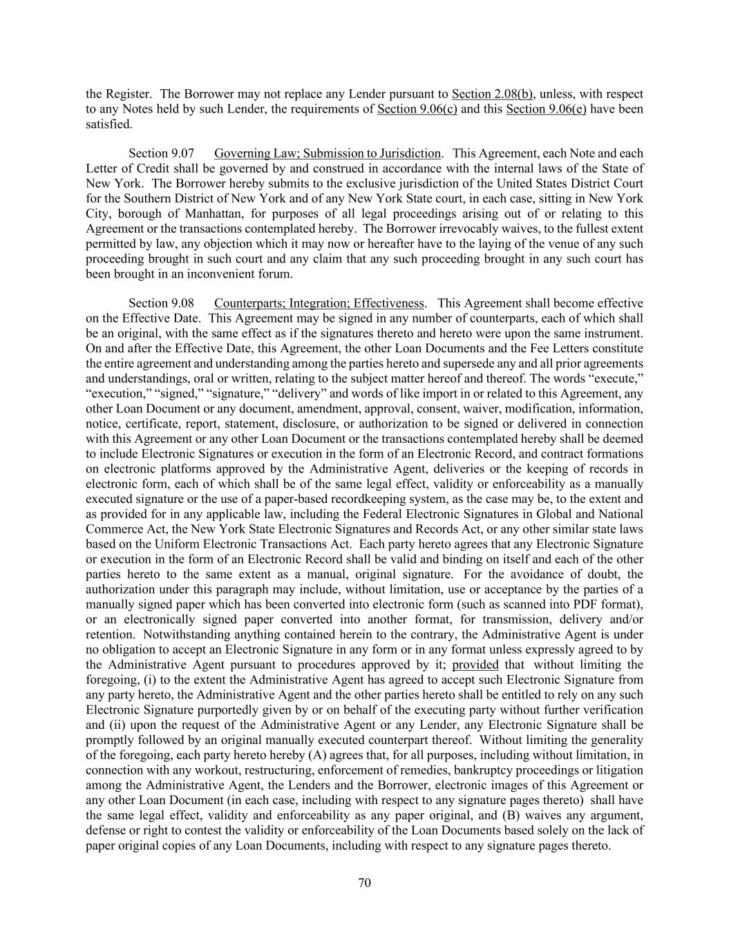 70 the Register. The Borrower may not replace any Lender pursuant to Section 2.08(b), unless, with respect to any Notes held by such Lender, the requirements of Section 9.06(c) and this Section 9.06(e) have been satisfied. Section 9.07 Governing Law; Submission to Jurisdiction. This Agreement, each Note and each Letter of Credit shall be governed by and construed in accordance with the internal laws of the State of New York. The Borrower hereby submits to the exclusive jurisdiction of the United States District Court for the Southern District of New York and of any New York State court, in each case, sitting in New York City, borough of Manhattan, for purposes of all legal proceedings arising out of or relating to this Agreement or the transactions contemplated hereby. The Borrower irrevocably waives, to the fullest extent permitted by law, any objection which it may now or hereafter have to the laying of the venue of any such proceeding brought in such court and any claim that any such proceeding brought in any such court has been brought in an inconvenient forum. Section 9.08 Counterparts; Integration; Effectiveness. This Agreement shall become effective on the Effective Date. This Agreement may be signed in any number of counterparts, each of which shall be an original, with the same effect as if the signatures thereto and hereto were upon the same instrument. On and after the Effective Date, this Agreement, the other Loan Documents and the Fee Letters constitute the entire agreement and understanding among the parties hereto and supersede any and all prior agreements and understandings, oral or written, relating to the subject matter hereof and thereof. The words “execute,” “execution,” “signed,” “signature,” “delivery” and words of like import in or related to this Agreement, any other Loan Document or any document, amendment, approval, consent, waiver, modification, information, notice, certificate, report, statement, disclosure, or authorization to be signed or delivered in connection with this Agreement or any other Loan Document or the transactions contemplated hereby shall be deemed to include Electronic Signatures or execution in the form of an Electronic Record, and contract formations on electronic platforms approved by the Administrative Agent, deliveries or the keeping of records in electronic form, each of which shall be of the same legal effect, validity or enforceability as a manually executed signature or the use of a paper-based recordkeeping system, as the case may be, to the extent and as provided for in any applicable law, including the Federal Electronic Signatures in Global and National Commerce Act, the New York State Electronic Signatures and Records Act, or any other similar state laws based on the Uniform Electronic Transactions Act. Each party hereto agrees that any Electronic Signature or execution in the form of an Electronic Record shall be valid and binding on itself and each of the other parties hereto to the same extent as a manual, original signature. For the avoidance of doubt, the authorization under this paragraph may include, without limitation, use or acceptance by the parties of a manually signed paper which has been converted into electronic form (such as scanned into PDF format), or an electronically signed paper converted into another format, for transmission, delivery and/or retention. Notwithstanding anything contained herein to the contrary, the Administrative Agent is under no obligation to accept an Electronic Signature in any form or in any format unless expressly agreed to by the Administrative Agent pursuant to procedures approved by it; provided that without limiting the foregoing, (i) to the extent the Administrative Agent has agreed to accept such Electronic Signature from any party hereto, the Administrative Agent and the other parties hereto shall be entitled to rely on any such Electronic Signature purportedly given by or on behalf of the executing party without further verification and (ii) upon the request of the Administrative Agent or any Lender, any Electronic Signature shall be promptly followed by an original manually executed counterpart thereof. Without limiting the generality of the foregoing, each party hereto hereby (A) agrees that, for all purposes, including without limitation, in connection with any workout, restructuring, enforcement of remedies, bankruptcy proceedings or litigation among the Administrative Agent, the Lenders and the Borrower, electronic images of this Agreement or any other Loan Document (in each case, including with respect to any signature pages thereto) shall have the same legal effect, validity and enforceability as any paper original, and (B) waives any argument, defense or right to contest the validity or enforceability of the Loan Documents based solely on the lack of paper original copies of any Loan Documents, including with respect to any signature pages thereto.