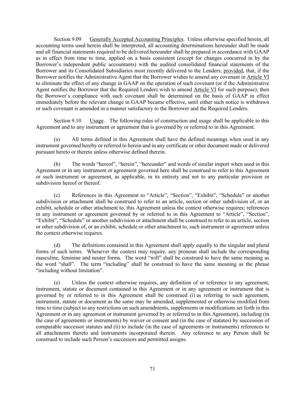 71 Section 9.09 Generally Accepted Accounting Principles. Unless otherwise specified herein, all accounting terms used herein shall be interpreted, all accounting determinations hereunder shall be made and all financial statements required to be delivered hereunder shall be prepared in accordance with GAAP as in effect from time to time, applied on a basis consistent (except for changes concurred in by the Borrower’s independent public accountants) with the audited consolidated financial statements of the Borrower and its Consolidated Subsidiaries most recently delivered to the Lenders; provided, that, if the Borrower notifies the Administrative Agent that the Borrower wishes to amend any covenant in Article VI to eliminate the effect of any change in GAAP on the operation of such covenant (or if the Administrative Agent notifies the Borrower that the Required Lenders wish to amend Article VI for such purpose), then the Borrower’s compliance with such covenant shall be determined on the basis of GAAP in effect immediately before the relevant change in GAAP became effective, until either such notice is withdrawn or such covenant is amended in a manner satisfactory to the Borrower and the Required Lenders. Section 9.10 Usage. The following rules of construction and usage shall be applicable to this Agreement and to any instrument or agreement that is governed by or referred to in this Agreement. (a) All terms defined in this Agreement shall have the defined meanings when used in any instrument governed hereby or referred to herein and in any certificate or other document made or delivered pursuant hereto or thereto unless otherwise defined therein. (b) The words “hereof”, “herein”, “hereunder” and words of similar import when used in this Agreement or in any instrument or agreement governed here shall be construed to refer to this Agreement or such instrument or agreement, as applicable, in its entirety and not to any particular provision or subdivision hereof or thereof. (c) References in this Agreement to “Article”, “Section”, “Exhibit”, “Schedule” or another subdivision or attachment shall be construed to refer to an article, section or other subdivision of, or an exhibit, schedule or other attachment to, this Agreement unless the context otherwise requires; references in any instrument or agreement governed by or referred to in this Agreement to “Article”, “Section”, “Exhibit”, “Schedule” or another subdivision or attachment shall be construed to refer to an article, section or other subdivision of, or an exhibit, schedule or other attachment to, such instrument or agreement unless the context otherwise requires. (d) The definitions contained in this Agreement shall apply equally to the singular and plural forms of such terms. Whenever the context may require, any pronoun shall include the corresponding masculine, feminine and neuter forms. The word “will” shall be construed to have the same meaning as the word “shall”. The term “including” shall be construed to have the same meaning as the phrase “including without limitation”. (e) Unless the context otherwise requires, any definition of or reference to any agreement, instrument, statute or document contained in this Agreement or in any agreement or instrument that is governed by or referred to in this Agreement shall be construed (i) as referring to such agreement, instrument, statute or document as the same may be amended, supplemented or otherwise modified from time to time (subject to any restrictions on such amendments, supplements or modifications set forth in this Agreement or in any agreement or instrument governed by or referred to in this Agreement), including (in the case of agreements or instruments) by waiver or consent and (in the case of statutes) by succession of comparable successor statutes and (ii) to include (in the case of agreements or instruments) references to all attachments thereto and instruments incorporated therein. Any reference to any Person shall be construed to include such Person’s successors and permitted assigns.