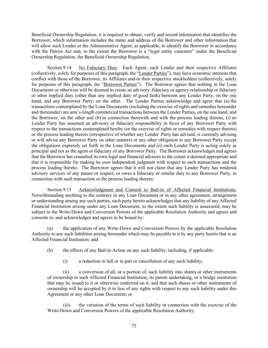 73 Beneficial Ownership Regulation, it is required to obtain, verify and record information that identifies the Borrower, which information includes the name and address of the Borrower and other information that will allow such Lender or the Administrative Agent, as applicable, to identify the Borrower in accordance with the Patriot Act and, to the extent the Borrower is a “legal entity customer” under the Beneficial Ownership Regulation, the Beneficial Ownership Regulation. Section 9.14 No Fiduciary Duty. Each Agent, each Lender and their respective Affiliates (collectively, solely for purposes of this paragraph, the “Lender Parties”), may have economic interests that conflict with those of the Borrower, its Affiliates and/or their respective stockholders (collectively, solely for purposes of this paragraph, the “Borrower Parties”). The Borrower agrees that nothing in the Loan Documents or otherwise will be deemed to create an advisory, fiduciary or agency relationship or fiduciary or other implied duty (other than any implied duty of good faith) between any Lender Party, on the one hand, and any Borrower Party, on the other. The Lender Parties acknowledge and agree that (a) the transactions contemplated by the Loan Documents (including the exercise of rights and remedies hereunder and thereunder) are arm’s-length commercial transactions between the Lender Parties, on the one hand, and the Borrower, on the other and (b) in connection therewith and with the process leading thereto, (i) no Lender Party has assumed an advisory or fiduciary responsibility in favor of any Borrower Party with respect to the transactions contemplated hereby (or the exercise of rights or remedies with respect thereto) or the process leading thereto (irrespective of whether any Lender Party has advised, is currently advising or will advise any Borrower Party on other matters) or any other obligation to any Borrower Party except the obligations expressly set forth in the Loan Documents and (ii) each Lender Party is acting solely as principal and not as the agent or fiduciary of any Borrower Party. The Borrower acknowledges and agrees that the Borrower has consulted its own legal and financial advisors to the extent it deemed appropriate and that it is responsible for making its own independent judgment with respect to such transactions and the process leading thereto. The Borrower agrees that it will not claim that any Lender Party has rendered advisory services of any nature or respect, or owes a fiduciary or similar duty to any Borrower Party, in connection with such transaction or the process leading thereto. Section 9.15 Acknowledgment and Consent to Bail-in of Affected Financial Institutions. Notwithstanding anything to the contrary in any Loan Document or in any other agreement, arrangement or understanding among any such parties, each party hereto acknowledges that any liability of any Affected Financial Institution arising under any Loan Document, to the extent such liability is unsecured, may be subject to the Write-Down and Conversion Powers of the applicable Resolution Authority and agrees and consents to, and acknowledges and agrees to be bound by: (a) the application of any Write-Down and Conversion Powers by the applicable Resolution Authority to any such liabilities arising hereunder which may be payable to it by any party hereto that is an Affected Financial Institution; and (b) the effects of any Bail-in Action on any such liability, including, if applicable: (i) a reduction in full or in part or cancellation of any such liability; (ii) a conversion of all, or a portion of, such liability into shares or other instruments of ownership in such Affected Financial Institution, its parent undertaking, or a bridge institution that may be issued to it or otherwise conferred on it, and that such shares or other instruments of ownership will be accepted by it in lieu of any rights with respect to any such liability under this Agreement or any other Loan Document; or (iii) the variation of the terms of such liability in connection with the exercise of the Write-Down and Conversion Powers of the applicable Resolution Authority.