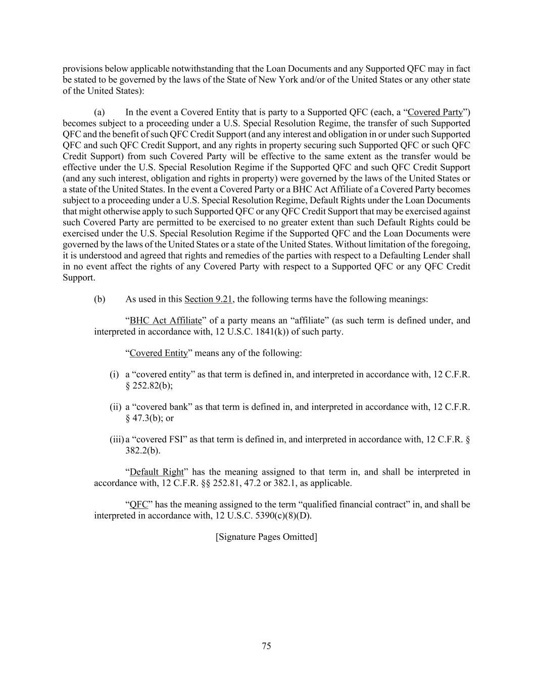 75 provisions below applicable notwithstanding that the Loan Documents and any Supported QFC may in fact be stated to be governed by the laws of the State of New York and/or of the United States or any other state of the United States): (a) In the event a Covered Entity that is party to a Supported QFC (each, a “Covered Party”) becomes subject to a proceeding under a U.S. Special Resolution Regime, the transfer of such Supported QFC and the benefit of such QFC Credit Support (and any interest and obligation in or under such Supported QFC and such QFC Credit Support, and any rights in property securing such Supported QFC or such QFC Credit Support) from such Covered Party will be effective to the same extent as the transfer would be effective under the U.S. Special Resolution Regime if the Supported QFC and such QFC Credit Support (and any such interest, obligation and rights in property) were governed by the laws of the United States or a state of the United States. In the event a Covered Party or a BHC Act Affiliate of a Covered Party becomes subject to a proceeding under a U.S. Special Resolution Regime, Default Rights under the Loan Documents that might otherwise apply to such Supported QFC or any QFC Credit Support that may be exercised against such Covered Party are permitted to be exercised to no greater extent than such Default Rights could be exercised under the U.S. Special Resolution Regime if the Supported QFC and the Loan Documents were governed by the laws of the United States or a state of the United States. Without limitation of the foregoing, it is understood and agreed that rights and remedies of the parties with respect to a Defaulting Lender shall in no event affect the rights of any Covered Party with respect to a Supported QFC or any QFC Credit Support. (b) As used in this Section 9.21, the following terms have the following meanings: “BHC Act Affiliate” of a party means an “affiliate” (as such term is defined under, and interpreted in accordance with, 12 U.S.C. 1841(k)) of such party. “Covered Entity” means any of the following: (i) a “covered entity” as that term is defined in, and interpreted in accordance with, 12 C.F.R. § 252.82(b); (ii) a “covered bank” as that term is defined in, and interpreted in accordance with, 12 C.F.R. § 47.3(b); or (iii) a “covered FSI” as that term is defined in, and interpreted in accordance with, 12 C.F.R. § 382.2(b). “Default Right” has the meaning assigned to that term in, and shall be interpreted in accordance with, 12 C.F.R. §§ 252.81, 47.2 or 382.1, as applicable. “QFC” has the meaning assigned to the term “qualified financial contract” in, and shall be interpreted in accordance with, 12 U.S.C. 5390(c)(8)(D). [Signature Pages Omitted]