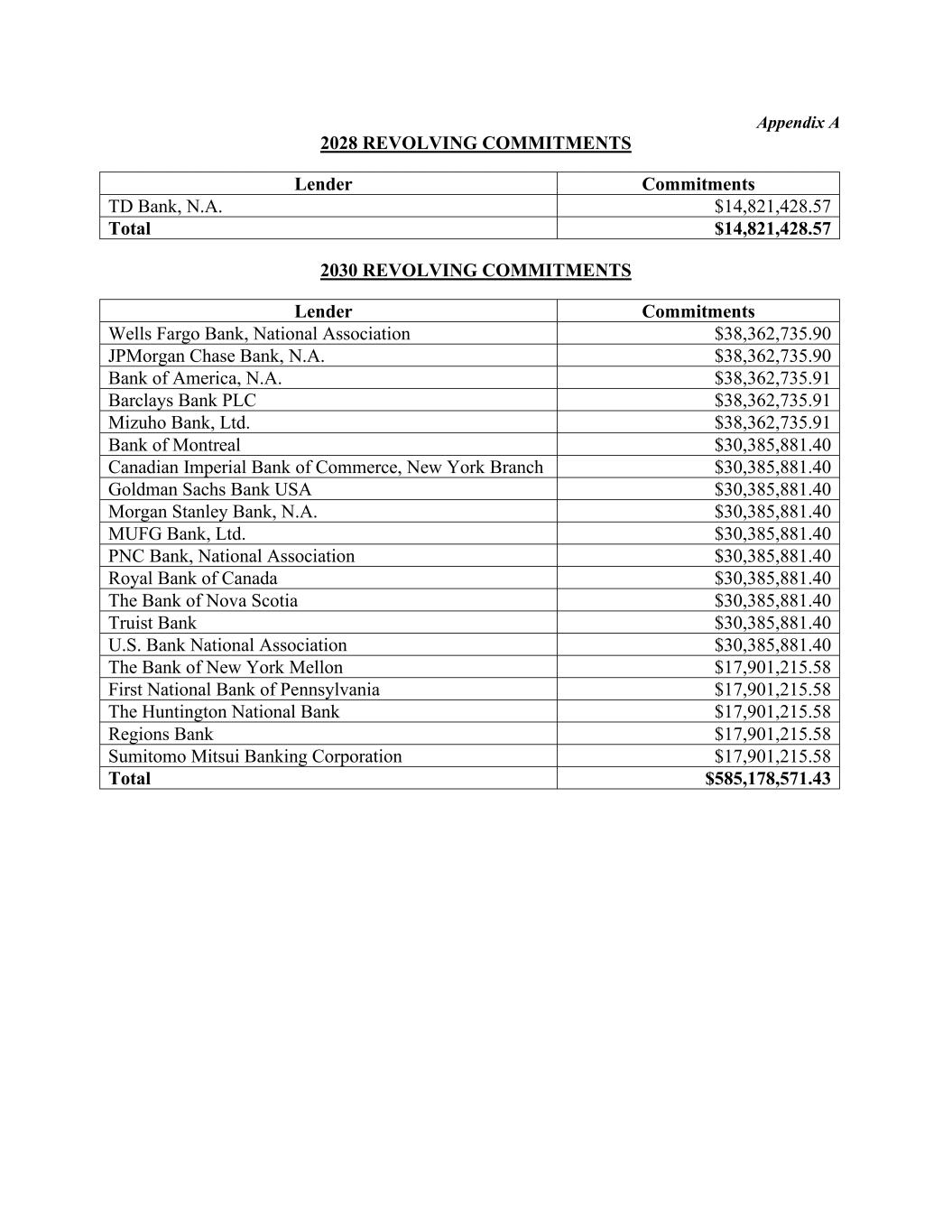 Appendix A 2028 REVOLVING COMMITMENTS Lender Commitments TD Bank, N.A. $14,821,428.57 Total $14,821,428.57 2030 REVOLVING COMMITMENTS Lender Commitments Wells Fargo Bank, National Association $38,362,735.90 JPMorgan Chase Bank, N.A. $38,362,735.90 Bank of America, N.A. $38,362,735.91 Barclays Bank PLC $38,362,735.91 Mizuho Bank, Ltd. $38,362,735.91 Bank of Montreal $30,385,881.40 Canadian Imperial Bank of Commerce, New York Branch $30,385,881.40 Goldman Sachs Bank USA $30,385,881.40 Morgan Stanley Bank, N.A. $30,385,881.40 MUFG Bank, Ltd. $30,385,881.40 PNC Bank, National Association $30,385,881.40 Royal Bank of Canada $30,385,881.40 The Bank of Nova Scotia $30,385,881.40 Truist Bank $30,385,881.40 U.S. Bank National Association $30,385,881.40 The Bank of New York Mellon $17,901,215.58 First National Bank of Pennsylvania $17,901,215.58 The Huntington National Bank $17,901,215.58 Regions Bank $17,901,215.58 Sumitomo Mitsui Banking Corporation $17,901,215.58 Total $585,178,571.43