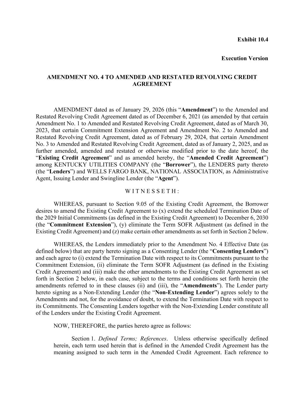 Exhibit 10.4 Execution Version AMENDMENT NO. 4 TO AMENDED AND RESTATED REVOLVING CREDIT AGREEMENT AMENDMENT dated as of January 29, 2026 (this “Amendment”) to the Amended and Restated Revolving Credit Agreement dated as of December 6, 2021 (as amended by that certain Amendment No. 1 to Amended and Restated Revolving Credit Agreement, dated as of March 30, 2023, that certain Commitment Extension Agreement and Amendment No. 2 to Amended and Restated Revolving Credit Agreement, dated as of February 29, 2024, that certain Amendment No. 3 to Amended and Restated Revolving Credit Agreement, dated as of January 2, 2025, and as further amended, amended and restated or otherwise modified prior to the date hereof, the “Existing Credit Agreement” and as amended hereby, the “Amended Credit Agreement”) among KENTUCKY UTILITIES COMPANY (the “Borrower”), the LENDERS party thereto (the “Lenders”) and WELLS FARGO BANK, NATIONAL ASSOCIATION, as Administrative Agent, Issuing Lender and Swingline Lender (the “Agent”). W I T N E S S E T H : WHEREAS, pursuant to Section 9.05 of the Existing Credit Agreement, the Borrower desires to amend the Existing Credit Agreement to (x) extend the scheduled Termination Date of the 2029 Initial Commitments (as defined in the Existing Credit Agreement) to December 6, 2030 (the “Commitment Extension”), (y) eliminate the Term SOFR Adjustment (as defined in the Existing Credit Agreement) and (z) make certain other amendments as set forth in Section 2 below. WHEREAS, the Lenders immediately prior to the Amendment No. 4 Effective Date (as defined below) that are party hereto signing as a Consenting Lender (the “Consenting Lenders”) and each agree to (i) extend the Termination Date with respect to its Commitments pursuant to the Commitment Extension, (ii) eliminate the Term SOFR Adjustment (as defined in the Existing Credit Agreement) and (iii) make the other amendments to the Existing Credit Agreement as set forth in Section 2 below, in each case, subject to the terms and conditions set forth herein (the amendments referred to in these clauses (ii) and (iii), the “Amendments”). The Lender party hereto signing as a Non-Extending Lender (the “Non-Extending Lender”) agrees solely to the Amendments and not, for the avoidance of doubt, to extend the Termination Date with respect to its Commitments. The Consenting Lenders together with the Non-Extending Lender constitute all of the Lenders under the Existing Credit Agreement. NOW, THEREFORE, the parties hereto agree as follows: Section 1. Defined Terms; References. Unless otherwise specifically defined herein, each term used herein that is defined in the Amended Credit Agreement has the meaning assigned to such term in the Amended Credit Agreement. Each reference to
