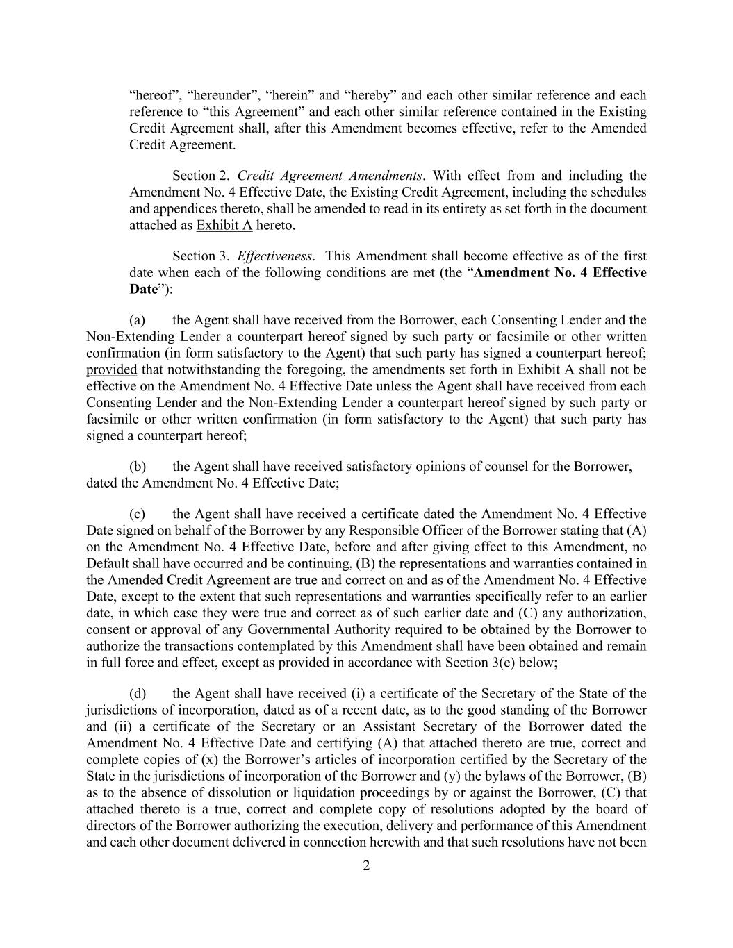 2 “hereof”, “hereunder”, “herein” and “hereby” and each other similar reference and each reference to “this Agreement” and each other similar reference contained in the Existing Credit Agreement shall, after this Amendment becomes effective, refer to the Amended Credit Agreement. Section 2. Credit Agreement Amendments. With effect from and including the Amendment No. 4 Effective Date, the Existing Credit Agreement, including the schedules and appendices thereto, shall be amended to read in its entirety as set forth in the document attached as Exhibit A hereto. Section 3. Effectiveness. This Amendment shall become effective as of the first date when each of the following conditions are met (the “Amendment No. 4 Effective Date”): (a) the Agent shall have received from the Borrower, each Consenting Lender and the Non-Extending Lender a counterpart hereof signed by such party or facsimile or other written confirmation (in form satisfactory to the Agent) that such party has signed a counterpart hereof; provided that notwithstanding the foregoing, the amendments set forth in Exhibit A shall not be effective on the Amendment No. 4 Effective Date unless the Agent shall have received from each Consenting Lender and the Non-Extending Lender a counterpart hereof signed by such party or facsimile or other written confirmation (in form satisfactory to the Agent) that such party has signed a counterpart hereof; (b) the Agent shall have received satisfactory opinions of counsel for the Borrower, dated the Amendment No. 4 Effective Date; (c) the Agent shall have received a certificate dated the Amendment No. 4 Effective Date signed on behalf of the Borrower by any Responsible Officer of the Borrower stating that (A) on the Amendment No. 4 Effective Date, before and after giving effect to this Amendment, no Default shall have occurred and be continuing, (B) the representations and warranties contained in the Amended Credit Agreement are true and correct on and as of the Amendment No. 4 Effective Date, except to the extent that such representations and warranties specifically refer to an earlier date, in which case they were true and correct as of such earlier date and (C) any authorization, consent or approval of any Governmental Authority required to be obtained by the Borrower to authorize the transactions contemplated by this Amendment shall have been obtained and remain in full force and effect, except as provided in accordance with Section 3(e) below; (d) the Agent shall have received (i) a certificate of the Secretary of the State of the jurisdictions of incorporation, dated as of a recent date, as to the good standing of the Borrower and (ii) a certificate of the Secretary or an Assistant Secretary of the Borrower dated the Amendment No. 4 Effective Date and certifying (A) that attached thereto are true, correct and complete copies of (x) the Borrower’s articles of incorporation certified by the Secretary of the State in the jurisdictions of incorporation of the Borrower and (y) the bylaws of the Borrower, (B) as to the absence of dissolution or liquidation proceedings by or against the Borrower, (C) that attached thereto is a true, correct and complete copy of resolutions adopted by the board of directors of the Borrower authorizing the execution, delivery and performance of this Amendment and each other document delivered in connection herewith and that such resolutions have not been