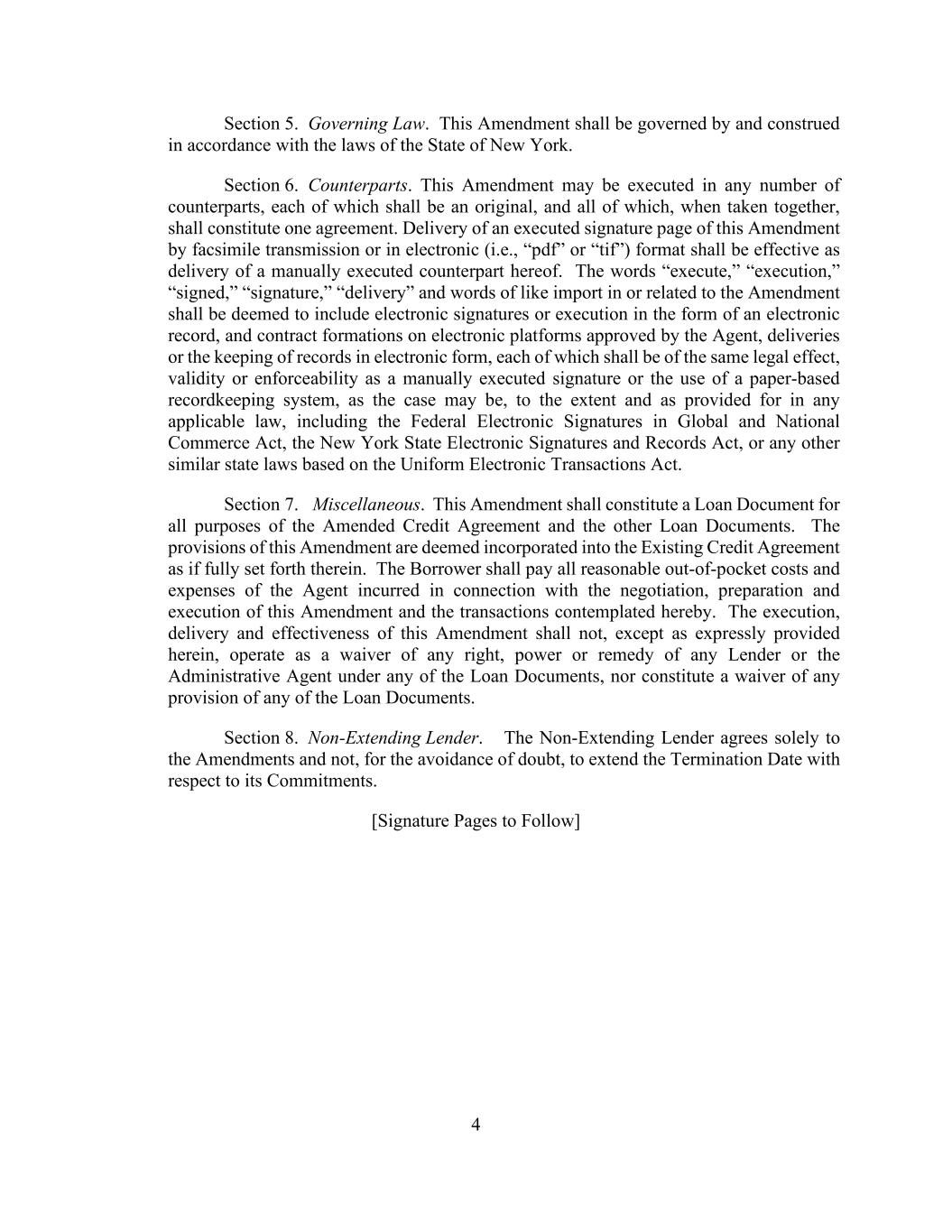 4 Section 5. Governing Law. This Amendment shall be governed by and construed in accordance with the laws of the State of New York. Section 6. Counterparts. This Amendment may be executed in any number of counterparts, each of which shall be an original, and all of which, when taken together, shall constitute one agreement. Delivery of an executed signature page of this Amendment by facsimile transmission or in electronic (i.e., “pdf” or “tif”) format shall be effective as delivery of a manually executed counterpart hereof. The words “execute,” “execution,” “signed,” “signature,” “delivery” and words of like import in or related to the Amendment shall be deemed to include electronic signatures or execution in the form of an electronic record, and contract formations on electronic platforms approved by the Agent, deliveries or the keeping of records in electronic form, each of which shall be of the same legal effect, validity or enforceability as a manually executed signature or the use of a paper-based recordkeeping system, as the case may be, to the extent and as provided for in any applicable law, including the Federal Electronic Signatures in Global and National Commerce Act, the New York State Electronic Signatures and Records Act, or any other similar state laws based on the Uniform Electronic Transactions Act. Section 7. Miscellaneous. This Amendment shall constitute a Loan Document for all purposes of the Amended Credit Agreement and the other Loan Documents. The provisions of this Amendment are deemed incorporated into the Existing Credit Agreement as if fully set forth therein. The Borrower shall pay all reasonable out-of-pocket costs and expenses of the Agent incurred in connection with the negotiation, preparation and execution of this Amendment and the transactions contemplated hereby. The execution, delivery and effectiveness of this Amendment shall not, except as expressly provided herein, operate as a waiver of any right, power or remedy of any Lender or the Administrative Agent under any of the Loan Documents, nor constitute a waiver of any provision of any of the Loan Documents. Section 8. Non-Extending Lender. The Non-Extending Lender agrees solely to the Amendments and not, for the avoidance of doubt, to extend the Termination Date with respect to its Commitments. [Signature Pages to Follow]