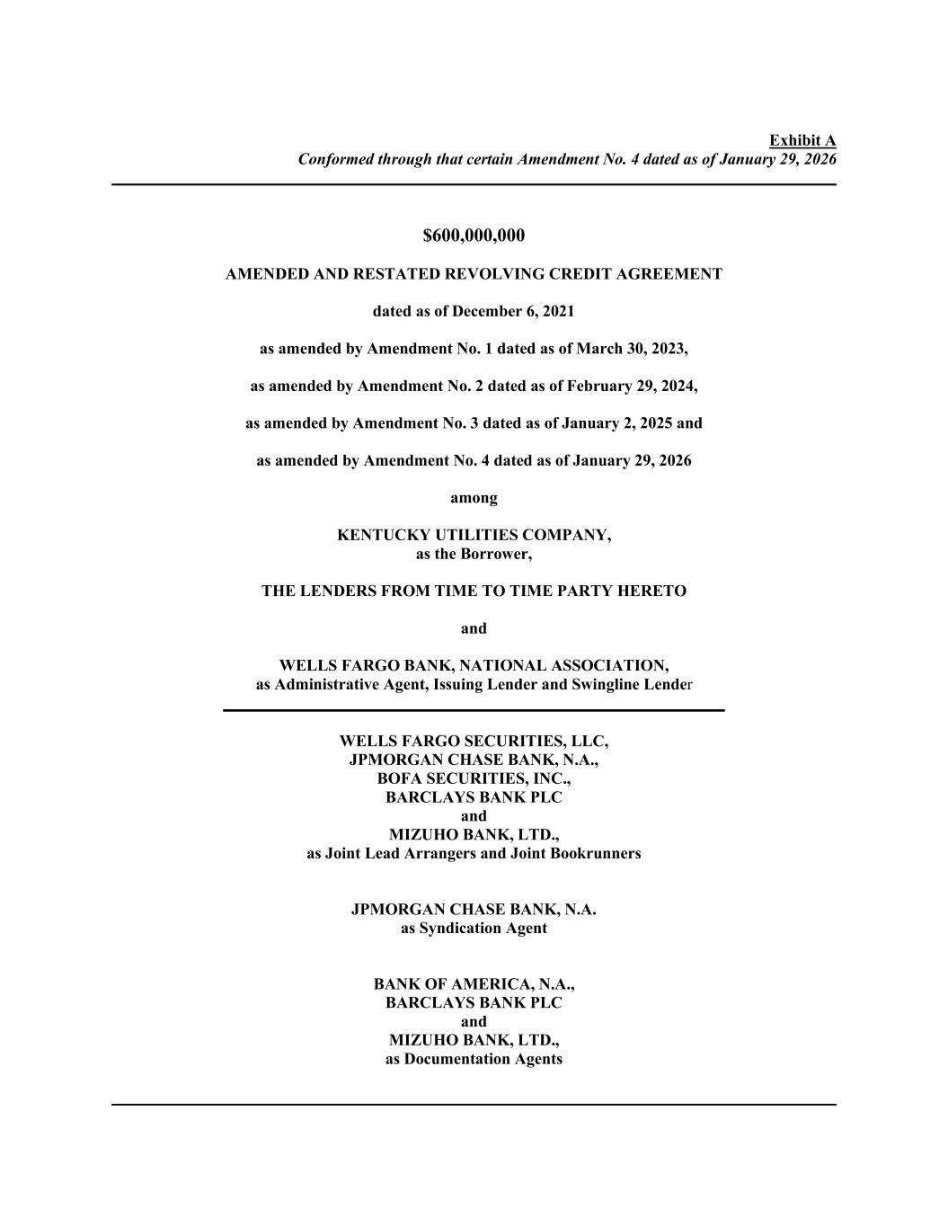 Exhibit A Conformed through that certain Amendment No. 4 dated as of January 29, 2026 $600,000,000 AMENDED AND RESTATED REVOLVING CREDIT AGREEMENT dated as of December 6, 2021 as amended by Amendment No. 1 dated as of March 30, 2023, as amended by Amendment No. 2 dated as of February 29, 2024, as amended by Amendment No. 3 dated as of January 2, 2025 and as amended by Amendment No. 4 dated as of January 29, 2026 among KENTUCKY UTILITIES COMPANY, as the Borrower, THE LENDERS FROM TIME TO TIME PARTY HERETO and WELLS FARGO BANK, NATIONAL ASSOCIATION, as Administrative Agent, Issuing Lender and Swingline Lender WELLS FARGO SECURITIES, LLC, JPMORGAN CHASE BANK, N.A., BOFA SECURITIES, INC., BARCLAYS BANK PLC and MIZUHO BANK, LTD., as Joint Lead Arrangers and Joint Bookrunners JPMORGAN CHASE BANK, N.A. as Syndication Agent BANK OF AMERICA, N.A., BARCLAYS BANK PLC and MIZUHO BANK, LTD., as Documentation Agents