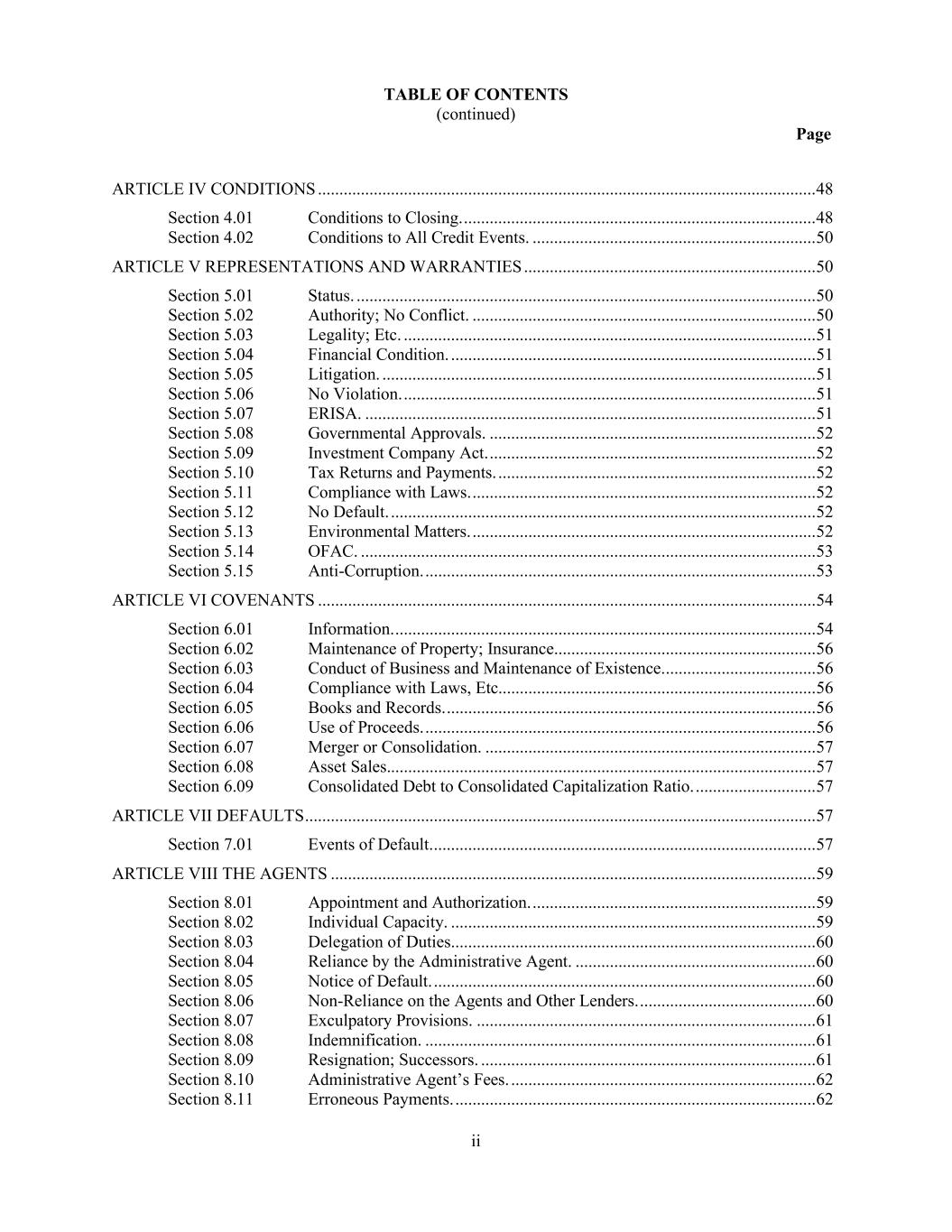 TABLE OF CONTENTS (continued) Page ii ARTICLE IV CONDITIONS .................................................................................................................... 48 Section 4.01 Conditions to Closing. .................................................................................. 48 Section 4.02 Conditions to All Credit Events. .................................................................. 50 ARTICLE V REPRESENTATIONS AND WARRANTIES .................................................................... 50 Section 5.01 Status. ........................................................................................................... 50 Section 5.02 Authority; No Conflict. ................................................................................ 50 Section 5.03 Legality; Etc. ................................................................................................ 51 Section 5.04 Financial Condition. ..................................................................................... 51 Section 5.05 Litigation. ..................................................................................................... 51 Section 5.06 No Violation. ................................................................................................ 51 Section 5.07 ERISA. ......................................................................................................... 51 Section 5.08 Governmental Approvals. ............................................................................ 52 Section 5.09 Investment Company Act. ............................................................................ 52 Section 5.10 Tax Returns and Payments. .......................................................................... 52 Section 5.11 Compliance with Laws. ................................................................................ 52 Section 5.12 No Default. ................................................................................................... 52 Section 5.13 Environmental Matters. ................................................................................ 52 Section 5.14 OFAC. .......................................................................................................... 53 Section 5.15 Anti-Corruption. ........................................................................................... 53 ARTICLE VI COVENANTS .................................................................................................................... 54 Section 6.01 Information. .................................................................................................. 54 Section 6.02 Maintenance of Property; Insurance. ............................................................ 56 Section 6.03 Conduct of Business and Maintenance of Existence. ................................... 56 Section 6.04 Compliance with Laws, Etc.......................................................................... 56 Section 6.05 Books and Records. ...................................................................................... 56 Section 6.06 Use of Proceeds. ........................................................................................... 56 Section 6.07 Merger or Consolidation. ............................................................................. 57 Section 6.08 Asset Sales.................................................................................................... 57 Section 6.09 Consolidated Debt to Consolidated Capitalization Ratio. ............................ 57 ARTICLE VII DEFAULTS ....................................................................................................................... 57 Section 7.01 Events of Default. ......................................................................................... 57 ARTICLE VIII THE AGENTS ................................................................................................................. 59 Section 8.01 Appointment and Authorization. .................................................................. 59 Section 8.02 Individual Capacity. ..................................................................................... 59 Section 8.03 Delegation of Duties. .................................................................................... 60 Section 8.04 Reliance by the Administrative Agent. ........................................................ 60 Section 8.05 Notice of Default. ......................................................................................... 60 Section 8.06 Non-Reliance on the Agents and Other Lenders. ......................................... 60 Section 8.07 Exculpatory Provisions. ............................................................................... 61 Section 8.08 Indemnification. ........................................................................................... 61 Section 8.09 Resignation; Successors. .............................................................................. 61 Section 8.10 Administrative Agent’s Fees. ....................................................................... 62 Section 8.11 Erroneous Payments. .................................................................................... 62