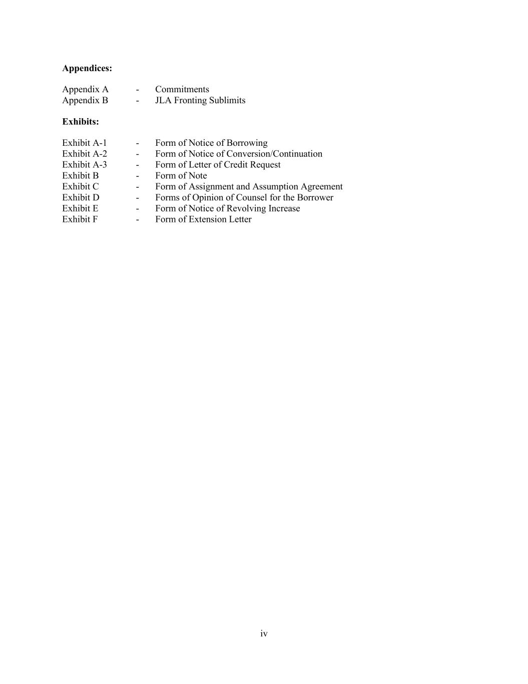 iv Appendices: Appendix A - Commitments Appendix B - JLA Fronting Sublimits Exhibits: Exhibit A-1 - Form of Notice of Borrowing Exhibit A-2 - Form of Notice of Conversion/Continuation Exhibit A-3 - Form of Letter of Credit Request Exhibit B - Form of Note Exhibit C - Form of Assignment and Assumption Agreement Exhibit D - Forms of Opinion of Counsel for the Borrower Exhibit E - Form of Notice of Revolving Increase Exhibit F - Form of Extension Letter