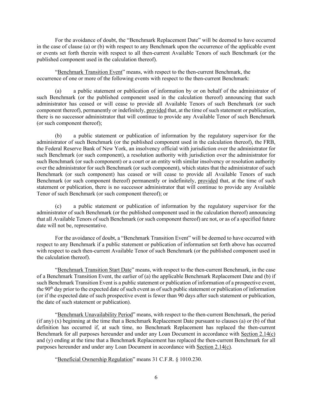 6 For the avoidance of doubt, the “Benchmark Replacement Date” will be deemed to have occurred in the case of clause (a) or (b) with respect to any Benchmark upon the occurrence of the applicable event or events set forth therein with respect to all then-current Available Tenors of such Benchmark (or the published component used in the calculation thereof). “Benchmark Transition Event” means, with respect to the then-current Benchmark, the occurrence of one or more of the following events with respect to the then-current Benchmark: (a) a public statement or publication of information by or on behalf of the administrator of such Benchmark (or the published component used in the calculation thereof) announcing that such administrator has ceased or will cease to provide all Available Tenors of such Benchmark (or such component thereof), permanently or indefinitely, provided that, at the time of such statement or publication, there is no successor administrator that will continue to provide any Available Tenor of such Benchmark (or such component thereof); (b) a public statement or publication of information by the regulatory supervisor for the administrator of such Benchmark (or the published component used in the calculation thereof), the FRB, the Federal Reserve Bank of New York, an insolvency official with jurisdiction over the administrator for such Benchmark (or such component), a resolution authority with jurisdiction over the administrator for such Benchmark (or such component) or a court or an entity with similar insolvency or resolution authority over the administrator for such Benchmark (or such component), which states that the administrator of such Benchmark (or such component) has ceased or will cease to provide all Available Tenors of such Benchmark (or such component thereof) permanently or indefinitely, provided that, at the time of such statement or publication, there is no successor administrator that will continue to provide any Available Tenor of such Benchmark (or such component thereof); or (c) a public statement or publication of information by the regulatory supervisor for the administrator of such Benchmark (or the published component used in the calculation thereof) announcing that all Available Tenors of such Benchmark (or such component thereof) are not, or as of a specified future date will not be, representative. For the avoidance of doubt, a “Benchmark Transition Event” will be deemed to have occurred with respect to any Benchmark if a public statement or publication of information set forth above has occurred with respect to each then-current Available Tenor of such Benchmark (or the published component used in the calculation thereof). “Benchmark Transition Start Date” means, with respect to the then-current Benchmark, in the case of a Benchmark Transition Event, the earlier of (a) the applicable Benchmark Replacement Date and (b) if such Benchmark Transition Event is a public statement or publication of information of a prospective event, the 90th day prior to the expected date of such event as of such public statement or publication of information (or if the expected date of such prospective event is fewer than 90 days after such statement or publication, the date of such statement or publication). “Benchmark Unavailability Period” means, with respect to the then-current Benchmark, the period (if any) (x) beginning at the time that a Benchmark Replacement Date pursuant to clauses (a) or (b) of that definition has occurred if, at such time, no Benchmark Replacement has replaced the then-current Benchmark for all purposes hereunder and under any Loan Document in accordance with Section 2.14(c) and (y) ending at the time that a Benchmark Replacement has replaced the then-current Benchmark for all purposes hereunder and under any Loan Document in accordance with Section 2.14(c). “Beneficial Ownership Regulation” means 31 C.F.R. § 1010.230.