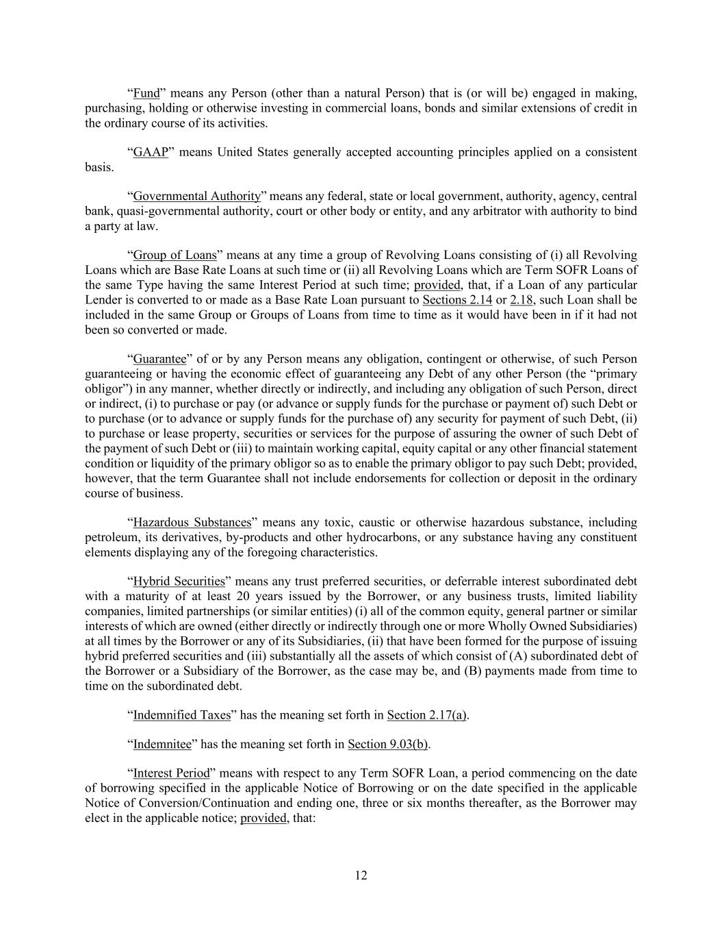 12 “Fund” means any Person (other than a natural Person) that is (or will be) engaged in making, purchasing, holding or otherwise investing in commercial loans, bonds and similar extensions of credit in the ordinary course of its activities. “GAAP” means United States generally accepted accounting principles applied on a consistent basis. “Governmental Authority” means any federal, state or local government, authority, agency, central bank, quasi-governmental authority, court or other body or entity, and any arbitrator with authority to bind a party at law. “Group of Loans” means at any time a group of Revolving Loans consisting of (i) all Revolving Loans which are Base Rate Loans at such time or (ii) all Revolving Loans which are Term SOFR Loans of the same Type having the same Interest Period at such time; provided, that, if a Loan of any particular Lender is converted to or made as a Base Rate Loan pursuant to Sections 2.14 or 2.18, such Loan shall be included in the same Group or Groups of Loans from time to time as it would have been in if it had not been so converted or made. “Guarantee” of or by any Person means any obligation, contingent or otherwise, of such Person guaranteeing or having the economic effect of guaranteeing any Debt of any other Person (the “primary obligor”) in any manner, whether directly or indirectly, and including any obligation of such Person, direct or indirect, (i) to purchase or pay (or advance or supply funds for the purchase or payment of) such Debt or to purchase (or to advance or supply funds for the purchase of) any security for payment of such Debt, (ii) to purchase or lease property, securities or services for the purpose of assuring the owner of such Debt of the payment of such Debt or (iii) to maintain working capital, equity capital or any other financial statement condition or liquidity of the primary obligor so as to enable the primary obligor to pay such Debt; provided, however, that the term Guarantee shall not include endorsements for collection or deposit in the ordinary course of business. “Hazardous Substances” means any toxic, caustic or otherwise hazardous substance, including petroleum, its derivatives, by-products and other hydrocarbons, or any substance having any constituent elements displaying any of the foregoing characteristics. “Hybrid Securities” means any trust preferred securities, or deferrable interest subordinated debt with a maturity of at least 20 years issued by the Borrower, or any business trusts, limited liability companies, limited partnerships (or similar entities) (i) all of the common equity, general partner or similar interests of which are owned (either directly or indirectly through one or more Wholly Owned Subsidiaries) at all times by the Borrower or any of its Subsidiaries, (ii) that have been formed for the purpose of issuing hybrid preferred securities and (iii) substantially all the assets of which consist of (A) subordinated debt of the Borrower or a Subsidiary of the Borrower, as the case may be, and (B) payments made from time to time on the subordinated debt. “Indemnified Taxes” has the meaning set forth in Section 2.17(a). “Indemnitee” has the meaning set forth in Section 9.03(b). “Interest Period” means with respect to any Term SOFR Loan, a period commencing on the date of borrowing specified in the applicable Notice of Borrowing or on the date specified in the applicable Notice of Conversion/Continuation and ending one, three or six months thereafter, as the Borrower may elect in the applicable notice; provided, that: