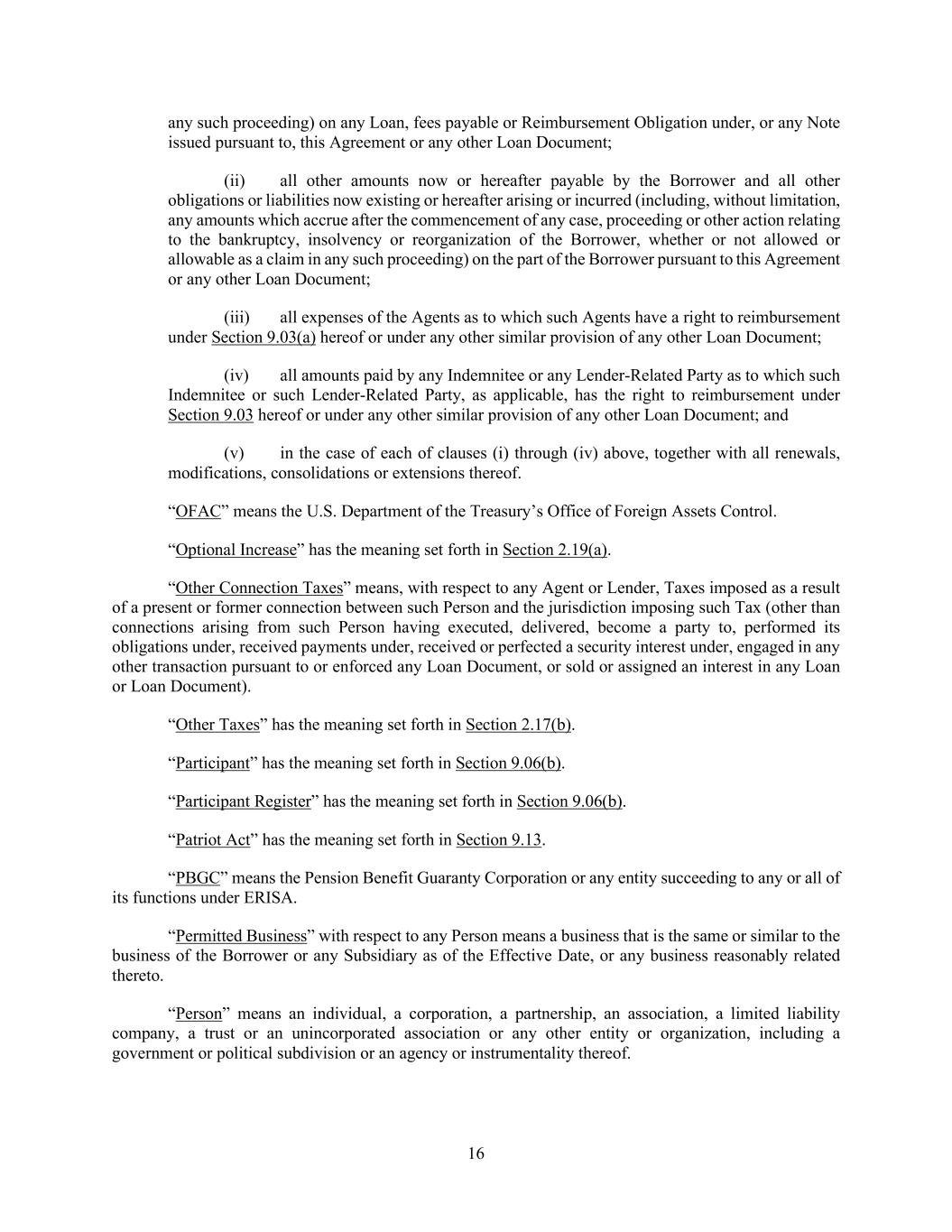 16 any such proceeding) on any Loan, fees payable or Reimbursement Obligation under, or any Note issued pursuant to, this Agreement or any other Loan Document; (ii) all other amounts now or hereafter payable by the Borrower and all other obligations or liabilities now existing or hereafter arising or incurred (including, without limitation, any amounts which accrue after the commencement of any case, proceeding or other action relating to the bankruptcy, insolvency or reorganization of the Borrower, whether or not allowed or allowable as a claim in any such proceeding) on the part of the Borrower pursuant to this Agreement or any other Loan Document; (iii) all expenses of the Agents as to which such Agents have a right to reimbursement under Section 9.03(a) hereof or under any other similar provision of any other Loan Document; (iv) all amounts paid by any Indemnitee or any Lender-Related Party as to which such Indemnitee or such Lender-Related Party, as applicable, has the right to reimbursement under Section 9.03 hereof or under any other similar provision of any other Loan Document; and (v) in the case of each of clauses (i) through (iv) above, together with all renewals, modifications, consolidations or extensions thereof. “OFAC” means the U.S. Department of the Treasury’s Office of Foreign Assets Control. “Optional Increase” has the meaning set forth in Section 2.19(a). “Other Connection Taxes” means, with respect to any Agent or Lender, Taxes imposed as a result of a present or former connection between such Person and the jurisdiction imposing such Tax (other than connections arising from such Person having executed, delivered, become a party to, performed its obligations under, received payments under, received or perfected a security interest under, engaged in any other transaction pursuant to or enforced any Loan Document, or sold or assigned an interest in any Loan or Loan Document). “Other Taxes” has the meaning set forth in Section 2.17(b). “Participant” has the meaning set forth in Section 9.06(b). “Participant Register” has the meaning set forth in Section 9.06(b). “Patriot Act” has the meaning set forth in Section 9.13. “PBGC” means the Pension Benefit Guaranty Corporation or any entity succeeding to any or all of its functions under ERISA. “Permitted Business” with respect to any Person means a business that is the same or similar to the business of the Borrower or any Subsidiary as of the Effective Date, or any business reasonably related thereto. “Person” means an individual, a corporation, a partnership, an association, a limited liability company, a trust or an unincorporated association or any other entity or organization, including a government or political subdivision or an agency or instrumentality thereof.
