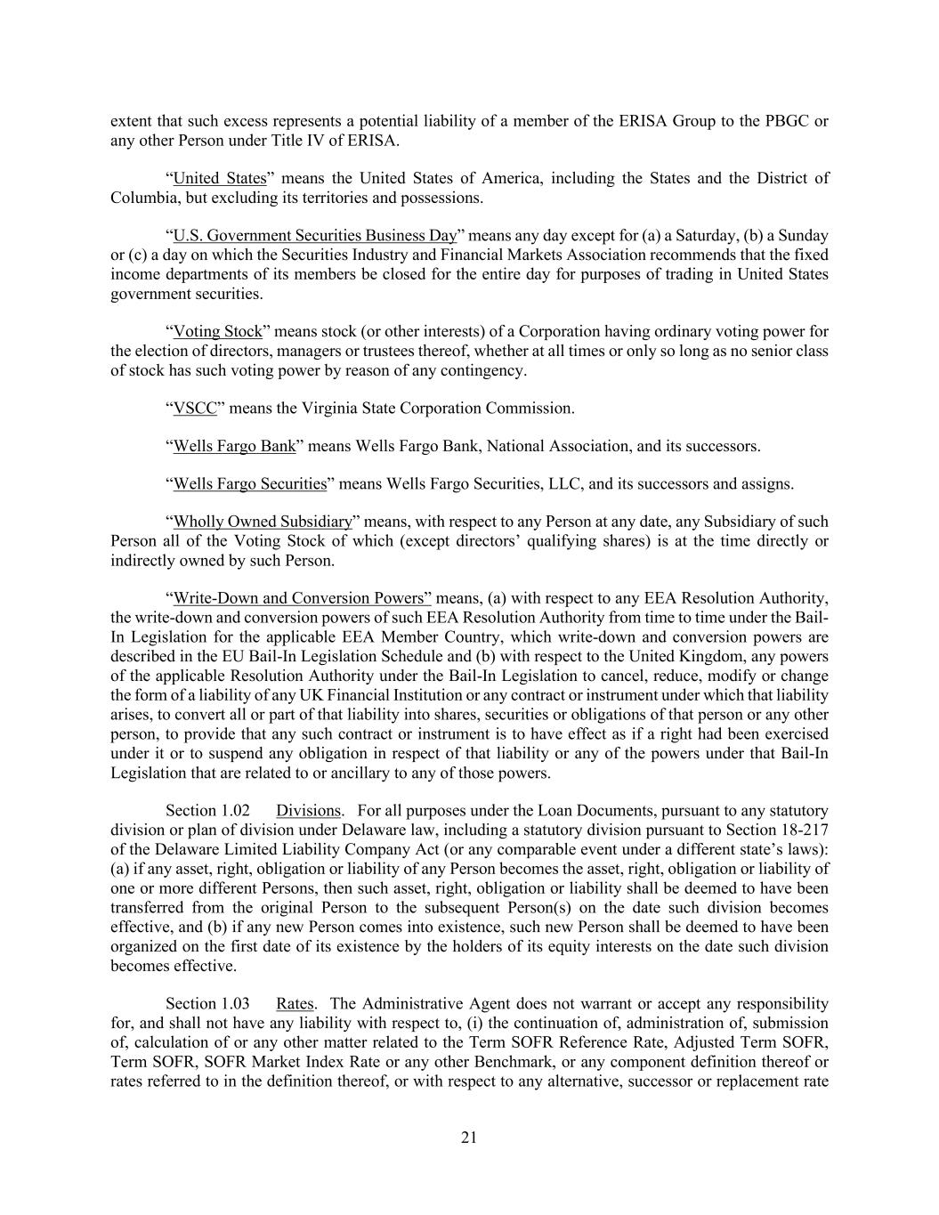 21 extent that such excess represents a potential liability of a member of the ERISA Group to the PBGC or any other Person under Title IV of ERISA. “United States” means the United States of America, including the States and the District of Columbia, but excluding its territories and possessions. “U.S. Government Securities Business Day” means any day except for (a) a Saturday, (b) a Sunday or (c) a day on which the Securities Industry and Financial Markets Association recommends that the fixed income departments of its members be closed for the entire day for purposes of trading in United States government securities. “Voting Stock” means stock (or other interests) of a Corporation having ordinary voting power for the election of directors, managers or trustees thereof, whether at all times or only so long as no senior class of stock has such voting power by reason of any contingency. “VSCC” means the Virginia State Corporation Commission. “Wells Fargo Bank” means Wells Fargo Bank, National Association, and its successors. “Wells Fargo Securities” means Wells Fargo Securities, LLC, and its successors and assigns. “Wholly Owned Subsidiary” means, with respect to any Person at any date, any Subsidiary of such Person all of the Voting Stock of which (except directors’ qualifying shares) is at the time directly or indirectly owned by such Person. “Write-Down and Conversion Powers” means, (a) with respect to any EEA Resolution Authority, the write-down and conversion powers of such EEA Resolution Authority from time to time under the Bail- In Legislation for the applicable EEA Member Country, which write-down and conversion powers are described in the EU Bail-In Legislation Schedule and (b) with respect to the United Kingdom, any powers of the applicable Resolution Authority under the Bail-In Legislation to cancel, reduce, modify or change the form of a liability of any UK Financial Institution or any contract or instrument under which that liability arises, to convert all or part of that liability into shares, securities or obligations of that person or any other person, to provide that any such contract or instrument is to have effect as if a right had been exercised under it or to suspend any obligation in respect of that liability or any of the powers under that Bail-In Legislation that are related to or ancillary to any of those powers. Section 1.02 Divisions. For all purposes under the Loan Documents, pursuant to any statutory division or plan of division under Delaware law, including a statutory division pursuant to Section 18-217 of the Delaware Limited Liability Company Act (or any comparable event under a different state’s laws): (a) if any asset, right, obligation or liability of any Person becomes the asset, right, obligation or liability of one or more different Persons, then such asset, right, obligation or liability shall be deemed to have been transferred from the original Person to the subsequent Person(s) on the date such division becomes effective, and (b) if any new Person comes into existence, such new Person shall be deemed to have been organized on the first date of its existence by the holders of its equity interests on the date such division becomes effective. Section 1.03 Rates. The Administrative Agent does not warrant or accept any responsibility for, and shall not have any liability with respect to, (i) the continuation of, administration of, submission of, calculation of or any other matter related to the Term SOFR Reference Rate, Adjusted Term SOFR, Term SOFR, SOFR Market Index Rate or any other Benchmark, or any component definition thereof or rates referred to in the definition thereof, or with respect to any alternative, successor or replacement rate