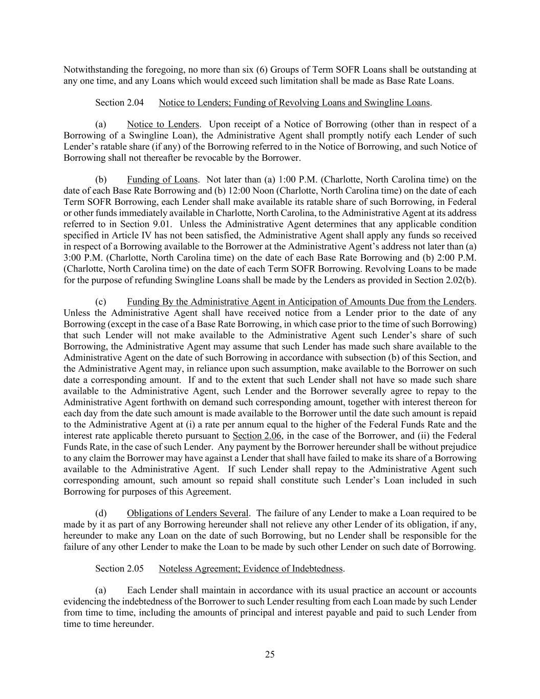 25 Notwithstanding the foregoing, no more than six (6) Groups of Term SOFR Loans shall be outstanding at any one time, and any Loans which would exceed such limitation shall be made as Base Rate Loans. Section 2.04 Notice to Lenders; Funding of Revolving Loans and Swingline Loans. (a) Notice to Lenders. Upon receipt of a Notice of Borrowing (other than in respect of a Borrowing of a Swingline Loan), the Administrative Agent shall promptly notify each Lender of such Lender’s ratable share (if any) of the Borrowing referred to in the Notice of Borrowing, and such Notice of Borrowing shall not thereafter be revocable by the Borrower. (b) Funding of Loans. Not later than (a) 1:00 P.M. (Charlotte, North Carolina time) on the date of each Base Rate Borrowing and (b) 12:00 Noon (Charlotte, North Carolina time) on the date of each Term SOFR Borrowing, each Lender shall make available its ratable share of such Borrowing, in Federal or other funds immediately available in Charlotte, North Carolina, to the Administrative Agent at its address referred to in Section 9.01. Unless the Administrative Agent determines that any applicable condition specified in Article IV has not been satisfied, the Administrative Agent shall apply any funds so received in respect of a Borrowing available to the Borrower at the Administrative Agent’s address not later than (a) 3:00 P.M. (Charlotte, North Carolina time) on the date of each Base Rate Borrowing and (b) 2:00 P.M. (Charlotte, North Carolina time) on the date of each Term SOFR Borrowing. Revolving Loans to be made for the purpose of refunding Swingline Loans shall be made by the Lenders as provided in Section 2.02(b). (c) Funding By the Administrative Agent in Anticipation of Amounts Due from the Lenders. Unless the Administrative Agent shall have received notice from a Lender prior to the date of any Borrowing (except in the case of a Base Rate Borrowing, in which case prior to the time of such Borrowing) that such Lender will not make available to the Administrative Agent such Lender’s share of such Borrowing, the Administrative Agent may assume that such Lender has made such share available to the Administrative Agent on the date of such Borrowing in accordance with subsection (b) of this Section, and the Administrative Agent may, in reliance upon such assumption, make available to the Borrower on such date a corresponding amount. If and to the extent that such Lender shall not have so made such share available to the Administrative Agent, such Lender and the Borrower severally agree to repay to the Administrative Agent forthwith on demand such corresponding amount, together with interest thereon for each day from the date such amount is made available to the Borrower until the date such amount is repaid to the Administrative Agent at (i) a rate per annum equal to the higher of the Federal Funds Rate and the interest rate applicable thereto pursuant to Section 2.06, in the case of the Borrower, and (ii) the Federal Funds Rate, in the case of such Lender. Any payment by the Borrower hereunder shall be without prejudice to any claim the Borrower may have against a Lender that shall have failed to make its share of a Borrowing available to the Administrative Agent. If such Lender shall repay to the Administrative Agent such corresponding amount, such amount so repaid shall constitute such Lender’s Loan included in such Borrowing for purposes of this Agreement. (d) Obligations of Lenders Several. The failure of any Lender to make a Loan required to be made by it as part of any Borrowing hereunder shall not relieve any other Lender of its obligation, if any, hereunder to make any Loan on the date of such Borrowing, but no Lender shall be responsible for the failure of any other Lender to make the Loan to be made by such other Lender on such date of Borrowing. Section 2.05 Noteless Agreement; Evidence of Indebtedness. (a) Each Lender shall maintain in accordance with its usual practice an account or accounts evidencing the indebtedness of the Borrower to such Lender resulting from each Loan made by such Lender from time to time, including the amounts of principal and interest payable and paid to such Lender from time to time hereunder.