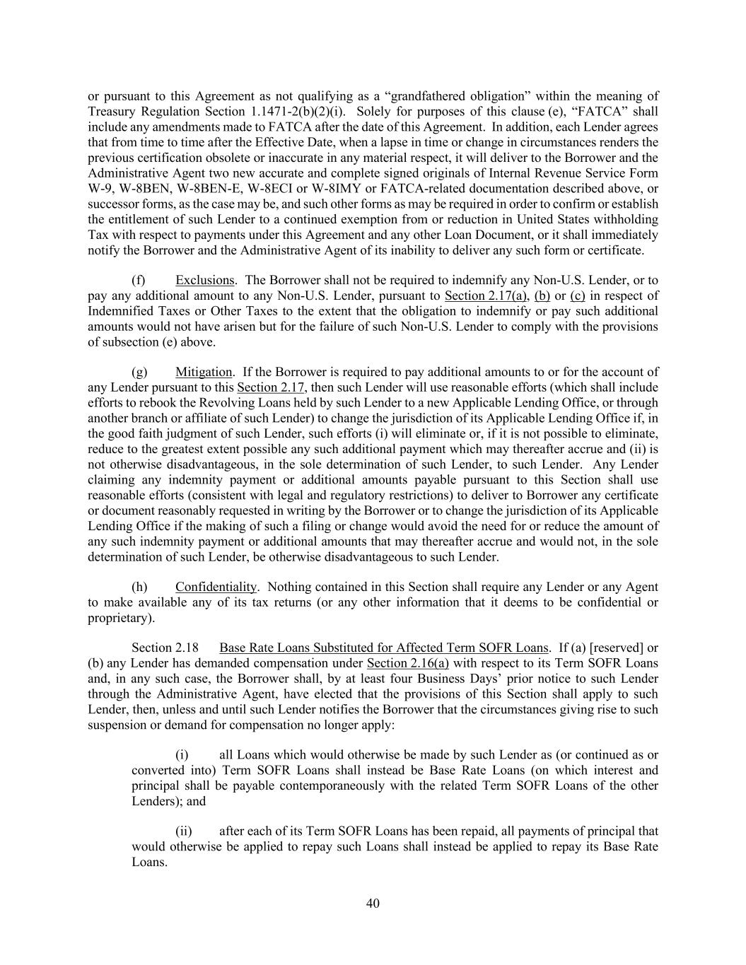 40 or pursuant to this Agreement as not qualifying as a “grandfathered obligation” within the meaning of Treasury Regulation Section 1.1471-2(b)(2)(i). Solely for purposes of this clause (e), “FATCA” shall include any amendments made to FATCA after the date of this Agreement. In addition, each Lender agrees that from time to time after the Effective Date, when a lapse in time or change in circumstances renders the previous certification obsolete or inaccurate in any material respect, it will deliver to the Borrower and the Administrative Agent two new accurate and complete signed originals of Internal Revenue Service Form W-9, W-8BEN, W-8BEN-E, W-8ECI or W-8IMY or FATCA-related documentation described above, or successor forms, as the case may be, and such other forms as may be required in order to confirm or establish the entitlement of such Lender to a continued exemption from or reduction in United States withholding Tax with respect to payments under this Agreement and any other Loan Document, or it shall immediately notify the Borrower and the Administrative Agent of its inability to deliver any such form or certificate. (f) Exclusions. The Borrower shall not be required to indemnify any Non-U.S. Lender, or to pay any additional amount to any Non-U.S. Lender, pursuant to Section 2.17(a), (b) or (c) in respect of Indemnified Taxes or Other Taxes to the extent that the obligation to indemnify or pay such additional amounts would not have arisen but for the failure of such Non-U.S. Lender to comply with the provisions of subsection (e) above. (g) Mitigation. If the Borrower is required to pay additional amounts to or for the account of any Lender pursuant to this Section 2.17, then such Lender will use reasonable efforts (which shall include efforts to rebook the Revolving Loans held by such Lender to a new Applicable Lending Office, or through another branch or affiliate of such Lender) to change the jurisdiction of its Applicable Lending Office if, in the good faith judgment of such Lender, such efforts (i) will eliminate or, if it is not possible to eliminate, reduce to the greatest extent possible any such additional payment which may thereafter accrue and (ii) is not otherwise disadvantageous, in the sole determination of such Lender, to such Lender. Any Lender claiming any indemnity payment or additional amounts payable pursuant to this Section shall use reasonable efforts (consistent with legal and regulatory restrictions) to deliver to Borrower any certificate or document reasonably requested in writing by the Borrower or to change the jurisdiction of its Applicable Lending Office if the making of such a filing or change would avoid the need for or reduce the amount of any such indemnity payment or additional amounts that may thereafter accrue and would not, in the sole determination of such Lender, be otherwise disadvantageous to such Lender. (h) Confidentiality. Nothing contained in this Section shall require any Lender or any Agent to make available any of its tax returns (or any other information that it deems to be confidential or proprietary). Section 2.18 Base Rate Loans Substituted for Affected Term SOFR Loans. If (a) [reserved] or (b) any Lender has demanded compensation under Section 2.16(a) with respect to its Term SOFR Loans and, in any such case, the Borrower shall, by at least four Business Days’ prior notice to such Lender through the Administrative Agent, have elected that the provisions of this Section shall apply to such Lender, then, unless and until such Lender notifies the Borrower that the circumstances giving rise to such suspension or demand for compensation no longer apply: (i) all Loans which would otherwise be made by such Lender as (or continued as or converted into) Term SOFR Loans shall instead be Base Rate Loans (on which interest and principal shall be payable contemporaneously with the related Term SOFR Loans of the other Lenders); and (ii) after each of its Term SOFR Loans has been repaid, all payments of principal that would otherwise be applied to repay such Loans shall instead be applied to repay its Base Rate Loans.