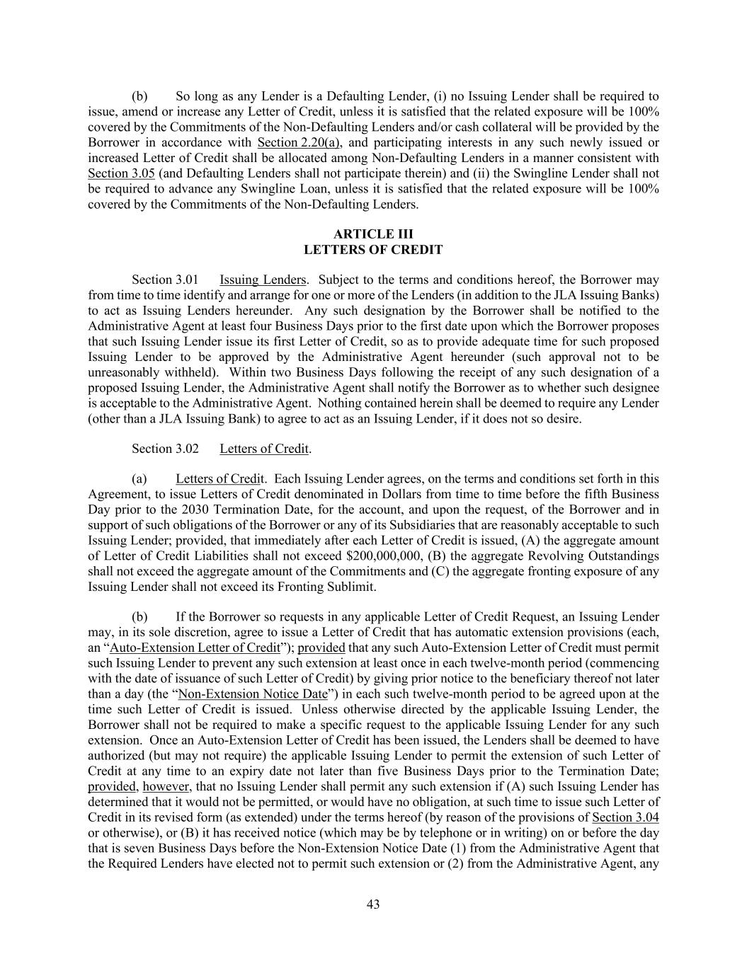 43 (b) So long as any Lender is a Defaulting Lender, (i) no Issuing Lender shall be required to issue, amend or increase any Letter of Credit, unless it is satisfied that the related exposure will be 100% covered by the Commitments of the Non-Defaulting Lenders and/or cash collateral will be provided by the Borrower in accordance with Section 2.20(a), and participating interests in any such newly issued or increased Letter of Credit shall be allocated among Non-Defaulting Lenders in a manner consistent with Section 3.05 (and Defaulting Lenders shall not participate therein) and (ii) the Swingline Lender shall not be required to advance any Swingline Loan, unless it is satisfied that the related exposure will be 100% covered by the Commitments of the Non-Defaulting Lenders. ARTICLE III LETTERS OF CREDIT Section 3.01 Issuing Lenders. Subject to the terms and conditions hereof, the Borrower may from time to time identify and arrange for one or more of the Lenders (in addition to the JLA Issuing Banks) to act as Issuing Lenders hereunder. Any such designation by the Borrower shall be notified to the Administrative Agent at least four Business Days prior to the first date upon which the Borrower proposes that such Issuing Lender issue its first Letter of Credit, so as to provide adequate time for such proposed Issuing Lender to be approved by the Administrative Agent hereunder (such approval not to be unreasonably withheld). Within two Business Days following the receipt of any such designation of a proposed Issuing Lender, the Administrative Agent shall notify the Borrower as to whether such designee is acceptable to the Administrative Agent. Nothing contained herein shall be deemed to require any Lender (other than a JLA Issuing Bank) to agree to act as an Issuing Lender, if it does not so desire. Section 3.02 Letters of Credit. (a) Letters of Credit. Each Issuing Lender agrees, on the terms and conditions set forth in this Agreement, to issue Letters of Credit denominated in Dollars from time to time before the fifth Business Day prior to the 2030 Termination Date, for the account, and upon the request, of the Borrower and in support of such obligations of the Borrower or any of its Subsidiaries that are reasonably acceptable to such Issuing Lender; provided, that immediately after each Letter of Credit is issued, (A) the aggregate amount of Letter of Credit Liabilities shall not exceed $200,000,000, (B) the aggregate Revolving Outstandings shall not exceed the aggregate amount of the Commitments and (C) the aggregate fronting exposure of any Issuing Lender shall not exceed its Fronting Sublimit. (b) If the Borrower so requests in any applicable Letter of Credit Request, an Issuing Lender may, in its sole discretion, agree to issue a Letter of Credit that has automatic extension provisions (each, an “Auto-Extension Letter of Credit”); provided that any such Auto-Extension Letter of Credit must permit such Issuing Lender to prevent any such extension at least once in each twelve-month period (commencing with the date of issuance of such Letter of Credit) by giving prior notice to the beneficiary thereof not later than a day (the “Non-Extension Notice Date”) in each such twelve-month period to be agreed upon at the time such Letter of Credit is issued. Unless otherwise directed by the applicable Issuing Lender, the Borrower shall not be required to make a specific request to the applicable Issuing Lender for any such extension. Once an Auto-Extension Letter of Credit has been issued, the Lenders shall be deemed to have authorized (but may not require) the applicable Issuing Lender to permit the extension of such Letter of Credit at any time to an expiry date not later than five Business Days prior to the Termination Date; provided, however, that no Issuing Lender shall permit any such extension if (A) such Issuing Lender has determined that it would not be permitted, or would have no obligation, at such time to issue such Letter of Credit in its revised form (as extended) under the terms hereof (by reason of the provisions of Section 3.04 or otherwise), or (B) it has received notice (which may be by telephone or in writing) on or before the day that is seven Business Days before the Non-Extension Notice Date (1) from the Administrative Agent that the Required Lenders have elected not to permit such extension or (2) from the Administrative Agent, any