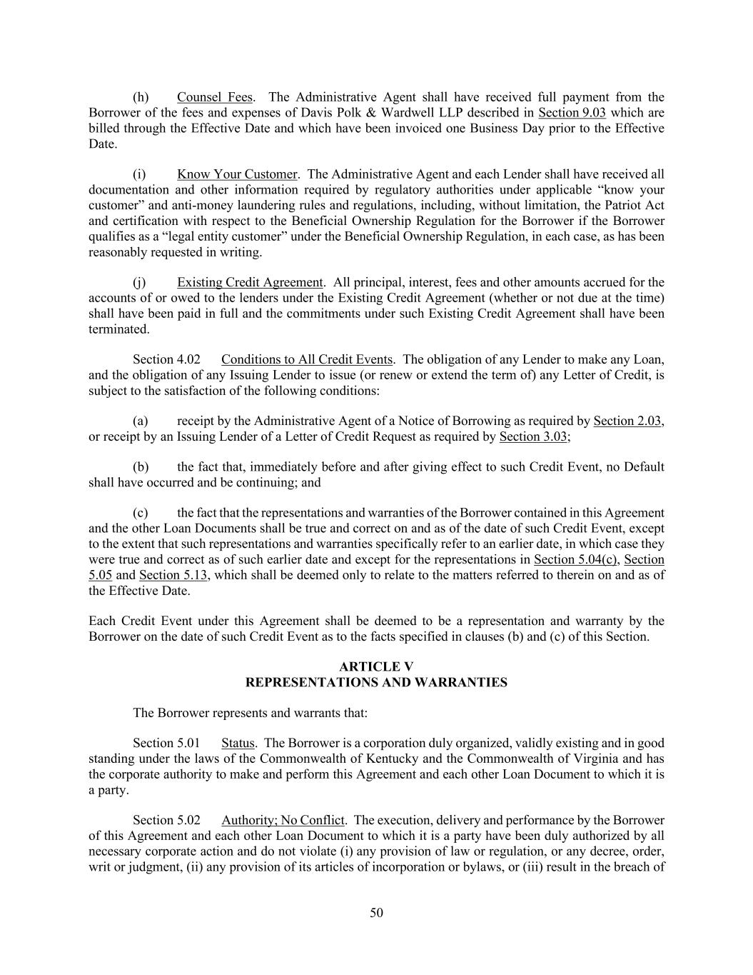 50 (h) Counsel Fees. The Administrative Agent shall have received full payment from the Borrower of the fees and expenses of Davis Polk & Wardwell LLP described in Section 9.03 which are billed through the Effective Date and which have been invoiced one Business Day prior to the Effective Date. (i) Know Your Customer. The Administrative Agent and each Lender shall have received all documentation and other information required by regulatory authorities under applicable “know your customer” and anti-money laundering rules and regulations, including, without limitation, the Patriot Act and certification with respect to the Beneficial Ownership Regulation for the Borrower if the Borrower qualifies as a “legal entity customer” under the Beneficial Ownership Regulation, in each case, as has been reasonably requested in writing. (j) Existing Credit Agreement. All principal, interest, fees and other amounts accrued for the accounts of or owed to the lenders under the Existing Credit Agreement (whether or not due at the time) shall have been paid in full and the commitments under such Existing Credit Agreement shall have been terminated. Section 4.02 Conditions to All Credit Events. The obligation of any Lender to make any Loan, and the obligation of any Issuing Lender to issue (or renew or extend the term of) any Letter of Credit, is subject to the satisfaction of the following conditions: (a) receipt by the Administrative Agent of a Notice of Borrowing as required by Section 2.03, or receipt by an Issuing Lender of a Letter of Credit Request as required by Section 3.03; (b) the fact that, immediately before and after giving effect to such Credit Event, no Default shall have occurred and be continuing; and (c) the fact that the representations and warranties of the Borrower contained in this Agreement and the other Loan Documents shall be true and correct on and as of the date of such Credit Event, except to the extent that such representations and warranties specifically refer to an earlier date, in which case they were true and correct as of such earlier date and except for the representations in Section 5.04(c), Section 5.05 and Section 5.13, which shall be deemed only to relate to the matters referred to therein on and as of the Effective Date. Each Credit Event under this Agreement shall be deemed to be a representation and warranty by the Borrower on the date of such Credit Event as to the facts specified in clauses (b) and (c) of this Section. ARTICLE V REPRESENTATIONS AND WARRANTIES The Borrower represents and warrants that: Section 5.01 Status. The Borrower is a corporation duly organized, validly existing and in good standing under the laws of the Commonwealth of Kentucky and the Commonwealth of Virginia and has the corporate authority to make and perform this Agreement and each other Loan Document to which it is a party. Section 5.02 Authority; No Conflict. The execution, delivery and performance by the Borrower of this Agreement and each other Loan Document to which it is a party have been duly authorized by all necessary corporate action and do not violate (i) any provision of law or regulation, or any decree, order, writ or judgment, (ii) any provision of its articles of incorporation or bylaws, or (iii) result in the breach of