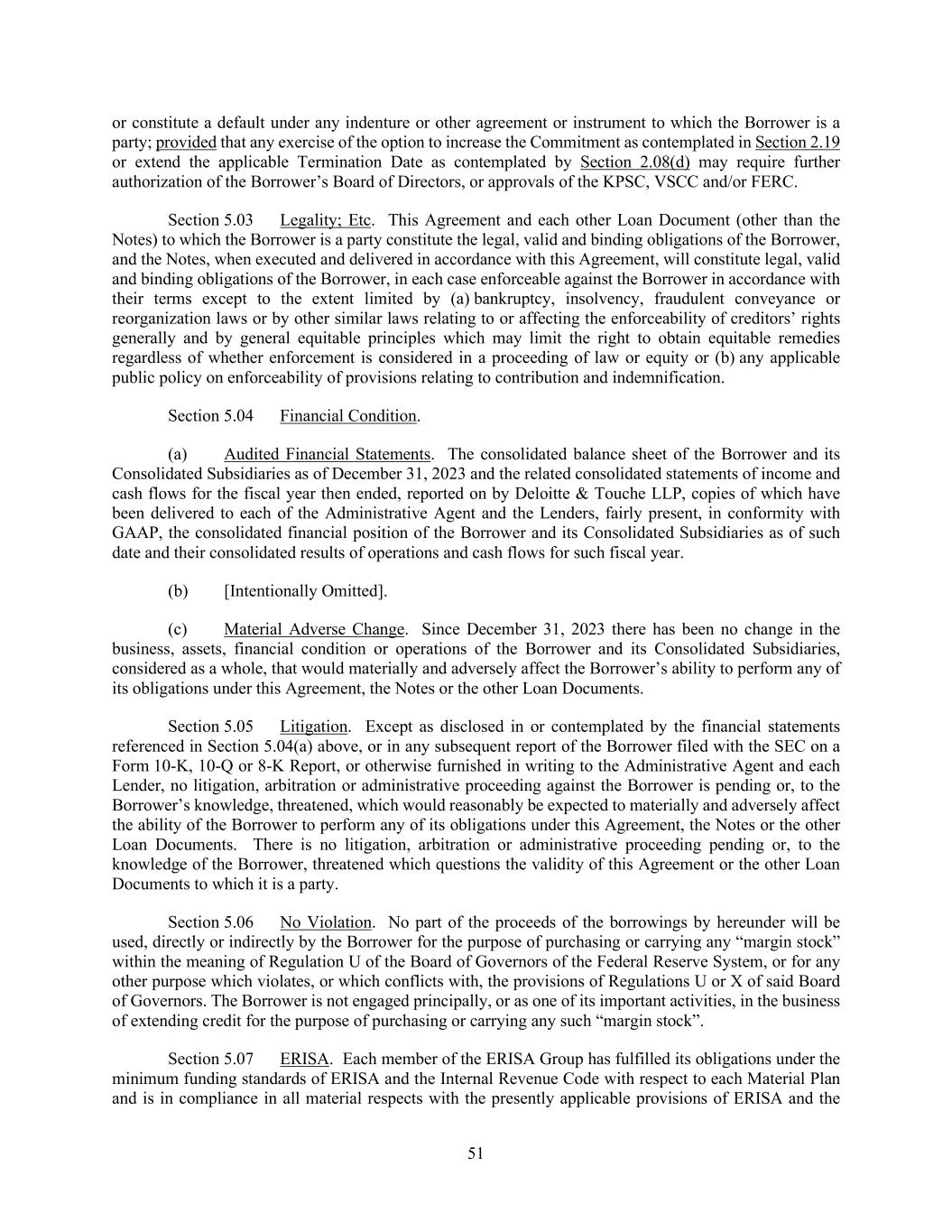 51 or constitute a default under any indenture or other agreement or instrument to which the Borrower is a party; provided that any exercise of the option to increase the Commitment as contemplated in Section 2.19 or extend the applicable Termination Date as contemplated by Section 2.08(d) may require further authorization of the Borrower’s Board of Directors, or approvals of the KPSC, VSCC and/or FERC. Section 5.03 Legality; Etc. This Agreement and each other Loan Document (other than the Notes) to which the Borrower is a party constitute the legal, valid and binding obligations of the Borrower, and the Notes, when executed and delivered in accordance with this Agreement, will constitute legal, valid and binding obligations of the Borrower, in each case enforceable against the Borrower in accordance with their terms except to the extent limited by (a) bankruptcy, insolvency, fraudulent conveyance or reorganization laws or by other similar laws relating to or affecting the enforceability of creditors’ rights generally and by general equitable principles which may limit the right to obtain equitable remedies regardless of whether enforcement is considered in a proceeding of law or equity or (b) any applicable public policy on enforceability of provisions relating to contribution and indemnification. Section 5.04 Financial Condition. (a) Audited Financial Statements. The consolidated balance sheet of the Borrower and its Consolidated Subsidiaries as of December 31, 2023 and the related consolidated statements of income and cash flows for the fiscal year then ended, reported on by Deloitte & Touche LLP, copies of which have been delivered to each of the Administrative Agent and the Lenders, fairly present, in conformity with GAAP, the consolidated financial position of the Borrower and its Consolidated Subsidiaries as of such date and their consolidated results of operations and cash flows for such fiscal year. (b) [Intentionally Omitted]. (c) Material Adverse Change. Since December 31, 2023 there has been no change in the business, assets, financial condition or operations of the Borrower and its Consolidated Subsidiaries, considered as a whole, that would materially and adversely affect the Borrower’s ability to perform any of its obligations under this Agreement, the Notes or the other Loan Documents. Section 5.05 Litigation. Except as disclosed in or contemplated by the financial statements referenced in Section 5.04(a) above, or in any subsequent report of the Borrower filed with the SEC on a Form 10-K, 10-Q or 8-K Report, or otherwise furnished in writing to the Administrative Agent and each Lender, no litigation, arbitration or administrative proceeding against the Borrower is pending or, to the Borrower’s knowledge, threatened, which would reasonably be expected to materially and adversely affect the ability of the Borrower to perform any of its obligations under this Agreement, the Notes or the other Loan Documents. There is no litigation, arbitration or administrative proceeding pending or, to the knowledge of the Borrower, threatened which questions the validity of this Agreement or the other Loan Documents to which it is a party. Section 5.06 No Violation. No part of the proceeds of the borrowings by hereunder will be used, directly or indirectly by the Borrower for the purpose of purchasing or carrying any “margin stock” within the meaning of Regulation U of the Board of Governors of the Federal Reserve System, or for any other purpose which violates, or which conflicts with, the provisions of Regulations U or X of said Board of Governors. The Borrower is not engaged principally, or as one of its important activities, in the business of extending credit for the purpose of purchasing or carrying any such “margin stock”. Section 5.07 ERISA. Each member of the ERISA Group has fulfilled its obligations under the minimum funding standards of ERISA and the Internal Revenue Code with respect to each Material Plan and is in compliance in all material respects with the presently applicable provisions of ERISA and the
