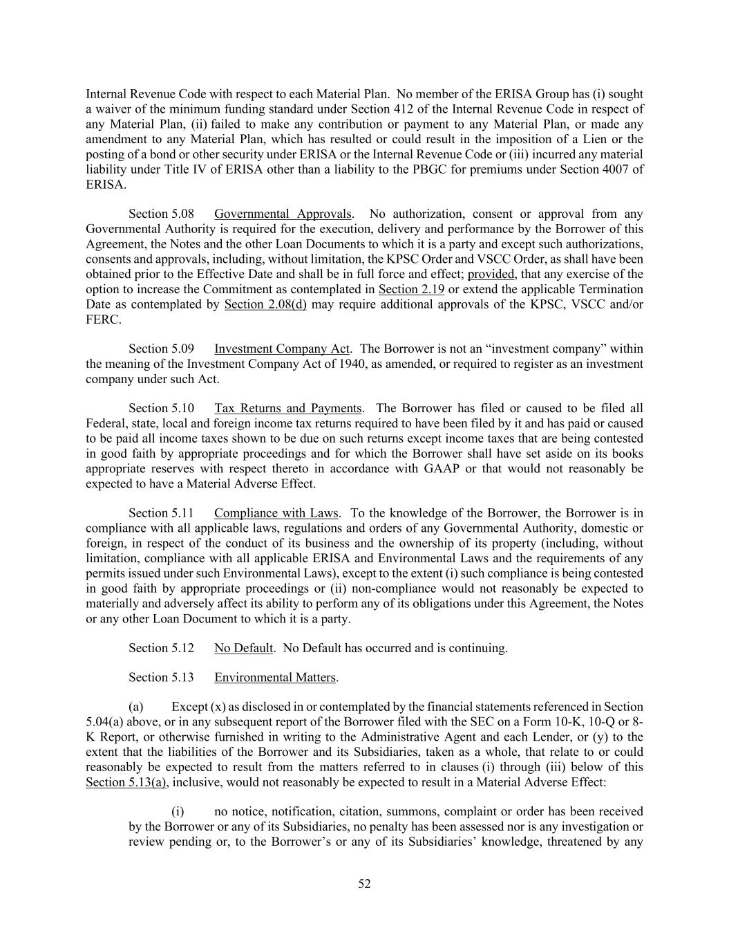 52 Internal Revenue Code with respect to each Material Plan. No member of the ERISA Group has (i) sought a waiver of the minimum funding standard under Section 412 of the Internal Revenue Code in respect of any Material Plan, (ii) failed to make any contribution or payment to any Material Plan, or made any amendment to any Material Plan, which has resulted or could result in the imposition of a Lien or the posting of a bond or other security under ERISA or the Internal Revenue Code or (iii) incurred any material liability under Title IV of ERISA other than a liability to the PBGC for premiums under Section 4007 of ERISA. Section 5.08 Governmental Approvals. No authorization, consent or approval from any Governmental Authority is required for the execution, delivery and performance by the Borrower of this Agreement, the Notes and the other Loan Documents to which it is a party and except such authorizations, consents and approvals, including, without limitation, the KPSC Order and VSCC Order, as shall have been obtained prior to the Effective Date and shall be in full force and effect; provided, that any exercise of the option to increase the Commitment as contemplated in Section 2.19 or extend the applicable Termination Date as contemplated by Section 2.08(d) may require additional approvals of the KPSC, VSCC and/or FERC. Section 5.09 Investment Company Act. The Borrower is not an “investment company” within the meaning of the Investment Company Act of 1940, as amended, or required to register as an investment company under such Act. Section 5.10 Tax Returns and Payments. The Borrower has filed or caused to be filed all Federal, state, local and foreign income tax returns required to have been filed by it and has paid or caused to be paid all income taxes shown to be due on such returns except income taxes that are being contested in good faith by appropriate proceedings and for which the Borrower shall have set aside on its books appropriate reserves with respect thereto in accordance with GAAP or that would not reasonably be expected to have a Material Adverse Effect. Section 5.11 Compliance with Laws. To the knowledge of the Borrower, the Borrower is in compliance with all applicable laws, regulations and orders of any Governmental Authority, domestic or foreign, in respect of the conduct of its business and the ownership of its property (including, without limitation, compliance with all applicable ERISA and Environmental Laws and the requirements of any permits issued under such Environmental Laws), except to the extent (i) such compliance is being contested in good faith by appropriate proceedings or (ii) non-compliance would not reasonably be expected to materially and adversely affect its ability to perform any of its obligations under this Agreement, the Notes or any other Loan Document to which it is a party. Section 5.12 No Default. No Default has occurred and is continuing. Section 5.13 Environmental Matters. (a) Except (x) as disclosed in or contemplated by the financial statements referenced in Section 5.04(a) above, or in any subsequent report of the Borrower filed with the SEC on a Form 10-K, 10-Q or 8- K Report, or otherwise furnished in writing to the Administrative Agent and each Lender, or (y) to the extent that the liabilities of the Borrower and its Subsidiaries, taken as a whole, that relate to or could reasonably be expected to result from the matters referred to in clauses (i) through (iii) below of this Section 5.13(a), inclusive, would not reasonably be expected to result in a Material Adverse Effect: (i) no notice, notification, citation, summons, complaint or order has been received by the Borrower or any of its Subsidiaries, no penalty has been assessed nor is any investigation or review pending or, to the Borrower’s or any of its Subsidiaries’ knowledge, threatened by any