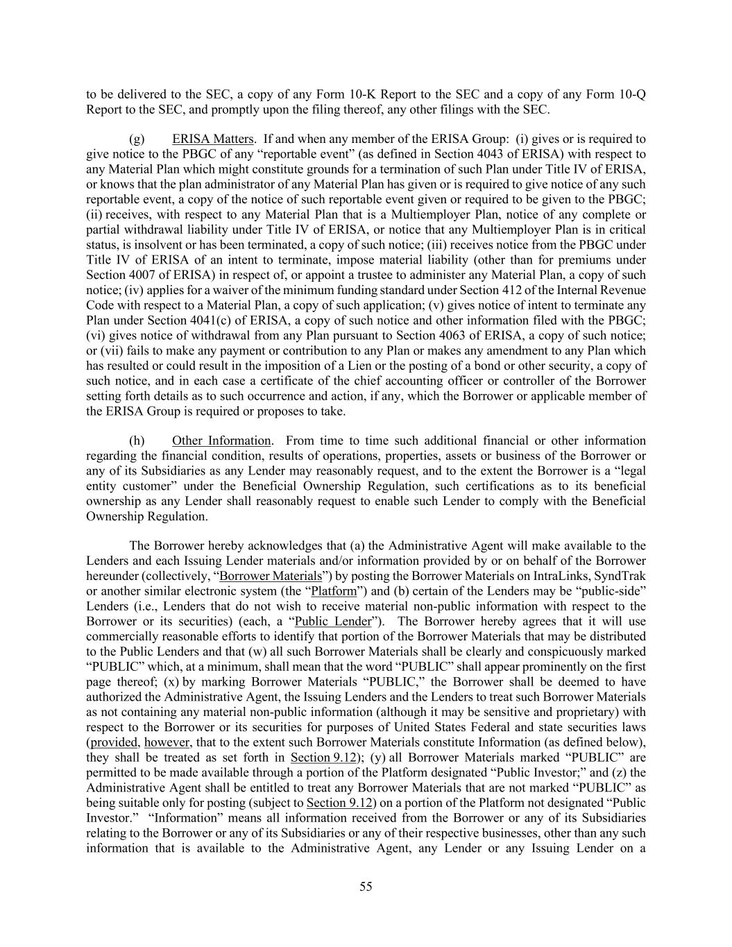 55 to be delivered to the SEC, a copy of any Form 10-K Report to the SEC and a copy of any Form 10-Q Report to the SEC, and promptly upon the filing thereof, any other filings with the SEC. (g) ERISA Matters. If and when any member of the ERISA Group: (i) gives or is required to give notice to the PBGC of any “reportable event” (as defined in Section 4043 of ERISA) with respect to any Material Plan which might constitute grounds for a termination of such Plan under Title IV of ERISA, or knows that the plan administrator of any Material Plan has given or is required to give notice of any such reportable event, a copy of the notice of such reportable event given or required to be given to the PBGC; (ii) receives, with respect to any Material Plan that is a Multiemployer Plan, notice of any complete or partial withdrawal liability under Title IV of ERISA, or notice that any Multiemployer Plan is in critical status, is insolvent or has been terminated, a copy of such notice; (iii) receives notice from the PBGC under Title IV of ERISA of an intent to terminate, impose material liability (other than for premiums under Section 4007 of ERISA) in respect of, or appoint a trustee to administer any Material Plan, a copy of such notice; (iv) applies for a waiver of the minimum funding standard under Section 412 of the Internal Revenue Code with respect to a Material Plan, a copy of such application; (v) gives notice of intent to terminate any Plan under Section 4041(c) of ERISA, a copy of such notice and other information filed with the PBGC; (vi) gives notice of withdrawal from any Plan pursuant to Section 4063 of ERISA, a copy of such notice; or (vii) fails to make any payment or contribution to any Plan or makes any amendment to any Plan which has resulted or could result in the imposition of a Lien or the posting of a bond or other security, a copy of such notice, and in each case a certificate of the chief accounting officer or controller of the Borrower setting forth details as to such occurrence and action, if any, which the Borrower or applicable member of the ERISA Group is required or proposes to take. (h) Other Information. From time to time such additional financial or other information regarding the financial condition, results of operations, properties, assets or business of the Borrower or any of its Subsidiaries as any Lender may reasonably request, and to the extent the Borrower is a “legal entity customer” under the Beneficial Ownership Regulation, such certifications as to its beneficial ownership as any Lender shall reasonably request to enable such Lender to comply with the Beneficial Ownership Regulation. The Borrower hereby acknowledges that (a) the Administrative Agent will make available to the Lenders and each Issuing Lender materials and/or information provided by or on behalf of the Borrower hereunder (collectively, “Borrower Materials”) by posting the Borrower Materials on IntraLinks, SyndTrak or another similar electronic system (the “Platform”) and (b) certain of the Lenders may be “public-side” Lenders (i.e., Lenders that do not wish to receive material non-public information with respect to the Borrower or its securities) (each, a “Public Lender”). The Borrower hereby agrees that it will use commercially reasonable efforts to identify that portion of the Borrower Materials that may be distributed to the Public Lenders and that (w) all such Borrower Materials shall be clearly and conspicuously marked “PUBLIC” which, at a minimum, shall mean that the word “PUBLIC” shall appear prominently on the first page thereof; (x) by marking Borrower Materials “PUBLIC,” the Borrower shall be deemed to have authorized the Administrative Agent, the Issuing Lenders and the Lenders to treat such Borrower Materials as not containing any material non-public information (although it may be sensitive and proprietary) with respect to the Borrower or its securities for purposes of United States Federal and state securities laws (provided, however, that to the extent such Borrower Materials constitute Information (as defined below), they shall be treated as set forth in Section 9.12); (y) all Borrower Materials marked “PUBLIC” are permitted to be made available through a portion of the Platform designated “Public Investor;” and (z) the Administrative Agent shall be entitled to treat any Borrower Materials that are not marked “PUBLIC” as being suitable only for posting (subject to Section 9.12) on a portion of the Platform not designated “Public Investor.” “Information” means all information received from the Borrower or any of its Subsidiaries relating to the Borrower or any of its Subsidiaries or any of their respective businesses, other than any such information that is available to the Administrative Agent, any Lender or any Issuing Lender on a