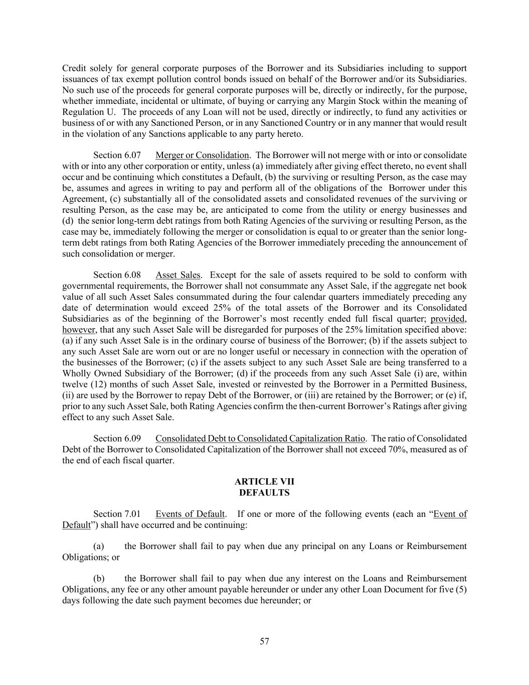 57 Credit solely for general corporate purposes of the Borrower and its Subsidiaries including to support issuances of tax exempt pollution control bonds issued on behalf of the Borrower and/or its Subsidiaries. No such use of the proceeds for general corporate purposes will be, directly or indirectly, for the purpose, whether immediate, incidental or ultimate, of buying or carrying any Margin Stock within the meaning of Regulation U. The proceeds of any Loan will not be used, directly or indirectly, to fund any activities or business of or with any Sanctioned Person, or in any Sanctioned Country or in any manner that would result in the violation of any Sanctions applicable to any party hereto. Section 6.07 Merger or Consolidation. The Borrower will not merge with or into or consolidate with or into any other corporation or entity, unless (a) immediately after giving effect thereto, no event shall occur and be continuing which constitutes a Default, (b) the surviving or resulting Person, as the case may be, assumes and agrees in writing to pay and perform all of the obligations of the Borrower under this Agreement, (c) substantially all of the consolidated assets and consolidated revenues of the surviving or resulting Person, as the case may be, are anticipated to come from the utility or energy businesses and (d) the senior long-term debt ratings from both Rating Agencies of the surviving or resulting Person, as the case may be, immediately following the merger or consolidation is equal to or greater than the senior long- term debt ratings from both Rating Agencies of the Borrower immediately preceding the announcement of such consolidation or merger. Section 6.08 Asset Sales. Except for the sale of assets required to be sold to conform with governmental requirements, the Borrower shall not consummate any Asset Sale, if the aggregate net book value of all such Asset Sales consummated during the four calendar quarters immediately preceding any date of determination would exceed 25% of the total assets of the Borrower and its Consolidated Subsidiaries as of the beginning of the Borrower’s most recently ended full fiscal quarter; provided, however, that any such Asset Sale will be disregarded for purposes of the 25% limitation specified above: (a) if any such Asset Sale is in the ordinary course of business of the Borrower; (b) if the assets subject to any such Asset Sale are worn out or are no longer useful or necessary in connection with the operation of the businesses of the Borrower; (c) if the assets subject to any such Asset Sale are being transferred to a Wholly Owned Subsidiary of the Borrower; (d) if the proceeds from any such Asset Sale (i) are, within twelve (12) months of such Asset Sale, invested or reinvested by the Borrower in a Permitted Business, (ii) are used by the Borrower to repay Debt of the Borrower, or (iii) are retained by the Borrower; or (e) if, prior to any such Asset Sale, both Rating Agencies confirm the then-current Borrower’s Ratings after giving effect to any such Asset Sale. Section 6.09 Consolidated Debt to Consolidated Capitalization Ratio. The ratio of Consolidated Debt of the Borrower to Consolidated Capitalization of the Borrower shall not exceed 70%, measured as of the end of each fiscal quarter. ARTICLE VII DEFAULTS Section 7.01 Events of Default. If one or more of the following events (each an “Event of Default”) shall have occurred and be continuing: (a) the Borrower shall fail to pay when due any principal on any Loans or Reimbursement Obligations; or (b) the Borrower shall fail to pay when due any interest on the Loans and Reimbursement Obligations, any fee or any other amount payable hereunder or under any other Loan Document for five (5) days following the date such payment becomes due hereunder; or