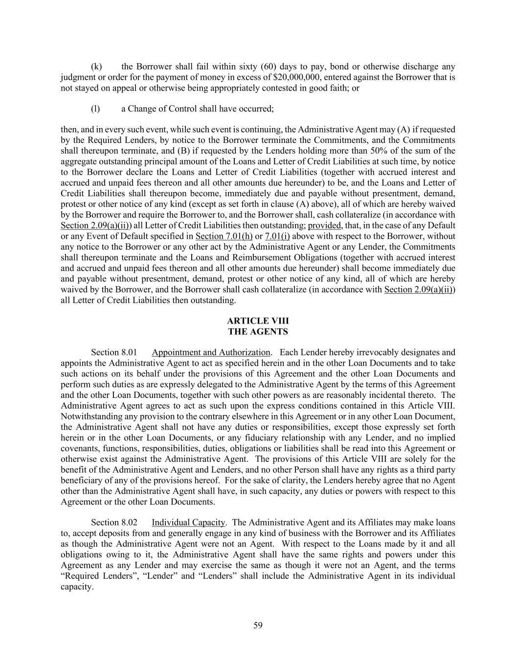 59 (k) the Borrower shall fail within sixty (60) days to pay, bond or otherwise discharge any judgment or order for the payment of money in excess of $20,000,000, entered against the Borrower that is not stayed on appeal or otherwise being appropriately contested in good faith; or (l) a Change of Control shall have occurred; then, and in every such event, while such event is continuing, the Administrative Agent may (A) if requested by the Required Lenders, by notice to the Borrower terminate the Commitments, and the Commitments shall thereupon terminate, and (B) if requested by the Lenders holding more than 50% of the sum of the aggregate outstanding principal amount of the Loans and Letter of Credit Liabilities at such time, by notice to the Borrower declare the Loans and Letter of Credit Liabilities (together with accrued interest and accrued and unpaid fees thereon and all other amounts due hereunder) to be, and the Loans and Letter of Credit Liabilities shall thereupon become, immediately due and payable without presentment, demand, protest or other notice of any kind (except as set forth in clause (A) above), all of which are hereby waived by the Borrower and require the Borrower to, and the Borrower shall, cash collateralize (in accordance with Section 2.09(a)(ii)) all Letter of Credit Liabilities then outstanding; provided, that, in the case of any Default or any Event of Default specified in Section 7.01(h) or 7.01(i) above with respect to the Borrower, without any notice to the Borrower or any other act by the Administrative Agent or any Lender, the Commitments shall thereupon terminate and the Loans and Reimbursement Obligations (together with accrued interest and accrued and unpaid fees thereon and all other amounts due hereunder) shall become immediately due and payable without presentment, demand, protest or other notice of any kind, all of which are hereby waived by the Borrower, and the Borrower shall cash collateralize (in accordance with Section 2.09(a)(ii)) all Letter of Credit Liabilities then outstanding. ARTICLE VIII THE AGENTS Section 8.01 Appointment and Authorization. Each Lender hereby irrevocably designates and appoints the Administrative Agent to act as specified herein and in the other Loan Documents and to take such actions on its behalf under the provisions of this Agreement and the other Loan Documents and perform such duties as are expressly delegated to the Administrative Agent by the terms of this Agreement and the other Loan Documents, together with such other powers as are reasonably incidental thereto. The Administrative Agent agrees to act as such upon the express conditions contained in this Article VIII. Notwithstanding any provision to the contrary elsewhere in this Agreement or in any other Loan Document, the Administrative Agent shall not have any duties or responsibilities, except those expressly set forth herein or in the other Loan Documents, or any fiduciary relationship with any Lender, and no implied covenants, functions, responsibilities, duties, obligations or liabilities shall be read into this Agreement or otherwise exist against the Administrative Agent. The provisions of this Article VIII are solely for the benefit of the Administrative Agent and Lenders, and no other Person shall have any rights as a third party beneficiary of any of the provisions hereof. For the sake of clarity, the Lenders hereby agree that no Agent other than the Administrative Agent shall have, in such capacity, any duties or powers with respect to this Agreement or the other Loan Documents. Section 8.02 Individual Capacity. The Administrative Agent and its Affiliates may make loans to, accept deposits from and generally engage in any kind of business with the Borrower and its Affiliates as though the Administrative Agent were not an Agent. With respect to the Loans made by it and all obligations owing to it, the Administrative Agent shall have the same rights and powers under this Agreement as any Lender and may exercise the same as though it were not an Agent, and the terms “Required Lenders”, “Lender” and “Lenders” shall include the Administrative Agent in its individual capacity.
