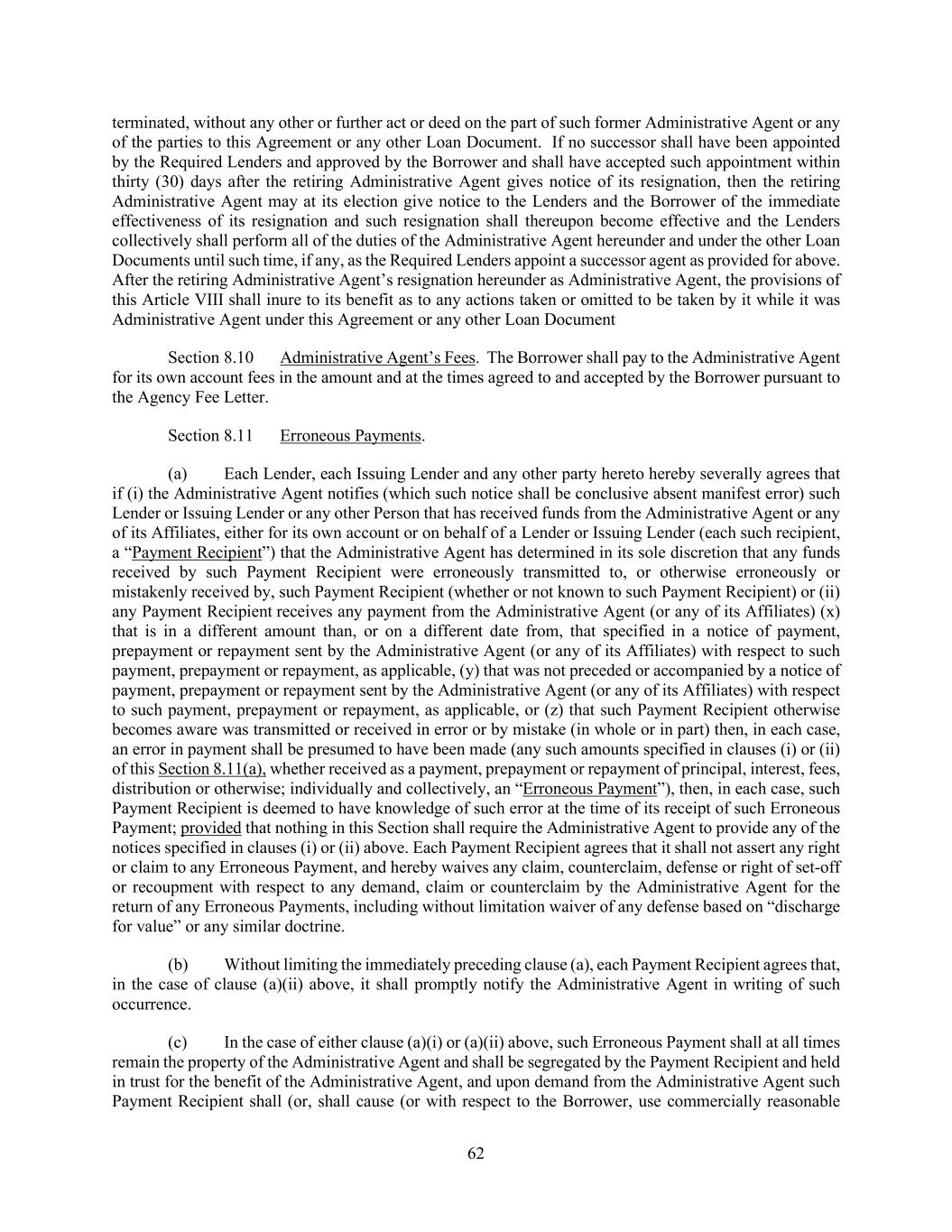 62 terminated, without any other or further act or deed on the part of such former Administrative Agent or any of the parties to this Agreement or any other Loan Document. If no successor shall have been appointed by the Required Lenders and approved by the Borrower and shall have accepted such appointment within thirty (30) days after the retiring Administrative Agent gives notice of its resignation, then the retiring Administrative Agent may at its election give notice to the Lenders and the Borrower of the immediate effectiveness of its resignation and such resignation shall thereupon become effective and the Lenders collectively shall perform all of the duties of the Administrative Agent hereunder and under the other Loan Documents until such time, if any, as the Required Lenders appoint a successor agent as provided for above. After the retiring Administrative Agent’s resignation hereunder as Administrative Agent, the provisions of this Article VIII shall inure to its benefit as to any actions taken or omitted to be taken by it while it was Administrative Agent under this Agreement or any other Loan Document Section 8.10 Administrative Agent’s Fees. The Borrower shall pay to the Administrative Agent for its own account fees in the amount and at the times agreed to and accepted by the Borrower pursuant to the Agency Fee Letter. Section 8.11 Erroneous Payments. (a) Each Lender, each Issuing Lender and any other party hereto hereby severally agrees that if (i) the Administrative Agent notifies (which such notice shall be conclusive absent manifest error) such Lender or Issuing Lender or any other Person that has received funds from the Administrative Agent or any of its Affiliates, either for its own account or on behalf of a Lender or Issuing Lender (each such recipient, a “Payment Recipient”) that the Administrative Agent has determined in its sole discretion that any funds received by such Payment Recipient were erroneously transmitted to, or otherwise erroneously or mistakenly received by, such Payment Recipient (whether or not known to such Payment Recipient) or (ii) any Payment Recipient receives any payment from the Administrative Agent (or any of its Affiliates) (x) that is in a different amount than, or on a different date from, that specified in a notice of payment, prepayment or repayment sent by the Administrative Agent (or any of its Affiliates) with respect to such payment, prepayment or repayment, as applicable, (y) that was not preceded or accompanied by a notice of payment, prepayment or repayment sent by the Administrative Agent (or any of its Affiliates) with respect to such payment, prepayment or repayment, as applicable, or (z) that such Payment Recipient otherwise becomes aware was transmitted or received in error or by mistake (in whole or in part) then, in each case, an error in payment shall be presumed to have been made (any such amounts specified in clauses (i) or (ii) of this Section 8.11(a), whether received as a payment, prepayment or repayment of principal, interest, fees, distribution or otherwise; individually and collectively, an “Erroneous Payment”), then, in each case, such Payment Recipient is deemed to have knowledge of such error at the time of its receipt of such Erroneous Payment; provided that nothing in this Section shall require the Administrative Agent to provide any of the notices specified in clauses (i) or (ii) above. Each Payment Recipient agrees that it shall not assert any right or claim to any Erroneous Payment, and hereby waives any claim, counterclaim, defense or right of set-off or recoupment with respect to any demand, claim or counterclaim by the Administrative Agent for the return of any Erroneous Payments, including without limitation waiver of any defense based on “discharge for value” or any similar doctrine. (b) Without limiting the immediately preceding clause (a), each Payment Recipient agrees that, in the case of clause (a)(ii) above, it shall promptly notify the Administrative Agent in writing of such occurrence. (c) In the case of either clause (a)(i) or (a)(ii) above, such Erroneous Payment shall at all times remain the property of the Administrative Agent and shall be segregated by the Payment Recipient and held in trust for the benefit of the Administrative Agent, and upon demand from the Administrative Agent such Payment Recipient shall (or, shall cause (or with respect to the Borrower, use commercially reasonable
