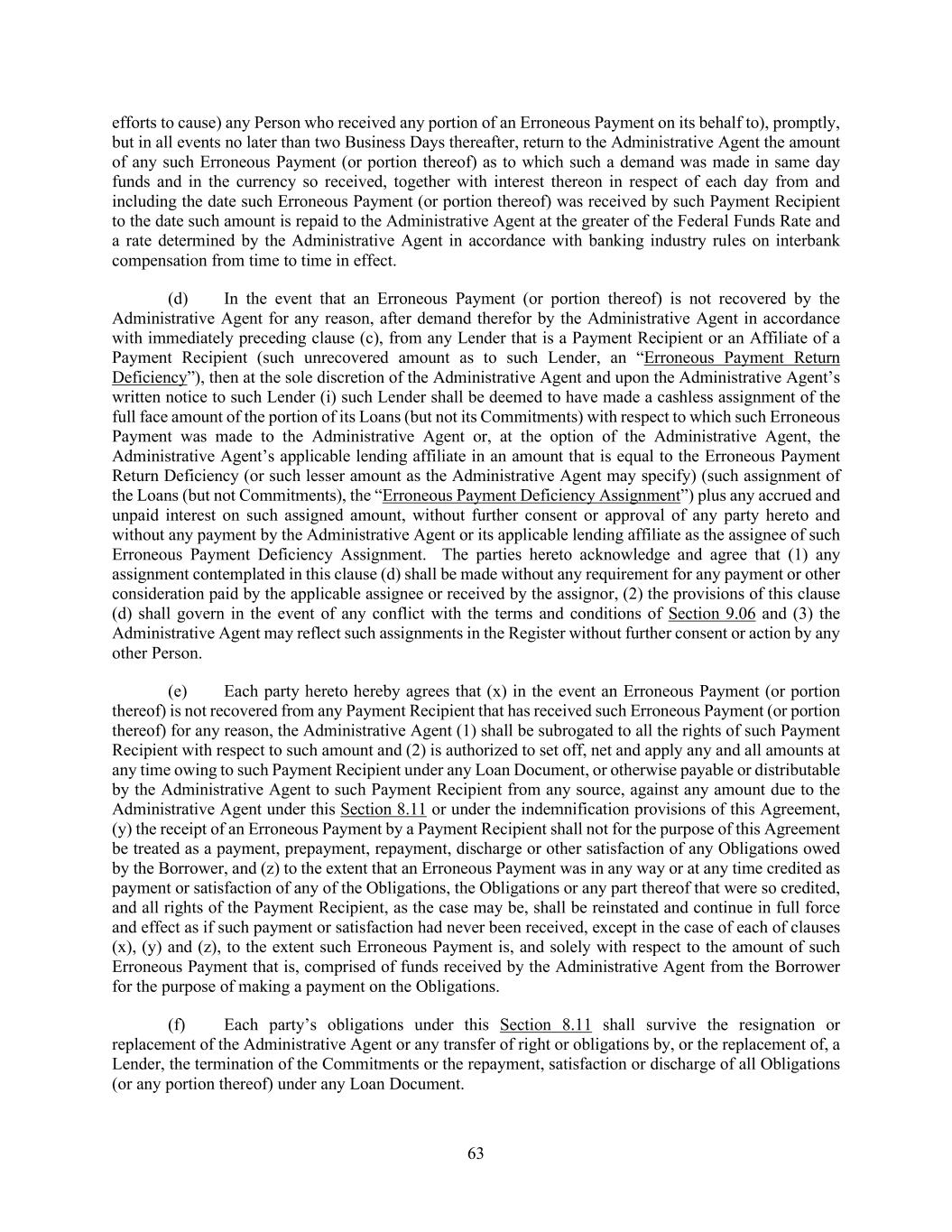 63 efforts to cause) any Person who received any portion of an Erroneous Payment on its behalf to), promptly, but in all events no later than two Business Days thereafter, return to the Administrative Agent the amount of any such Erroneous Payment (or portion thereof) as to which such a demand was made in same day funds and in the currency so received, together with interest thereon in respect of each day from and including the date such Erroneous Payment (or portion thereof) was received by such Payment Recipient to the date such amount is repaid to the Administrative Agent at the greater of the Federal Funds Rate and a rate determined by the Administrative Agent in accordance with banking industry rules on interbank compensation from time to time in effect. (d) In the event that an Erroneous Payment (or portion thereof) is not recovered by the Administrative Agent for any reason, after demand therefor by the Administrative Agent in accordance with immediately preceding clause (c), from any Lender that is a Payment Recipient or an Affiliate of a Payment Recipient (such unrecovered amount as to such Lender, an “Erroneous Payment Return Deficiency”), then at the sole discretion of the Administrative Agent and upon the Administrative Agent’s written notice to such Lender (i) such Lender shall be deemed to have made a cashless assignment of the full face amount of the portion of its Loans (but not its Commitments) with respect to which such Erroneous Payment was made to the Administrative Agent or, at the option of the Administrative Agent, the Administrative Agent’s applicable lending affiliate in an amount that is equal to the Erroneous Payment Return Deficiency (or such lesser amount as the Administrative Agent may specify) (such assignment of the Loans (but not Commitments), the “Erroneous Payment Deficiency Assignment”) plus any accrued and unpaid interest on such assigned amount, without further consent or approval of any party hereto and without any payment by the Administrative Agent or its applicable lending affiliate as the assignee of such Erroneous Payment Deficiency Assignment. The parties hereto acknowledge and agree that (1) any assignment contemplated in this clause (d) shall be made without any requirement for any payment or other consideration paid by the applicable assignee or received by the assignor, (2) the provisions of this clause (d) shall govern in the event of any conflict with the terms and conditions of Section 9.06 and (3) the Administrative Agent may reflect such assignments in the Register without further consent or action by any other Person. (e) Each party hereto hereby agrees that (x) in the event an Erroneous Payment (or portion thereof) is not recovered from any Payment Recipient that has received such Erroneous Payment (or portion thereof) for any reason, the Administrative Agent (1) shall be subrogated to all the rights of such Payment Recipient with respect to such amount and (2) is authorized to set off, net and apply any and all amounts at any time owing to such Payment Recipient under any Loan Document, or otherwise payable or distributable by the Administrative Agent to such Payment Recipient from any source, against any amount due to the Administrative Agent under this Section 8.11 or under the indemnification provisions of this Agreement, (y) the receipt of an Erroneous Payment by a Payment Recipient shall not for the purpose of this Agreement be treated as a payment, prepayment, repayment, discharge or other satisfaction of any Obligations owed by the Borrower, and (z) to the extent that an Erroneous Payment was in any way or at any time credited as payment or satisfaction of any of the Obligations, the Obligations or any part thereof that were so credited, and all rights of the Payment Recipient, as the case may be, shall be reinstated and continue in full force and effect as if such payment or satisfaction had never been received, except in the case of each of clauses (x), (y) and (z), to the extent such Erroneous Payment is, and solely with respect to the amount of such Erroneous Payment that is, comprised of funds received by the Administrative Agent from the Borrower for the purpose of making a payment on the Obligations. (f) Each party’s obligations under this Section 8.11 shall survive the resignation or replacement of the Administrative Agent or any transfer of right or obligations by, or the replacement of, a Lender, the termination of the Commitments or the repayment, satisfaction or discharge of all Obligations (or any portion thereof) under any Loan Document.