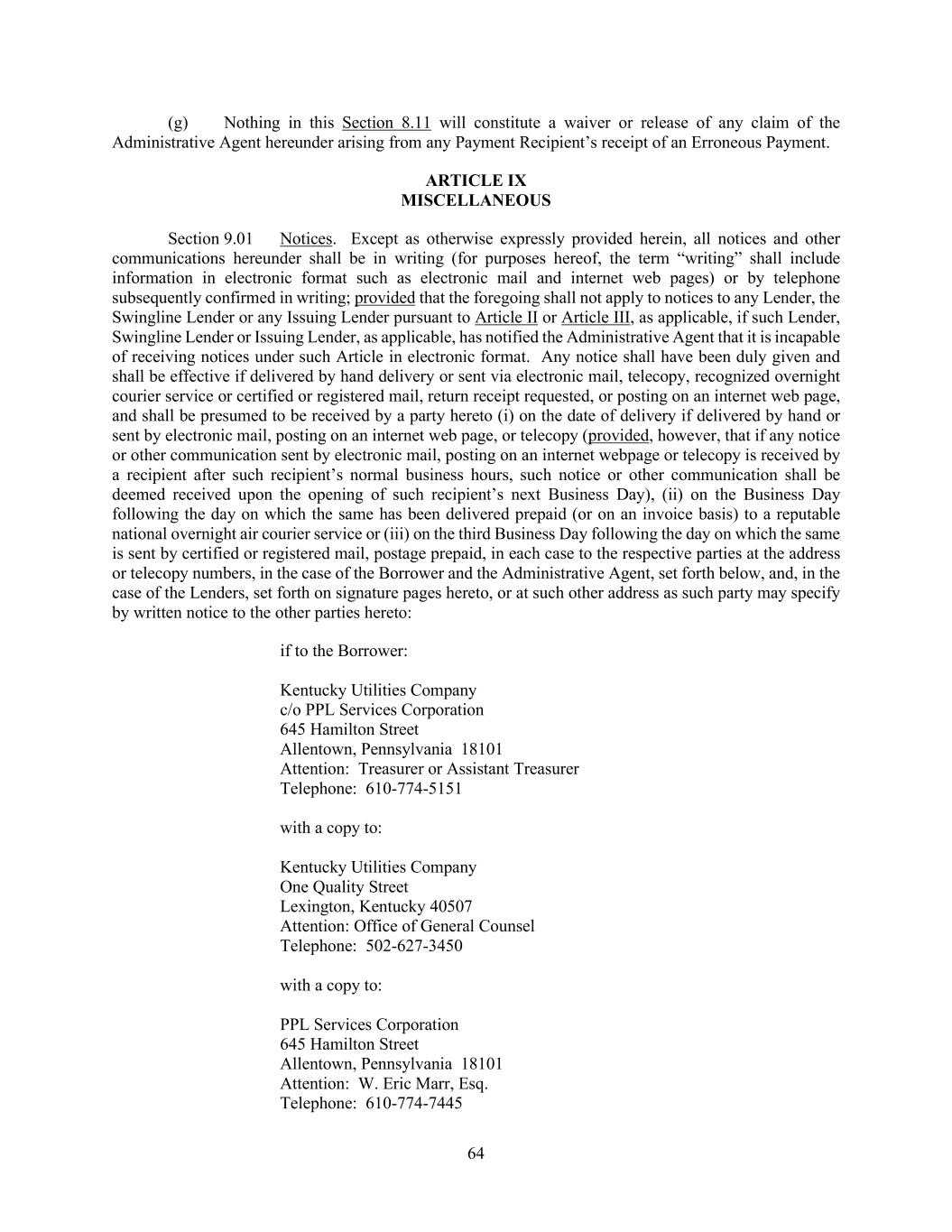64 (g) Nothing in this Section 8.11 will constitute a waiver or release of any claim of the Administrative Agent hereunder arising from any Payment Recipient’s receipt of an Erroneous Payment. ARTICLE IX MISCELLANEOUS Section 9.01 Notices. Except as otherwise expressly provided herein, all notices and other communications hereunder shall be in writing (for purposes hereof, the term “writing” shall include information in electronic format such as electronic mail and internet web pages) or by telephone subsequently confirmed in writing; provided that the foregoing shall not apply to notices to any Lender, the Swingline Lender or any Issuing Lender pursuant to Article II or Article III, as applicable, if such Lender, Swingline Lender or Issuing Lender, as applicable, has notified the Administrative Agent that it is incapable of receiving notices under such Article in electronic format. Any notice shall have been duly given and shall be effective if delivered by hand delivery or sent via electronic mail, telecopy, recognized overnight courier service or certified or registered mail, return receipt requested, or posting on an internet web page, and shall be presumed to be received by a party hereto (i) on the date of delivery if delivered by hand or sent by electronic mail, posting on an internet web page, or telecopy (provided, however, that if any notice or other communication sent by electronic mail, posting on an internet webpage or telecopy is received by a recipient after such recipient’s normal business hours, such notice or other communication shall be deemed received upon the opening of such recipient’s next Business Day), (ii) on the Business Day following the day on which the same has been delivered prepaid (or on an invoice basis) to a reputable national overnight air courier service or (iii) on the third Business Day following the day on which the same is sent by certified or registered mail, postage prepaid, in each case to the respective parties at the address or telecopy numbers, in the case of the Borrower and the Administrative Agent, set forth below, and, in the case of the Lenders, set forth on signature pages hereto, or at such other address as such party may specify by written notice to the other parties hereto: if to the Borrower: Kentucky Utilities Company c/o PPL Services Corporation 645 Hamilton Street Allentown, Pennsylvania 18101 Attention: Treasurer or Assistant Treasurer Telephone: 610-774-5151 with a copy to: Kentucky Utilities Company One Quality Street Lexington, Kentucky 40507 Attention: Office of General Counsel Telephone: 502-627-3450 with a copy to: PPL Services Corporation 645 Hamilton Street Allentown, Pennsylvania 18101 Attention: W. Eric Marr, Esq. Telephone: 610-774-7445