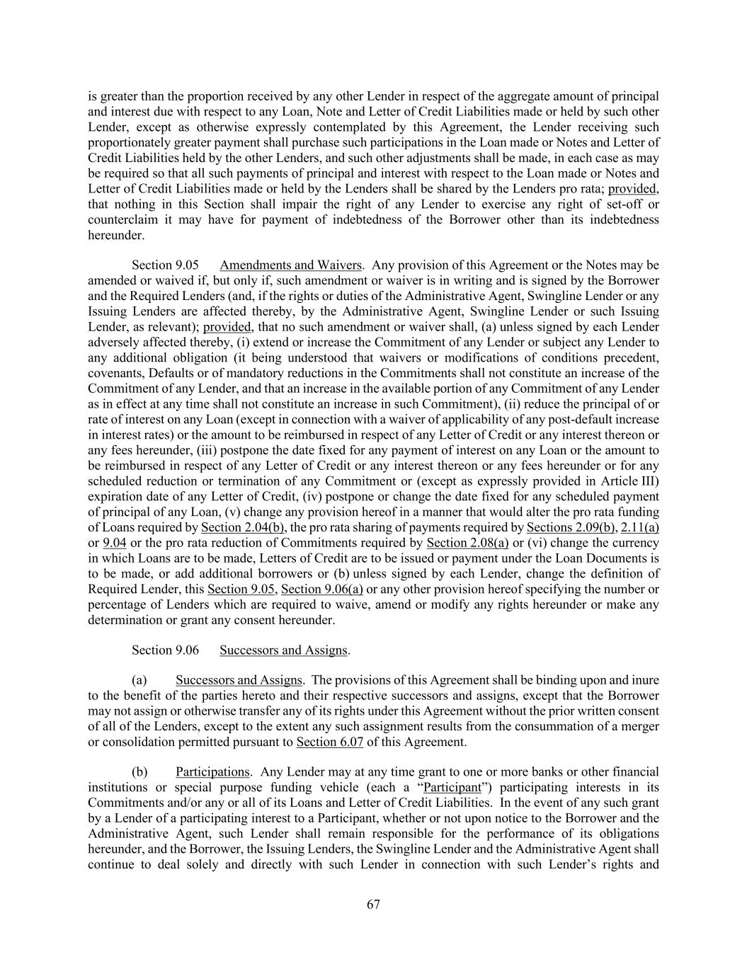 67 is greater than the proportion received by any other Lender in respect of the aggregate amount of principal and interest due with respect to any Loan, Note and Letter of Credit Liabilities made or held by such other Lender, except as otherwise expressly contemplated by this Agreement, the Lender receiving such proportionately greater payment shall purchase such participations in the Loan made or Notes and Letter of Credit Liabilities held by the other Lenders, and such other adjustments shall be made, in each case as may be required so that all such payments of principal and interest with respect to the Loan made or Notes and Letter of Credit Liabilities made or held by the Lenders shall be shared by the Lenders pro rata; provided, that nothing in this Section shall impair the right of any Lender to exercise any right of set-off or counterclaim it may have for payment of indebtedness of the Borrower other than its indebtedness hereunder. Section 9.05 Amendments and Waivers. Any provision of this Agreement or the Notes may be amended or waived if, but only if, such amendment or waiver is in writing and is signed by the Borrower and the Required Lenders (and, if the rights or duties of the Administrative Agent, Swingline Lender or any Issuing Lenders are affected thereby, by the Administrative Agent, Swingline Lender or such Issuing Lender, as relevant); provided, that no such amendment or waiver shall, (a) unless signed by each Lender adversely affected thereby, (i) extend or increase the Commitment of any Lender or subject any Lender to any additional obligation (it being understood that waivers or modifications of conditions precedent, covenants, Defaults or of mandatory reductions in the Commitments shall not constitute an increase of the Commitment of any Lender, and that an increase in the available portion of any Commitment of any Lender as in effect at any time shall not constitute an increase in such Commitment), (ii) reduce the principal of or rate of interest on any Loan (except in connection with a waiver of applicability of any post-default increase in interest rates) or the amount to be reimbursed in respect of any Letter of Credit or any interest thereon or any fees hereunder, (iii) postpone the date fixed for any payment of interest on any Loan or the amount to be reimbursed in respect of any Letter of Credit or any interest thereon or any fees hereunder or for any scheduled reduction or termination of any Commitment or (except as expressly provided in Article III) expiration date of any Letter of Credit, (iv) postpone or change the date fixed for any scheduled payment of principal of any Loan, (v) change any provision hereof in a manner that would alter the pro rata funding of Loans required by Section 2.04(b), the pro rata sharing of payments required by Sections 2.09(b), 2.11(a) or 9.04 or the pro rata reduction of Commitments required by Section 2.08(a) or (vi) change the currency in which Loans are to be made, Letters of Credit are to be issued or payment under the Loan Documents is to be made, or add additional borrowers or (b) unless signed by each Lender, change the definition of Required Lender, this Section 9.05, Section 9.06(a) or any other provision hereof specifying the number or percentage of Lenders which are required to waive, amend or modify any rights hereunder or make any determination or grant any consent hereunder. Section 9.06 Successors and Assigns. (a) Successors and Assigns. The provisions of this Agreement shall be binding upon and inure to the benefit of the parties hereto and their respective successors and assigns, except that the Borrower may not assign or otherwise transfer any of its rights under this Agreement without the prior written consent of all of the Lenders, except to the extent any such assignment results from the consummation of a merger or consolidation permitted pursuant to Section 6.07 of this Agreement. (b) Participations. Any Lender may at any time grant to one or more banks or other financial institutions or special purpose funding vehicle (each a “Participant”) participating interests in its Commitments and/or any or all of its Loans and Letter of Credit Liabilities. In the event of any such grant by a Lender of a participating interest to a Participant, whether or not upon notice to the Borrower and the Administrative Agent, such Lender shall remain responsible for the performance of its obligations hereunder, and the Borrower, the Issuing Lenders, the Swingline Lender and the Administrative Agent shall continue to deal solely and directly with such Lender in connection with such Lender’s rights and