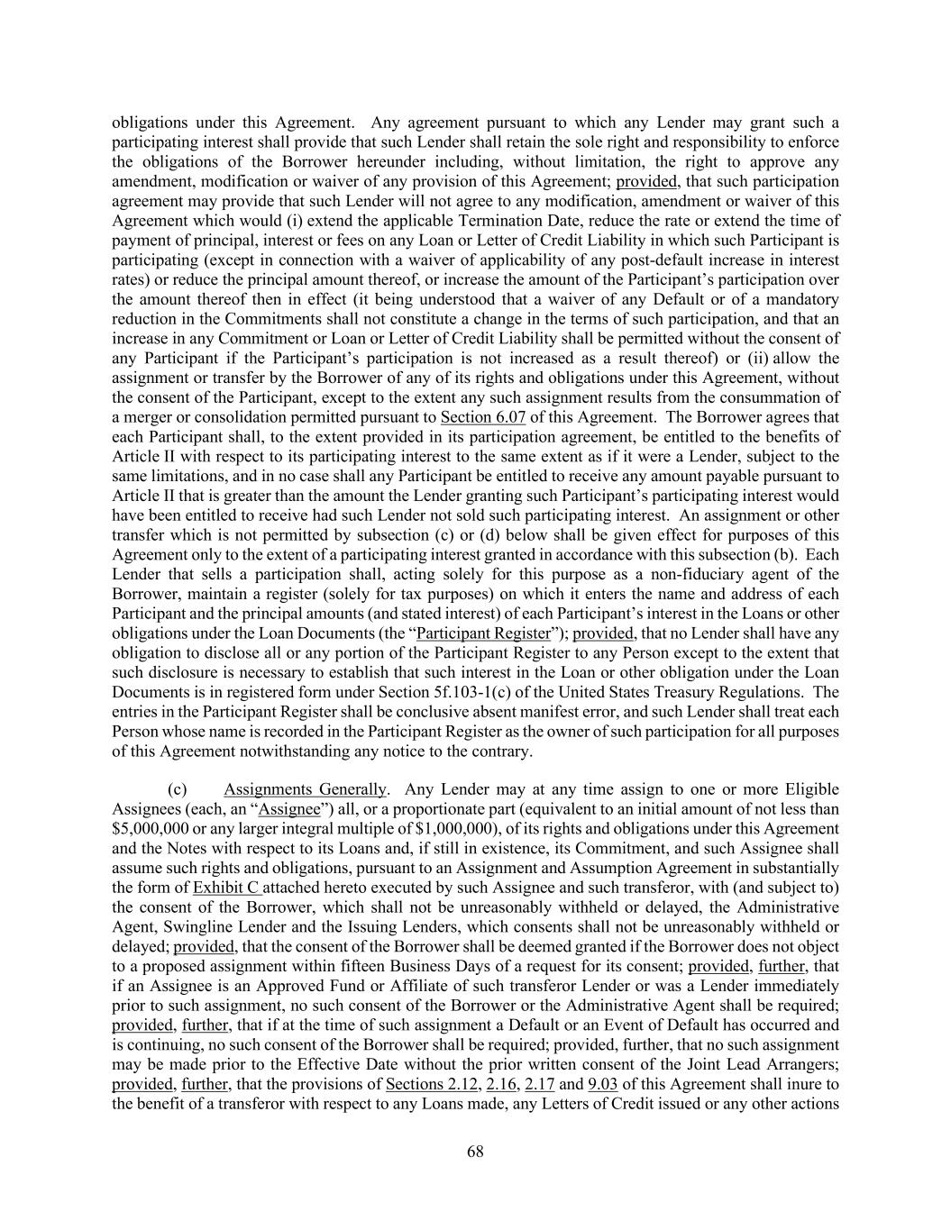 68 obligations under this Agreement. Any agreement pursuant to which any Lender may grant such a participating interest shall provide that such Lender shall retain the sole right and responsibility to enforce the obligations of the Borrower hereunder including, without limitation, the right to approve any amendment, modification or waiver of any provision of this Agreement; provided, that such participation agreement may provide that such Lender will not agree to any modification, amendment or waiver of this Agreement which would (i) extend the applicable Termination Date, reduce the rate or extend the time of payment of principal, interest or fees on any Loan or Letter of Credit Liability in which such Participant is participating (except in connection with a waiver of applicability of any post-default increase in interest rates) or reduce the principal amount thereof, or increase the amount of the Participant’s participation over the amount thereof then in effect (it being understood that a waiver of any Default or of a mandatory reduction in the Commitments shall not constitute a change in the terms of such participation, and that an increase in any Commitment or Loan or Letter of Credit Liability shall be permitted without the consent of any Participant if the Participant’s participation is not increased as a result thereof) or (ii) allow the assignment or transfer by the Borrower of any of its rights and obligations under this Agreement, without the consent of the Participant, except to the extent any such assignment results from the consummation of a merger or consolidation permitted pursuant to Section 6.07 of this Agreement. The Borrower agrees that each Participant shall, to the extent provided in its participation agreement, be entitled to the benefits of Article II with respect to its participating interest to the same extent as if it were a Lender, subject to the same limitations, and in no case shall any Participant be entitled to receive any amount payable pursuant to Article II that is greater than the amount the Lender granting such Participant’s participating interest would have been entitled to receive had such Lender not sold such participating interest. An assignment or other transfer which is not permitted by subsection (c) or (d) below shall be given effect for purposes of this Agreement only to the extent of a participating interest granted in accordance with this subsection (b). Each Lender that sells a participation shall, acting solely for this purpose as a non-fiduciary agent of the Borrower, maintain a register (solely for tax purposes) on which it enters the name and address of each Participant and the principal amounts (and stated interest) of each Participant’s interest in the Loans or other obligations under the Loan Documents (the “Participant Register”); provided, that no Lender shall have any obligation to disclose all or any portion of the Participant Register to any Person except to the extent that such disclosure is necessary to establish that such interest in the Loan or other obligation under the Loan Documents is in registered form under Section 5f.103-1(c) of the United States Treasury Regulations. The entries in the Participant Register shall be conclusive absent manifest error, and such Lender shall treat each Person whose name is recorded in the Participant Register as the owner of such participation for all purposes of this Agreement notwithstanding any notice to the contrary. (c) Assignments Generally. Any Lender may at any time assign to one or more Eligible Assignees (each, an “Assignee”) all, or a proportionate part (equivalent to an initial amount of not less than $5,000,000 or any larger integral multiple of $1,000,000), of its rights and obligations under this Agreement and the Notes with respect to its Loans and, if still in existence, its Commitment, and such Assignee shall assume such rights and obligations, pursuant to an Assignment and Assumption Agreement in substantially the form of Exhibit C attached hereto executed by such Assignee and such transferor, with (and subject to) the consent of the Borrower, which shall not be unreasonably withheld or delayed, the Administrative Agent, Swingline Lender and the Issuing Lenders, which consents shall not be unreasonably withheld or delayed; provided, that the consent of the Borrower shall be deemed granted if the Borrower does not object to a proposed assignment within fifteen Business Days of a request for its consent; provided, further, that if an Assignee is an Approved Fund or Affiliate of such transferor Lender or was a Lender immediately prior to such assignment, no such consent of the Borrower or the Administrative Agent shall be required; provided, further, that if at the time of such assignment a Default or an Event of Default has occurred and is continuing, no such consent of the Borrower shall be required; provided, further, that no such assignment may be made prior to the Effective Date without the prior written consent of the Joint Lead Arrangers; provided, further, that the provisions of Sections 2.12, 2.16, 2.17 and 9.03 of this Agreement shall inure to the benefit of a transferor with respect to any Loans made, any Letters of Credit issued or any other actions