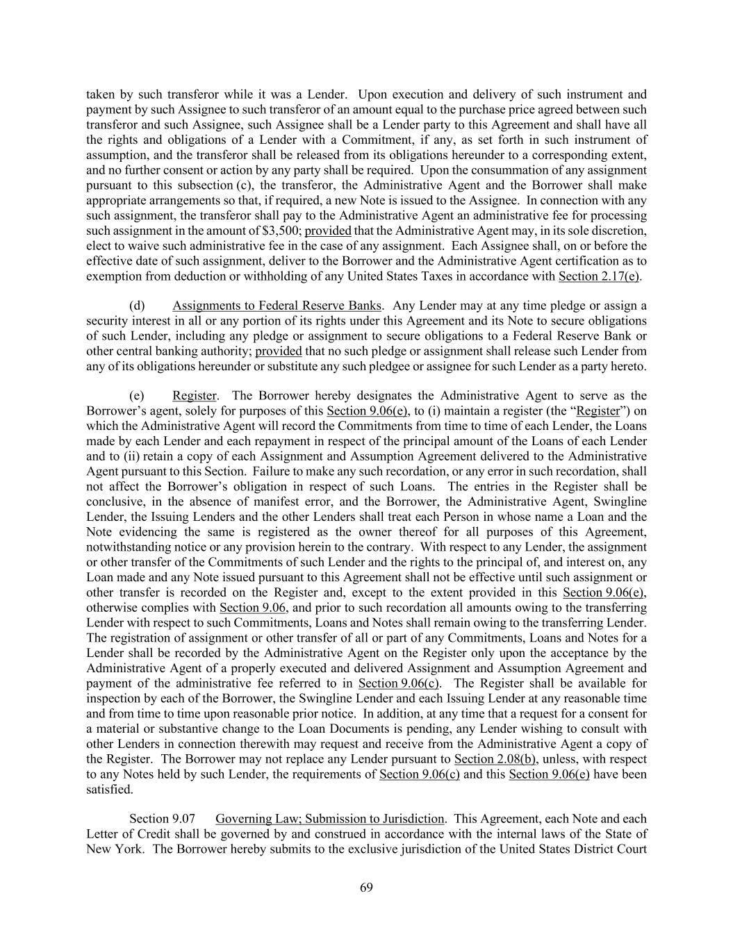 69 taken by such transferor while it was a Lender. Upon execution and delivery of such instrument and payment by such Assignee to such transferor of an amount equal to the purchase price agreed between such transferor and such Assignee, such Assignee shall be a Lender party to this Agreement and shall have all the rights and obligations of a Lender with a Commitment, if any, as set forth in such instrument of assumption, and the transferor shall be released from its obligations hereunder to a corresponding extent, and no further consent or action by any party shall be required. Upon the consummation of any assignment pursuant to this subsection (c), the transferor, the Administrative Agent and the Borrower shall make appropriate arrangements so that, if required, a new Note is issued to the Assignee. In connection with any such assignment, the transferor shall pay to the Administrative Agent an administrative fee for processing such assignment in the amount of $3,500; provided that the Administrative Agent may, in its sole discretion, elect to waive such administrative fee in the case of any assignment. Each Assignee shall, on or before the effective date of such assignment, deliver to the Borrower and the Administrative Agent certification as to exemption from deduction or withholding of any United States Taxes in accordance with Section 2.17(e). (d) Assignments to Federal Reserve Banks. Any Lender may at any time pledge or assign a security interest in all or any portion of its rights under this Agreement and its Note to secure obligations of such Lender, including any pledge or assignment to secure obligations to a Federal Reserve Bank or other central banking authority; provided that no such pledge or assignment shall release such Lender from any of its obligations hereunder or substitute any such pledgee or assignee for such Lender as a party hereto. (e) Register. The Borrower hereby designates the Administrative Agent to serve as the Borrower’s agent, solely for purposes of this Section 9.06(e), to (i) maintain a register (the “Register”) on which the Administrative Agent will record the Commitments from time to time of each Lender, the Loans made by each Lender and each repayment in respect of the principal amount of the Loans of each Lender and to (ii) retain a copy of each Assignment and Assumption Agreement delivered to the Administrative Agent pursuant to this Section. Failure to make any such recordation, or any error in such recordation, shall not affect the Borrower’s obligation in respect of such Loans. The entries in the Register shall be conclusive, in the absence of manifest error, and the Borrower, the Administrative Agent, Swingline Lender, the Issuing Lenders and the other Lenders shall treat each Person in whose name a Loan and the Note evidencing the same is registered as the owner thereof for all purposes of this Agreement, notwithstanding notice or any provision herein to the contrary. With respect to any Lender, the assignment or other transfer of the Commitments of such Lender and the rights to the principal of, and interest on, any Loan made and any Note issued pursuant to this Agreement shall not be effective until such assignment or other transfer is recorded on the Register and, except to the extent provided in this Section 9.06(e), otherwise complies with Section 9.06, and prior to such recordation all amounts owing to the transferring Lender with respect to such Commitments, Loans and Notes shall remain owing to the transferring Lender. The registration of assignment or other transfer of all or part of any Commitments, Loans and Notes for a Lender shall be recorded by the Administrative Agent on the Register only upon the acceptance by the Administrative Agent of a properly executed and delivered Assignment and Assumption Agreement and payment of the administrative fee referred to in Section 9.06(c). The Register shall be available for inspection by each of the Borrower, the Swingline Lender and each Issuing Lender at any reasonable time and from time to time upon reasonable prior notice. In addition, at any time that a request for a consent for a material or substantive change to the Loan Documents is pending, any Lender wishing to consult with other Lenders in connection therewith may request and receive from the Administrative Agent a copy of the Register. The Borrower may not replace any Lender pursuant to Section 2.08(b), unless, with respect to any Notes held by such Lender, the requirements of Section 9.06(c) and this Section 9.06(e) have been satisfied. Section 9.07 Governing Law; Submission to Jurisdiction. This Agreement, each Note and each Letter of Credit shall be governed by and construed in accordance with the internal laws of the State of New York. The Borrower hereby submits to the exclusive jurisdiction of the United States District Court