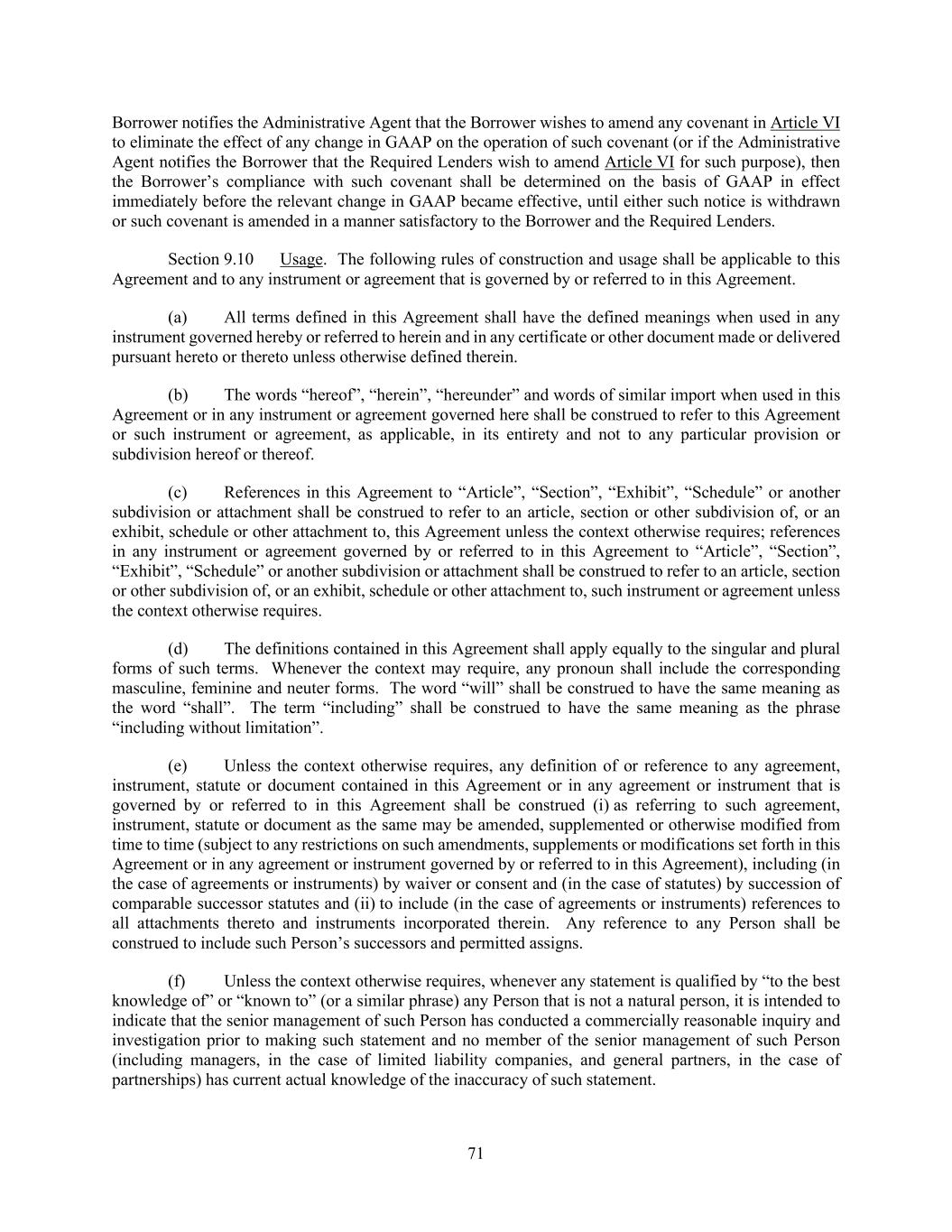71 Borrower notifies the Administrative Agent that the Borrower wishes to amend any covenant in Article VI to eliminate the effect of any change in GAAP on the operation of such covenant (or if the Administrative Agent notifies the Borrower that the Required Lenders wish to amend Article VI for such purpose), then the Borrower’s compliance with such covenant shall be determined on the basis of GAAP in effect immediately before the relevant change in GAAP became effective, until either such notice is withdrawn or such covenant is amended in a manner satisfactory to the Borrower and the Required Lenders. Section 9.10 Usage. The following rules of construction and usage shall be applicable to this Agreement and to any instrument or agreement that is governed by or referred to in this Agreement. (a) All terms defined in this Agreement shall have the defined meanings when used in any instrument governed hereby or referred to herein and in any certificate or other document made or delivered pursuant hereto or thereto unless otherwise defined therein. (b) The words “hereof”, “herein”, “hereunder” and words of similar import when used in this Agreement or in any instrument or agreement governed here shall be construed to refer to this Agreement or such instrument or agreement, as applicable, in its entirety and not to any particular provision or subdivision hereof or thereof. (c) References in this Agreement to “Article”, “Section”, “Exhibit”, “Schedule” or another subdivision or attachment shall be construed to refer to an article, section or other subdivision of, or an exhibit, schedule or other attachment to, this Agreement unless the context otherwise requires; references in any instrument or agreement governed by or referred to in this Agreement to “Article”, “Section”, “Exhibit”, “Schedule” or another subdivision or attachment shall be construed to refer to an article, section or other subdivision of, or an exhibit, schedule or other attachment to, such instrument or agreement unless the context otherwise requires. (d) The definitions contained in this Agreement shall apply equally to the singular and plural forms of such terms. Whenever the context may require, any pronoun shall include the corresponding masculine, feminine and neuter forms. The word “will” shall be construed to have the same meaning as the word “shall”. The term “including” shall be construed to have the same meaning as the phrase “including without limitation”. (e) Unless the context otherwise requires, any definition of or reference to any agreement, instrument, statute or document contained in this Agreement or in any agreement or instrument that is governed by or referred to in this Agreement shall be construed (i) as referring to such agreement, instrument, statute or document as the same may be amended, supplemented or otherwise modified from time to time (subject to any restrictions on such amendments, supplements or modifications set forth in this Agreement or in any agreement or instrument governed by or referred to in this Agreement), including (in the case of agreements or instruments) by waiver or consent and (in the case of statutes) by succession of comparable successor statutes and (ii) to include (in the case of agreements or instruments) references to all attachments thereto and instruments incorporated therein. Any reference to any Person shall be construed to include such Person’s successors and permitted assigns. (f) Unless the context otherwise requires, whenever any statement is qualified by “to the best knowledge of” or “known to” (or a similar phrase) any Person that is not a natural person, it is intended to indicate that the senior management of such Person has conducted a commercially reasonable inquiry and investigation prior to making such statement and no member of the senior management of such Person (including managers, in the case of limited liability companies, and general partners, in the case of partnerships) has current actual knowledge of the inaccuracy of such statement.