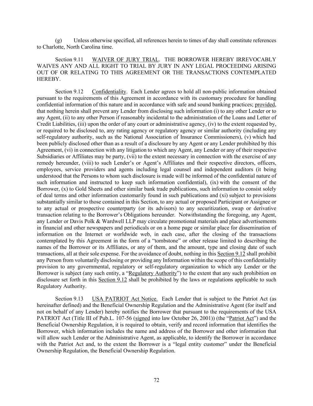 72 (g) Unless otherwise specified, all references herein to times of day shall constitute references to Charlotte, North Carolina time. Section 9.11 WAIVER OF JURY TRIAL. THE BORROWER HEREBY IRREVOCABLY WAIVES ANY AND ALL RIGHT TO TRIAL BY JURY IN ANY LEGAL PROCEEDING ARISING OUT OF OR RELATING TO THIS AGREEMENT OR THE TRANSACTIONS CONTEMPLATED HEREBY. Section 9.12 Confidentiality. Each Lender agrees to hold all non-public information obtained pursuant to the requirements of this Agreement in accordance with its customary procedure for handling confidential information of this nature and in accordance with safe and sound banking practices; provided, that nothing herein shall prevent any Lender from disclosing such information (i) to any other Lender or to any Agent, (ii) to any other Person if reasonably incidental to the administration of the Loans and Letter of Credit Liabilities, (iii) upon the order of any court or administrative agency, (iv) to the extent requested by, or required to be disclosed to, any rating agency or regulatory agency or similar authority (including any self-regulatory authority, such as the National Association of Insurance Commissioners), (v) which had been publicly disclosed other than as a result of a disclosure by any Agent or any Lender prohibited by this Agreement, (vi) in connection with any litigation to which any Agent, any Lender or any of their respective Subsidiaries or Affiliates may be party, (vii) to the extent necessary in connection with the exercise of any remedy hereunder, (viii) to such Lender’s or Agent’s Affiliates and their respective directors, officers, employees, service providers and agents including legal counsel and independent auditors (it being understood that the Persons to whom such disclosure is made will be informed of the confidential nature of such information and instructed to keep such information confidential), (ix) with the consent of the Borrower, (x) to Gold Sheets and other similar bank trade publications, such information to consist solely of deal terms and other information customarily found in such publications and (xi) subject to provisions substantially similar to those contained in this Section, to any actual or proposed Participant or Assignee or to any actual or prospective counterparty (or its advisors) to any securitization, swap or derivative transaction relating to the Borrower’s Obligations hereunder. Notwithstanding the foregoing, any Agent, any Lender or Davis Polk & Wardwell LLP may circulate promotional materials and place advertisements in financial and other newspapers and periodicals or on a home page or similar place for dissemination of information on the Internet or worldwide web, in each case, after the closing of the transactions contemplated by this Agreement in the form of a “tombstone” or other release limited to describing the names of the Borrower or its Affiliates, or any of them, and the amount, type and closing date of such transactions, all at their sole expense. For the avoidance of doubt, nothing in this Section 9.12 shall prohibit any Person from voluntarily disclosing or providing any Information within the scope of this confidentiality provision to any governmental, regulatory or self-regulatory organization to which any Lender or the Borrower is subject (any such entity, a “Regulatory Authority”) to the extent that any such prohibition on disclosure set forth in this Section 9.12 shall be prohibited by the laws or regulations applicable to such Regulatory Authority. Section 9.13 USA PATRIOT Act Notice. Each Lender that is subject to the Patriot Act (as hereinafter defined) and the Beneficial Ownership Regulation and the Administrative Agent (for itself and not on behalf of any Lender) hereby notifies the Borrower that pursuant to the requirements of the USA PATRIOT Act (Title III of Pub.L. 107-56 (signed into law October 26, 2001)) (the “Patriot Act”) and the Beneficial Ownership Regulation, it is required to obtain, verify and record information that identifies the Borrower, which information includes the name and address of the Borrower and other information that will allow such Lender or the Administrative Agent, as applicable, to identify the Borrower in accordance with the Patriot Act and, to the extent the Borrower is a “legal entity customer” under the Beneficial Ownership Regulation, the Beneficial Ownership Regulation.