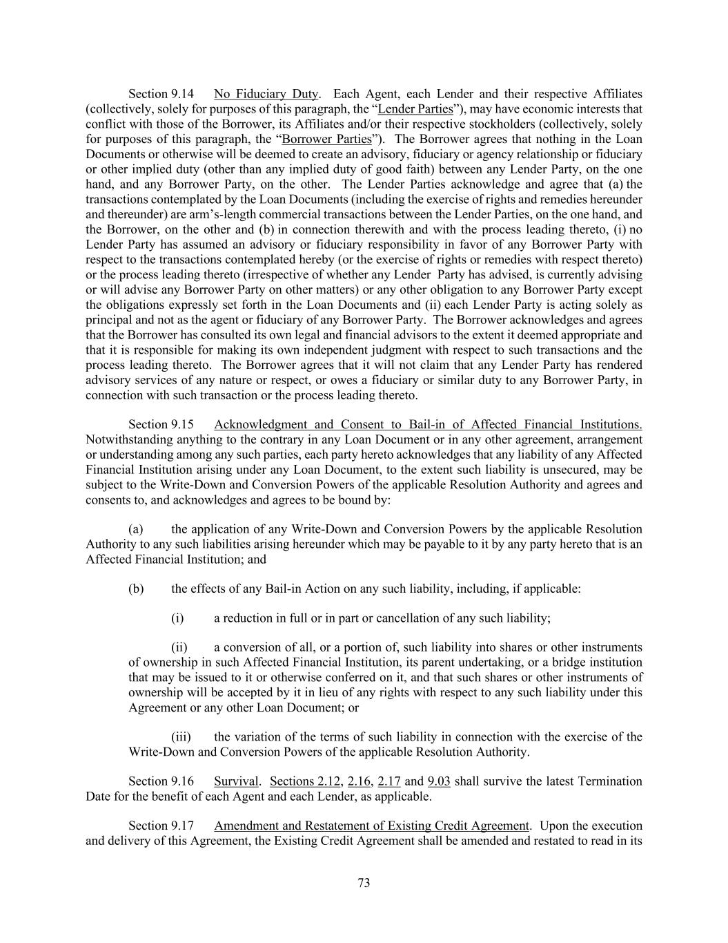73 Section 9.14 No Fiduciary Duty. Each Agent, each Lender and their respective Affiliates (collectively, solely for purposes of this paragraph, the “Lender Parties”), may have economic interests that conflict with those of the Borrower, its Affiliates and/or their respective stockholders (collectively, solely for purposes of this paragraph, the “Borrower Parties”). The Borrower agrees that nothing in the Loan Documents or otherwise will be deemed to create an advisory, fiduciary or agency relationship or fiduciary or other implied duty (other than any implied duty of good faith) between any Lender Party, on the one hand, and any Borrower Party, on the other. The Lender Parties acknowledge and agree that (a) the transactions contemplated by the Loan Documents (including the exercise of rights and remedies hereunder and thereunder) are arm’s-length commercial transactions between the Lender Parties, on the one hand, and the Borrower, on the other and (b) in connection therewith and with the process leading thereto, (i) no Lender Party has assumed an advisory or fiduciary responsibility in favor of any Borrower Party with respect to the transactions contemplated hereby (or the exercise of rights or remedies with respect thereto) or the process leading thereto (irrespective of whether any Lender Party has advised, is currently advising or will advise any Borrower Party on other matters) or any other obligation to any Borrower Party except the obligations expressly set forth in the Loan Documents and (ii) each Lender Party is acting solely as principal and not as the agent or fiduciary of any Borrower Party. The Borrower acknowledges and agrees that the Borrower has consulted its own legal and financial advisors to the extent it deemed appropriate and that it is responsible for making its own independent judgment with respect to such transactions and the process leading thereto. The Borrower agrees that it will not claim that any Lender Party has rendered advisory services of any nature or respect, or owes a fiduciary or similar duty to any Borrower Party, in connection with such transaction or the process leading thereto. Section 9.15 Acknowledgment and Consent to Bail-in of Affected Financial Institutions. Notwithstanding anything to the contrary in any Loan Document or in any other agreement, arrangement or understanding among any such parties, each party hereto acknowledges that any liability of any Affected Financial Institution arising under any Loan Document, to the extent such liability is unsecured, may be subject to the Write-Down and Conversion Powers of the applicable Resolution Authority and agrees and consents to, and acknowledges and agrees to be bound by: (a) the application of any Write-Down and Conversion Powers by the applicable Resolution Authority to any such liabilities arising hereunder which may be payable to it by any party hereto that is an Affected Financial Institution; and (b) the effects of any Bail-in Action on any such liability, including, if applicable: (i) a reduction in full or in part or cancellation of any such liability; (ii) a conversion of all, or a portion of, such liability into shares or other instruments of ownership in such Affected Financial Institution, its parent undertaking, or a bridge institution that may be issued to it or otherwise conferred on it, and that such shares or other instruments of ownership will be accepted by it in lieu of any rights with respect to any such liability under this Agreement or any other Loan Document; or (iii) the variation of the terms of such liability in connection with the exercise of the Write-Down and Conversion Powers of the applicable Resolution Authority. Section 9.16 Survival. Sections 2.12, 2.16, 2.17 and 9.03 shall survive the latest Termination Date for the benefit of each Agent and each Lender, as applicable. Section 9.17 Amendment and Restatement of Existing Credit Agreement. Upon the execution and delivery of this Agreement, the Existing Credit Agreement shall be amended and restated to read in its