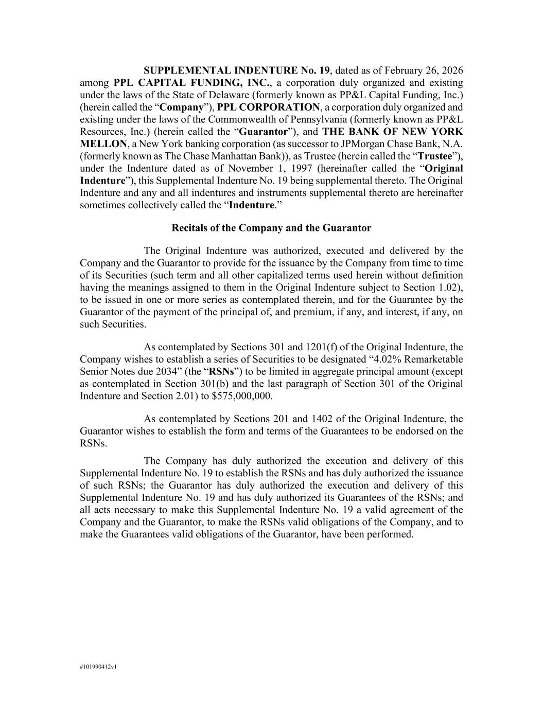 #101990412v1 SUPPLEMENTAL INDENTURE No. 19, dated as of February 26, 2026 among PPL CAPITAL FUNDING, INC., a corporation duly organized and existing under the laws of the State of Delaware (formerly known as PP&L Capital Funding, Inc.) (herein called the “Company”), PPL CORPORATION, a corporation duly organized and existing under the laws of the Commonwealth of Pennsylvania (formerly known as PP&L Resources, Inc.) (herein called the “Guarantor”), and THE BANK OF NEW YORK MELLON, a New York banking corporation (as successor to JPMorgan Chase Bank, N.A. (formerly known as The Chase Manhattan Bank)), as Trustee (herein called the “Trustee”), under the Indenture dated as of November 1, 1997 (hereinafter called the “Original Indenture”), this Supplemental Indenture No. 19 being supplemental thereto. The Original Indenture and any and all indentures and instruments supplemental thereto are hereinafter sometimes collectively called the “Indenture.” Recitals of the Company and the Guarantor The Original Indenture was authorized, executed and delivered by the Company and the Guarantor to provide for the issuance by the Company from time to time of its Securities (such term and all other capitalized terms used herein without definition having the meanings assigned to them in the Original Indenture subject to Section 1.02), to be issued in one or more series as contemplated therein, and for the Guarantee by the Guarantor of the payment of the principal of, and premium, if any, and interest, if any, on such Securities. As contemplated by Sections 301 and 1201(f) of the Original Indenture, the Company wishes to establish a series of Securities to be designated “4.02% Remarketable Senior Notes due 2034” (the “RSNs”) to be limited in aggregate principal amount (except as contemplated in Section 301(b) and the last paragraph of Section 301 of the Original Indenture and Section 2.01) to $575,000,000. As contemplated by Sections 201 and 1402 of the Original Indenture, the Guarantor wishes to establish the form and terms of the Guarantees to be endorsed on the RSNs. The Company has duly authorized the execution and delivery of this Supplemental Indenture No. 19 to establish the RSNs and has duly authorized the issuance of such RSNs; the Guarantor has duly authorized the execution and delivery of this Supplemental Indenture No. 19 and has duly authorized its Guarantees of the RSNs; and all acts necessary to make this Supplemental Indenture No. 19 a valid agreement of the Company and the Guarantor, to make the RSNs valid obligations of the Company, and to make the Guarantees valid obligations of the Guarantor, have been performed.