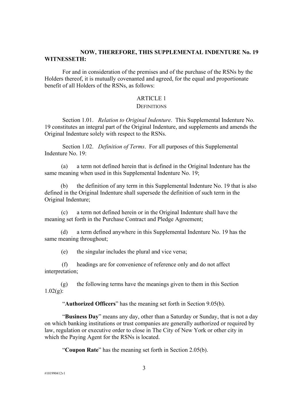 3 #101990412v1 NOW, THEREFORE, THIS SUPPLEMENTAL INDENTURE No. 19 WITNESSETH: For and in consideration of the premises and of the purchase of the RSNs by the Holders thereof, it is mutually covenanted and agreed, for the equal and proportionate benefit of all Holders of the RSNs, as follows: ARTICLE 1 DEFINITIONS Section 1.01. Relation to Original Indenture. This Supplemental Indenture No. 19 constitutes an integral part of the Original Indenture, and supplements and amends the Original Indenture solely with respect to the RSNs. Section 1.02. Definition of Terms. For all purposes of this Supplemental Indenture No. 19: (a) a term not defined herein that is defined in the Original Indenture has the same meaning when used in this Supplemental Indenture No. 19; (b) the definition of any term in this Supplemental Indenture No. 19 that is also defined in the Original Indenture shall supersede the definition of such term in the Original Indenture; (c) a term not defined herein or in the Original Indenture shall have the meaning set forth in the Purchase Contract and Pledge Agreement; (d) a term defined anywhere in this Supplemental Indenture No. 19 has the same meaning throughout; (e) the singular includes the plural and vice versa; (f) headings are for convenience of reference only and do not affect interpretation; (g) the following terms have the meanings given to them in this Section 1.02(g): “Authorized Officers” has the meaning set forth in Section 9.05(b). “Business Day” means any day, other than a Saturday or Sunday, that is not a day on which banking institutions or trust companies are generally authorized or required by law, regulation or executive order to close in The City of New York or other city in which the Paying Agent for the RSNs is located. “Coupon Rate” has the meaning set forth in Section 2.05(b).