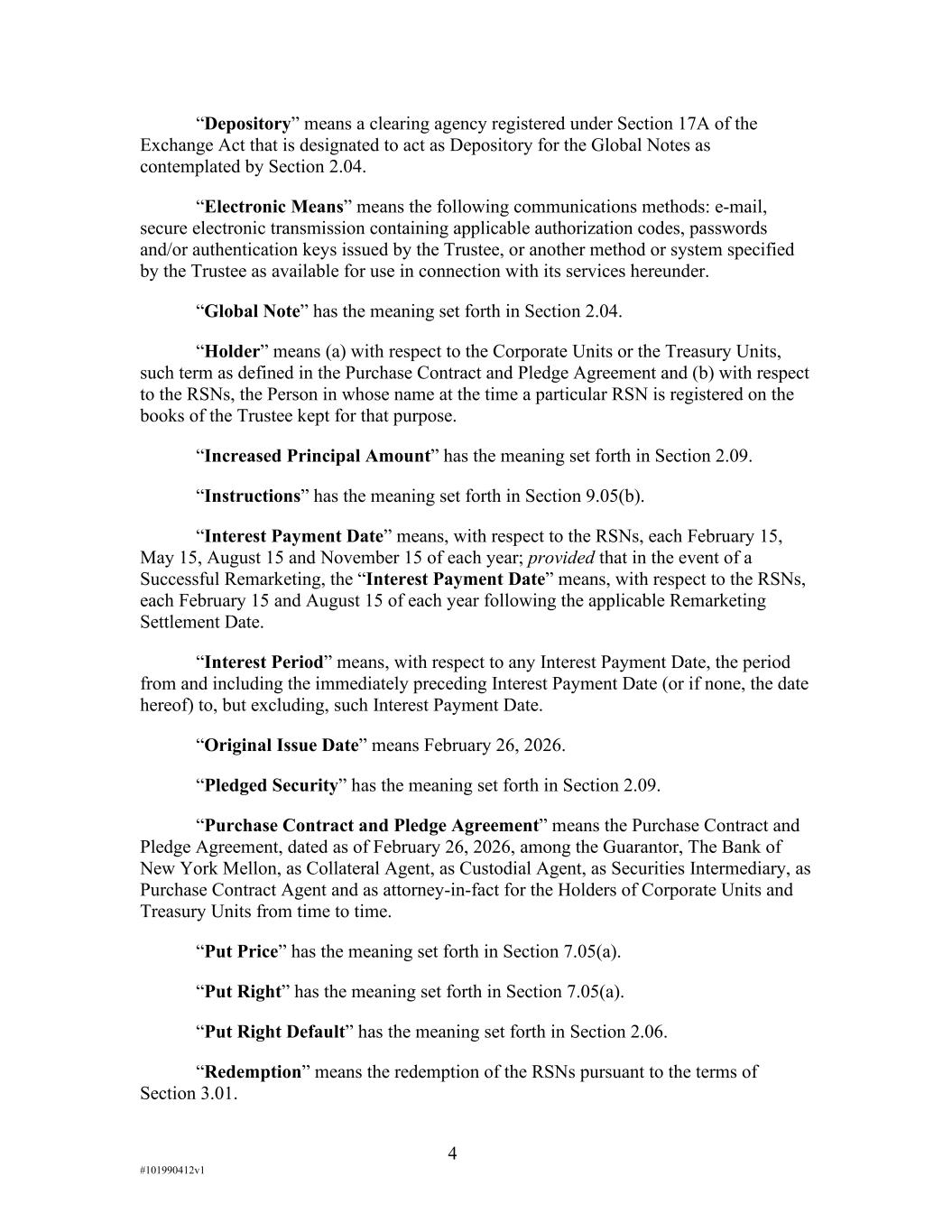 4 #101990412v1 “Depository” means a clearing agency registered under Section 17A of the Exchange Act that is designated to act as Depository for the Global Notes as contemplated by Section 2.04. “Electronic Means” means the following communications methods: e-mail, secure electronic transmission containing applicable authorization codes, passwords and/or authentication keys issued by the Trustee, or another method or system specified by the Trustee as available for use in connection with its services hereunder. “Global Note” has the meaning set forth in Section 2.04. “Holder” means (a) with respect to the Corporate Units or the Treasury Units, such term as defined in the Purchase Contract and Pledge Agreement and (b) with respect to the RSNs, the Person in whose name at the time a particular RSN is registered on the books of the Trustee kept for that purpose. “Increased Principal Amount” has the meaning set forth in Section 2.09. “Instructions” has the meaning set forth in Section 9.05(b). “Interest Payment Date” means, with respect to the RSNs, each February 15, May 15, August 15 and November 15 of each year; provided that in the event of a Successful Remarketing, the “Interest Payment Date” means, with respect to the RSNs, each February 15 and August 15 of each year following the applicable Remarketing Settlement Date. “Interest Period” means, with respect to any Interest Payment Date, the period from and including the immediately preceding Interest Payment Date (or if none, the date hereof) to, but excluding, such Interest Payment Date. “Original Issue Date” means February 26, 2026. “Pledged Security” has the meaning set forth in Section 2.09. “Purchase Contract and Pledge Agreement” means the Purchase Contract and Pledge Agreement, dated as of February 26, 2026, among the Guarantor, The Bank of New York Mellon, as Collateral Agent, as Custodial Agent, as Securities Intermediary, as Purchase Contract Agent and as attorney-in-fact for the Holders of Corporate Units and Treasury Units from time to time. “Put Price” has the meaning set forth in Section 7.05(a). “Put Right” has the meaning set forth in Section 7.05(a). “Put Right Default” has the meaning set forth in Section 2.06. “Redemption” means the redemption of the RSNs pursuant to the terms of Section 3.01.