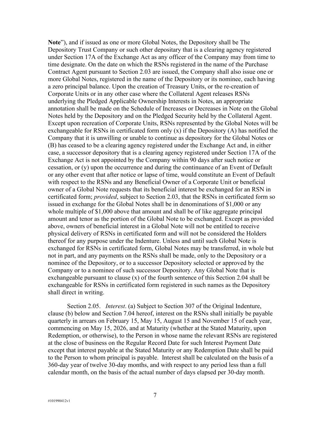 7 #101990412v1 Note”), and if issued as one or more Global Notes, the Depository shall be The Depository Trust Company or such other depositary that is a clearing agency registered under Section 17A of the Exchange Act as any officer of the Company may from time to time designate. On the date on which the RSNs registered in the name of the Purchase Contract Agent pursuant to Section 2.03 are issued, the Company shall also issue one or more Global Notes, registered in the name of the Depository or its nominee, each having a zero principal balance. Upon the creation of Treasury Units, or the re-creation of Corporate Units or in any other case where the Collateral Agent releases RSNs underlying the Pledged Applicable Ownership Interests in Notes, an appropriate annotation shall be made on the Schedule of Increases or Decreases in Note on the Global Notes held by the Depository and on the Pledged Security held by the Collateral Agent. Except upon recreation of Corporate Units, RSNs represented by the Global Notes will be exchangeable for RSNs in certificated form only (x) if the Depository (A) has notified the Company that it is unwilling or unable to continue as depository for the Global Notes or (B) has ceased to be a clearing agency registered under the Exchange Act and, in either case, a successor depository that is a clearing agency registered under Section 17A of the Exchange Act is not appointed by the Company within 90 days after such notice or cessation, or (y) upon the occurrence and during the continuance of an Event of Default or any other event that after notice or lapse of time, would constitute an Event of Default with respect to the RSNs and any Beneficial Owner of a Corporate Unit or beneficial owner of a Global Note requests that its beneficial interest be exchanged for an RSN in certificated form; provided, subject to Section 2.03, that the RSNs in certificated form so issued in exchange for the Global Notes shall be in denominations of $1,000 or any whole multiple of $1,000 above that amount and shall be of like aggregate principal amount and tenor as the portion of the Global Note to be exchanged. Except as provided above, owners of beneficial interest in a Global Note will not be entitled to receive physical delivery of RSNs in certificated form and will not be considered the Holders thereof for any purpose under the Indenture. Unless and until such Global Note is exchanged for RSNs in certificated form, Global Notes may be transferred, in whole but not in part, and any payments on the RSNs shall be made, only to the Depository or a nominee of the Depository, or to a successor Depository selected or approved by the Company or to a nominee of such successor Depository. Any Global Note that is exchangeable pursuant to clause (x) of the fourth sentence of this Section 2.04 shall be exchangeable for RSNs in certificated form registered in such names as the Depository shall direct in writing. Section 2.05. Interest. (a) Subject to Section 307 of the Original Indenture, clause (b) below and Section 7.04 hereof, interest on the RSNs shall initially be payable quarterly in arrears on February 15, May 15, August 15 and November 15 of each year, commencing on May 15, 2026, and at Maturity (whether at the Stated Maturity, upon Redemption, or otherwise), to the Person in whose name the relevant RSNs are registered at the close of business on the Regular Record Date for such Interest Payment Date except that interest payable at the Stated Maturity or any Redemption Date shall be paid to the Person to whom principal is payable. Interest shall be calculated on the basis of a 360-day year of twelve 30-day months, and with respect to any period less than a full calendar month, on the basis of the actual number of days elapsed per 30-day month.