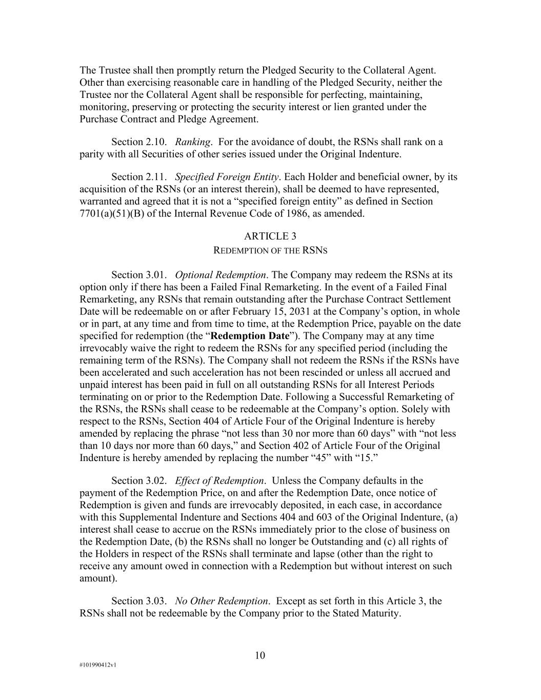 10 #101990412v1 The Trustee shall then promptly return the Pledged Security to the Collateral Agent. Other than exercising reasonable care in handling of the Pledged Security, neither the Trustee nor the Collateral Agent shall be responsible for perfecting, maintaining, monitoring, preserving or protecting the security interest or lien granted under the Purchase Contract and Pledge Agreement. Section 2.10. Ranking. For the avoidance of doubt, the RSNs shall rank on a parity with all Securities of other series issued under the Original Indenture. Section 2.11. Specified Foreign Entity. Each Holder and beneficial owner, by its acquisition of the RSNs (or an interest therein), shall be deemed to have represented, warranted and agreed that it is not a “specified foreign entity” as defined in Section 7701(a)(51)(B) of the Internal Revenue Code of 1986, as amended. ARTICLE 3 REDEMPTION OF THE RSNS Section 3.01. Optional Redemption. The Company may redeem the RSNs at its option only if there has been a Failed Final Remarketing. In the event of a Failed Final Remarketing, any RSNs that remain outstanding after the Purchase Contract Settlement Date will be redeemable on or after February 15, 2031 at the Company’s option, in whole or in part, at any time and from time to time, at the Redemption Price, payable on the date specified for redemption (the “Redemption Date”). The Company may at any time irrevocably waive the right to redeem the RSNs for any specified period (including the remaining term of the RSNs). The Company shall not redeem the RSNs if the RSNs have been accelerated and such acceleration has not been rescinded or unless all accrued and unpaid interest has been paid in full on all outstanding RSNs for all Interest Periods terminating on or prior to the Redemption Date. Following a Successful Remarketing of the RSNs, the RSNs shall cease to be redeemable at the Company’s option. Solely with respect to the RSNs, Section 404 of Article Four of the Original Indenture is hereby amended by replacing the phrase “not less than 30 nor more than 60 days” with “not less than 10 days nor more than 60 days,” and Section 402 of Article Four of the Original Indenture is hereby amended by replacing the number “45” with “15.” Section 3.02. Effect of Redemption. Unless the Company defaults in the payment of the Redemption Price, on and after the Redemption Date, once notice of Redemption is given and funds are irrevocably deposited, in each case, in accordance with this Supplemental Indenture and Sections 404 and 603 of the Original Indenture, (a) interest shall cease to accrue on the RSNs immediately prior to the close of business on the Redemption Date, (b) the RSNs shall no longer be Outstanding and (c) all rights of the Holders in respect of the RSNs shall terminate and lapse (other than the right to receive any amount owed in connection with a Redemption but without interest on such amount). Section 3.03. No Other Redemption. Except as set forth in this Article 3, the RSNs shall not be redeemable by the Company prior to the Stated Maturity.
