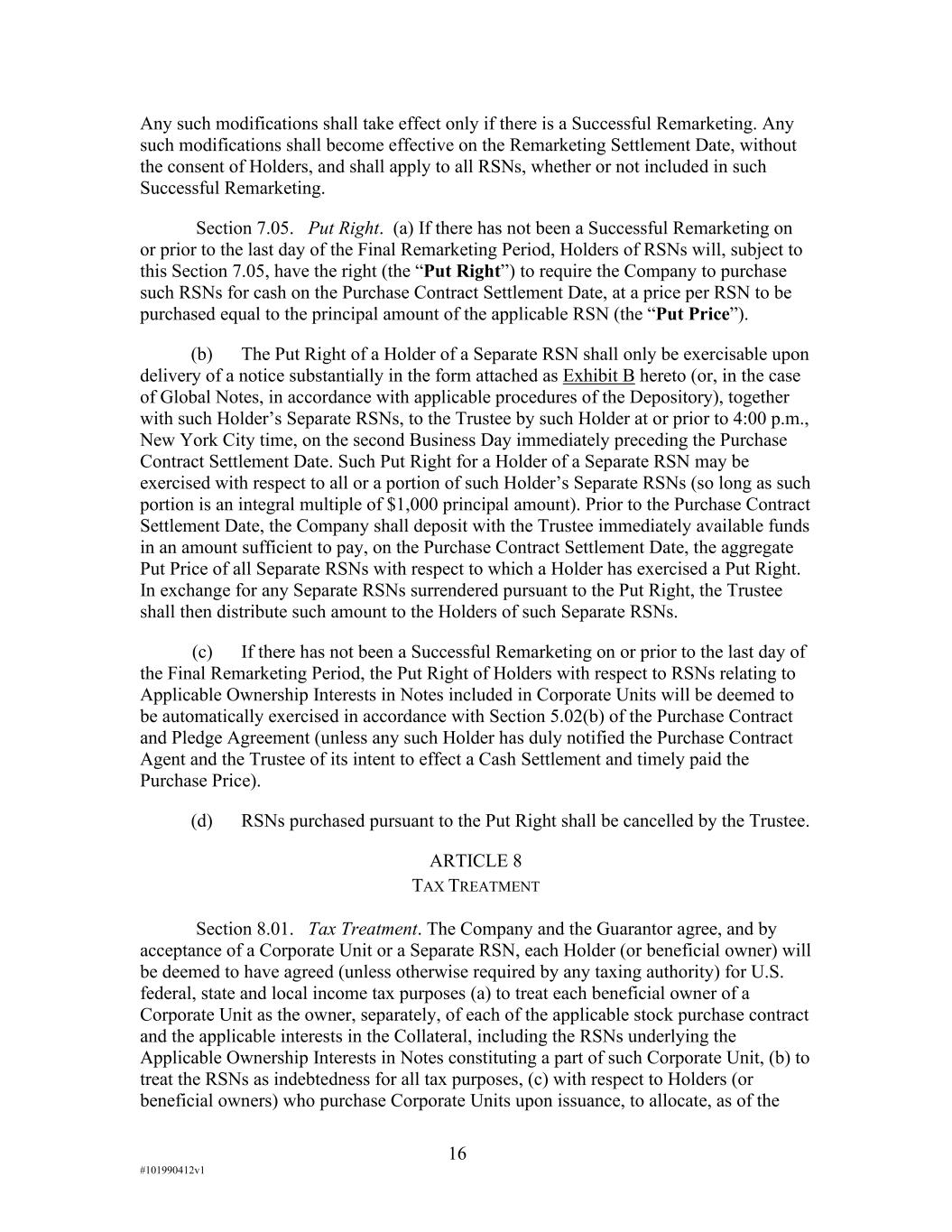 16 #101990412v1 Any such modifications shall take effect only if there is a Successful Remarketing. Any such modifications shall become effective on the Remarketing Settlement Date, without the consent of Holders, and shall apply to all RSNs, whether or not included in such Successful Remarketing. Section 7.05. Put Right. (a) If there has not been a Successful Remarketing on or prior to the last day of the Final Remarketing Period, Holders of RSNs will, subject to this Section 7.05, have the right (the “Put Right”) to require the Company to purchase such RSNs for cash on the Purchase Contract Settlement Date, at a price per RSN to be purchased equal to the principal amount of the applicable RSN (the “Put Price”). (b) The Put Right of a Holder of a Separate RSN shall only be exercisable upon delivery of a notice substantially in the form attached as Exhibit B hereto (or, in the case of Global Notes, in accordance with applicable procedures of the Depository), together with such Holder’s Separate RSNs, to the Trustee by such Holder at or prior to 4:00 p.m., New York City time, on the second Business Day immediately preceding the Purchase Contract Settlement Date. Such Put Right for a Holder of a Separate RSN may be exercised with respect to all or a portion of such Holder’s Separate RSNs (so long as such portion is an integral multiple of $1,000 principal amount). Prior to the Purchase Contract Settlement Date, the Company shall deposit with the Trustee immediately available funds in an amount sufficient to pay, on the Purchase Contract Settlement Date, the aggregate Put Price of all Separate RSNs with respect to which a Holder has exercised a Put Right. In exchange for any Separate RSNs surrendered pursuant to the Put Right, the Trustee shall then distribute such amount to the Holders of such Separate RSNs. (c) If there has not been a Successful Remarketing on or prior to the last day of the Final Remarketing Period, the Put Right of Holders with respect to RSNs relating to Applicable Ownership Interests in Notes included in Corporate Units will be deemed to be automatically exercised in accordance with Section 5.02(b) of the Purchase Contract and Pledge Agreement (unless any such Holder has duly notified the Purchase Contract Agent and the Trustee of its intent to effect a Cash Settlement and timely paid the Purchase Price). (d) RSNs purchased pursuant to the Put Right shall be cancelled by the Trustee. ARTICLE 8 TAX TREATMENT Section 8.01. Tax Treatment. The Company and the Guarantor agree, and by acceptance of a Corporate Unit or a Separate RSN, each Holder (or beneficial owner) will be deemed to have agreed (unless otherwise required by any taxing authority) for U.S. federal, state and local income tax purposes (a) to treat each beneficial owner of a Corporate Unit as the owner, separately, of each of the applicable stock purchase contract and the applicable interests in the Collateral, including the RSNs underlying the Applicable Ownership Interests in Notes constituting a part of such Corporate Unit, (b) to treat the RSNs as indebtedness for all tax purposes, (c) with respect to Holders (or beneficial owners) who purchase Corporate Units upon issuance, to allocate, as of the