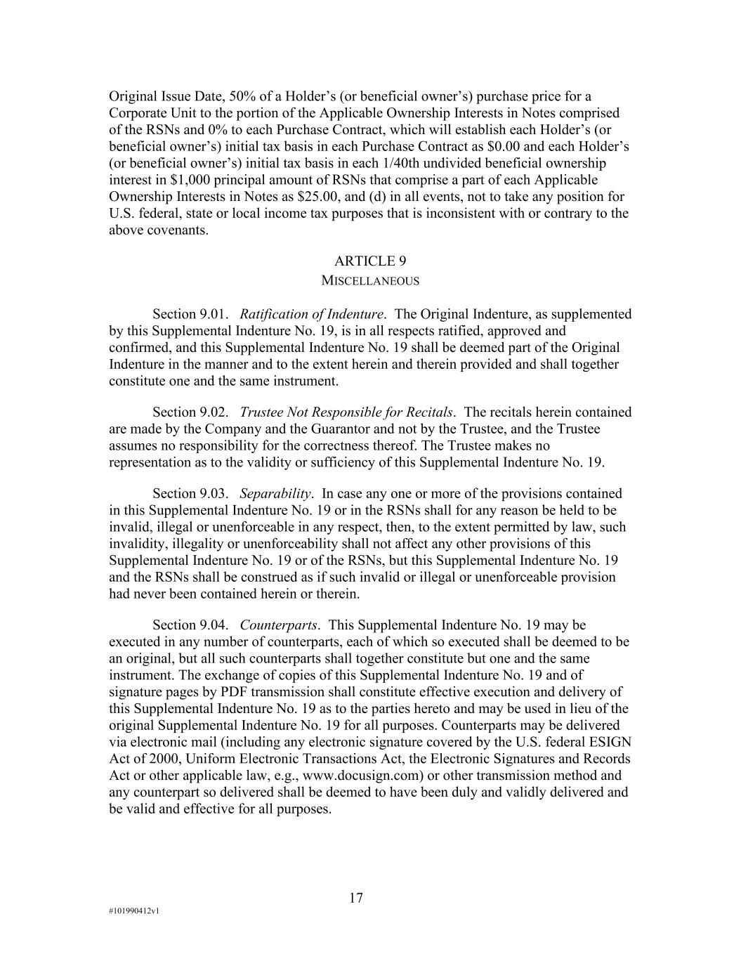 17 #101990412v1 Original Issue Date, 50% of a Holder’s (or beneficial owner’s) purchase price for a Corporate Unit to the portion of the Applicable Ownership Interests in Notes comprised of the RSNs and 0% to each Purchase Contract, which will establish each Holder’s (or beneficial owner’s) initial tax basis in each Purchase Contract as $0.00 and each Holder’s (or beneficial owner’s) initial tax basis in each 1/40th undivided beneficial ownership interest in $1,000 principal amount of RSNs that comprise a part of each Applicable Ownership Interests in Notes as $25.00, and (d) in all events, not to take any position for U.S. federal, state or local income tax purposes that is inconsistent with or contrary to the above covenants. ARTICLE 9 MISCELLANEOUS Section 9.01. Ratification of Indenture. The Original Indenture, as supplemented by this Supplemental Indenture No. 19, is in all respects ratified, approved and confirmed, and this Supplemental Indenture No. 19 shall be deemed part of the Original Indenture in the manner and to the extent herein and therein provided and shall together constitute one and the same instrument. Section 9.02. Trustee Not Responsible for Recitals. The recitals herein contained are made by the Company and the Guarantor and not by the Trustee, and the Trustee assumes no responsibility for the correctness thereof. The Trustee makes no representation as to the validity or sufficiency of this Supplemental Indenture No. 19. Section 9.03. Separability. In case any one or more of the provisions contained in this Supplemental Indenture No. 19 or in the RSNs shall for any reason be held to be invalid, illegal or unenforceable in any respect, then, to the extent permitted by law, such invalidity, illegality or unenforceability shall not affect any other provisions of this Supplemental Indenture No. 19 or of the RSNs, but this Supplemental Indenture No. 19 and the RSNs shall be construed as if such invalid or illegal or unenforceable provision had never been contained herein or therein. Section 9.04. Counterparts. This Supplemental Indenture No. 19 may be executed in any number of counterparts, each of which so executed shall be deemed to be an original, but all such counterparts shall together constitute but one and the same instrument. The exchange of copies of this Supplemental Indenture No. 19 and of signature pages by PDF transmission shall constitute effective execution and delivery of this Supplemental Indenture No. 19 as to the parties hereto and may be used in lieu of the original Supplemental Indenture No. 19 for all purposes. Counterparts may be delivered via electronic mail (including any electronic signature covered by the U.S. federal ESIGN Act of 2000, Uniform Electronic Transactions Act, the Electronic Signatures and Records Act or other applicable law, e.g., www.docusign.com) or other transmission method and any counterpart so delivered shall be deemed to have been duly and validly delivered and be valid and effective for all purposes.