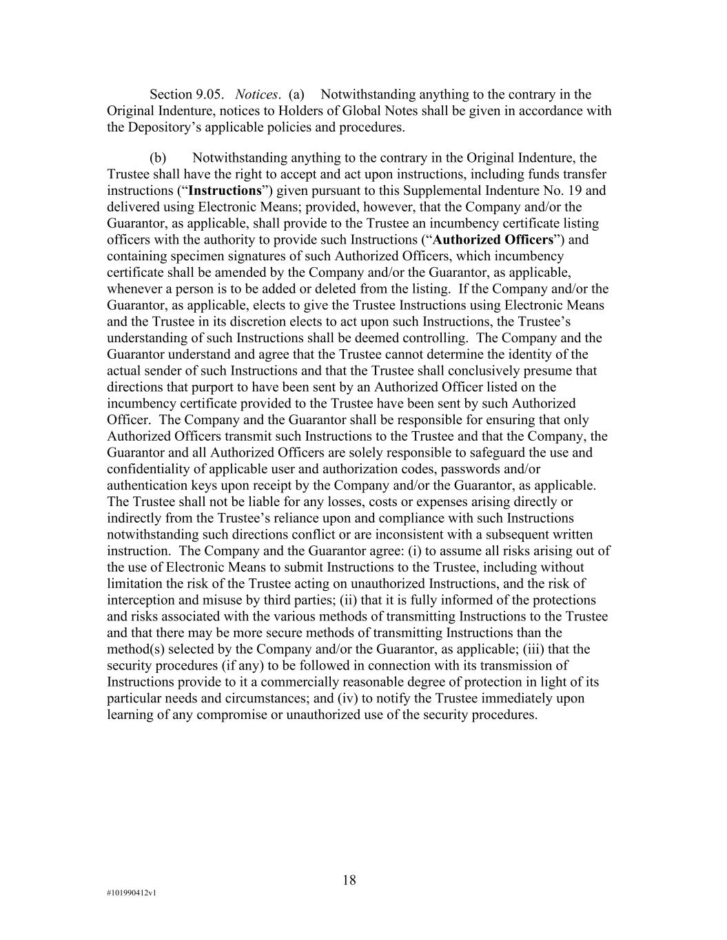 18 #101990412v1 Section 9.05. Notices. (a) Notwithstanding anything to the contrary in the Original Indenture, notices to Holders of Global Notes shall be given in accordance with the Depository’s applicable policies and procedures. (b) Notwithstanding anything to the contrary in the Original Indenture, the Trustee shall have the right to accept and act upon instructions, including funds transfer instructions (“Instructions”) given pursuant to this Supplemental Indenture No. 19 and delivered using Electronic Means; provided, however, that the Company and/or the Guarantor, as applicable, shall provide to the Trustee an incumbency certificate listing officers with the authority to provide such Instructions (“Authorized Officers”) and containing specimen signatures of such Authorized Officers, which incumbency certificate shall be amended by the Company and/or the Guarantor, as applicable, whenever a person is to be added or deleted from the listing. If the Company and/or the Guarantor, as applicable, elects to give the Trustee Instructions using Electronic Means and the Trustee in its discretion elects to act upon such Instructions, the Trustee’s understanding of such Instructions shall be deemed controlling. The Company and the Guarantor understand and agree that the Trustee cannot determine the identity of the actual sender of such Instructions and that the Trustee shall conclusively presume that directions that purport to have been sent by an Authorized Officer listed on the incumbency certificate provided to the Trustee have been sent by such Authorized Officer. The Company and the Guarantor shall be responsible for ensuring that only Authorized Officers transmit such Instructions to the Trustee and that the Company, the Guarantor and all Authorized Officers are solely responsible to safeguard the use and confidentiality of applicable user and authorization codes, passwords and/or authentication keys upon receipt by the Company and/or the Guarantor, as applicable. The Trustee shall not be liable for any losses, costs or expenses arising directly or indirectly from the Trustee’s reliance upon and compliance with such Instructions notwithstanding such directions conflict or are inconsistent with a subsequent written instruction. The Company and the Guarantor agree: (i) to assume all risks arising out of the use of Electronic Means to submit Instructions to the Trustee, including without limitation the risk of the Trustee acting on unauthorized Instructions, and the risk of interception and misuse by third parties; (ii) that it is fully informed of the protections and risks associated with the various methods of transmitting Instructions to the Trustee and that there may be more secure methods of transmitting Instructions than the method(s) selected by the Company and/or the Guarantor, as applicable; (iii) that the security procedures (if any) to be followed in connection with its transmission of Instructions provide to it a commercially reasonable degree of protection in light of its particular needs and circumstances; and (iv) to notify the Trustee immediately upon learning of any compromise or unauthorized use of the security procedures.