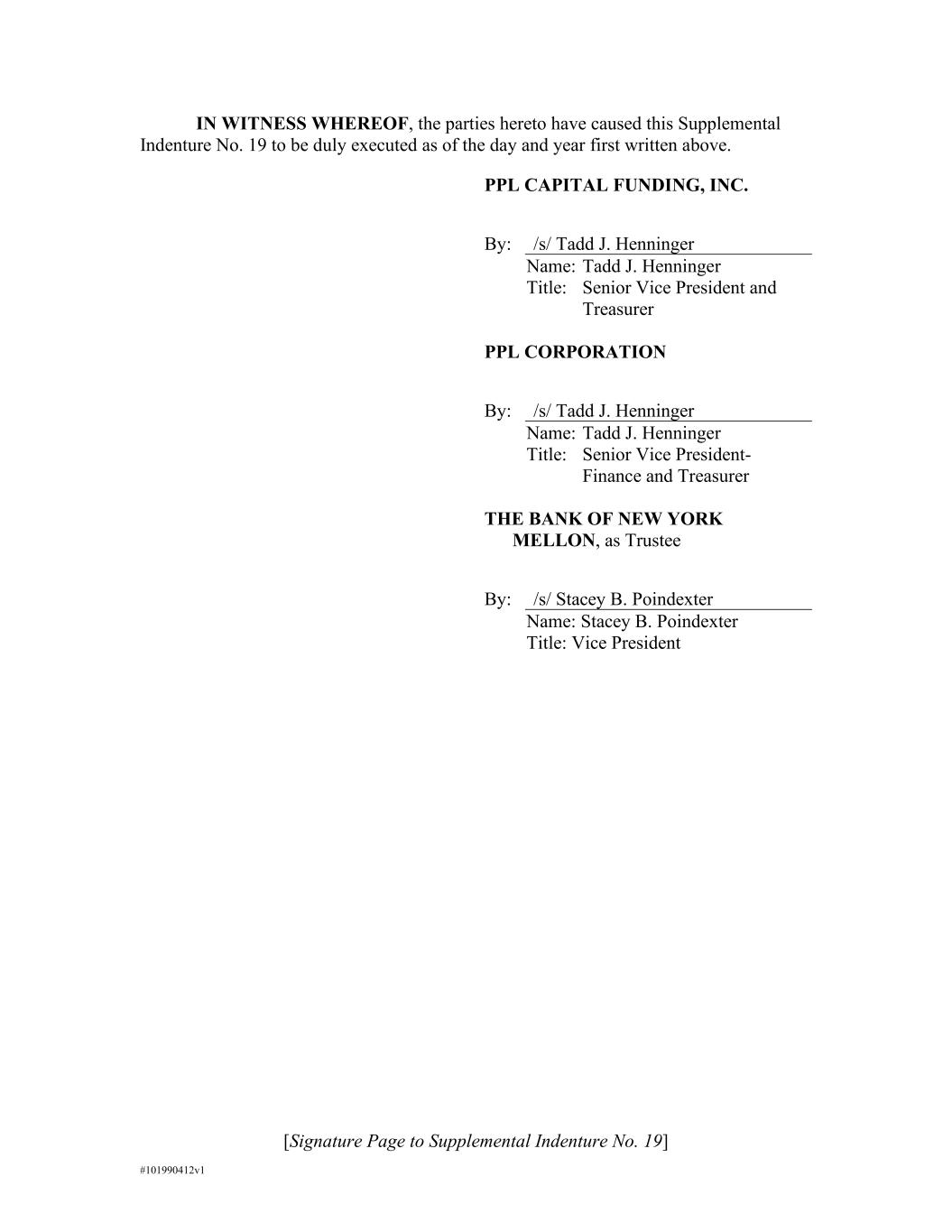 [Signature Page to Supplemental Indenture No. 19] #101990412v1 IN WITNESS WHEREOF, the parties hereto have caused this Supplemental Indenture No. 19 to be duly executed as of the day and year first written above. PPL CAPITAL FUNDING, INC. By: /s/ Tadd J. Henninger Name: Tadd J. Henninger Title: Senior Vice President and Treasurer PPL CORPORATION By: /s/ Tadd J. Henninger Name: Tadd J. Henninger Title: Senior Vice President- Finance and Treasurer THE BANK OF NEW YORK MELLON, as Trustee By: /s/ Stacey B. Poindexter Name: Stacey B. Poindexter Title: Vice President