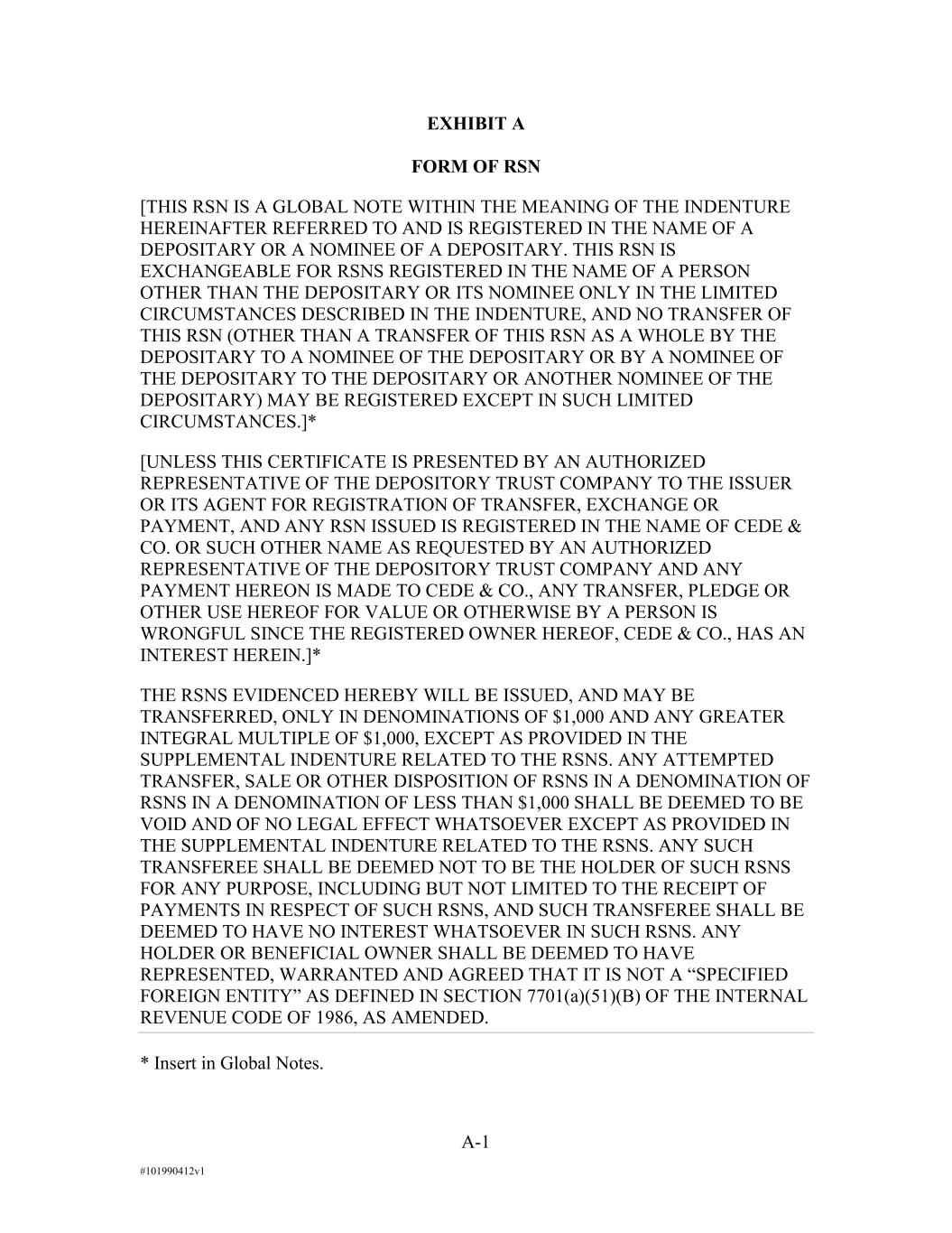 A-1 #101990412v1 EXHIBIT A FORM OF RSN [THIS RSN IS A GLOBAL NOTE WITHIN THE MEANING OF THE INDENTURE HEREINAFTER REFERRED TO AND IS REGISTERED IN THE NAME OF A DEPOSITARY OR A NOMINEE OF A DEPOSITARY. THIS RSN IS EXCHANGEABLE FOR RSNS REGISTERED IN THE NAME OF A PERSON OTHER THAN THE DEPOSITARY OR ITS NOMINEE ONLY IN THE LIMITED CIRCUMSTANCES DESCRIBED IN THE INDENTURE, AND NO TRANSFER OF THIS RSN (OTHER THAN A TRANSFER OF THIS RSN AS A WHOLE BY THE DEPOSITARY TO A NOMINEE OF THE DEPOSITARY OR BY A NOMINEE OF THE DEPOSITARY TO THE DEPOSITARY OR ANOTHER NOMINEE OF THE DEPOSITARY) MAY BE REGISTERED EXCEPT IN SUCH LIMITED CIRCUMSTANCES.]* [UNLESS THIS CERTIFICATE IS PRESENTED BY AN AUTHORIZED REPRESENTATIVE OF THE DEPOSITORY TRUST COMPANY TO THE ISSUER OR ITS AGENT FOR REGISTRATION OF TRANSFER, EXCHANGE OR PAYMENT, AND ANY RSN ISSUED IS REGISTERED IN THE NAME OF CEDE & CO. OR SUCH OTHER NAME AS REQUESTED BY AN AUTHORIZED REPRESENTATIVE OF THE DEPOSITORY TRUST COMPANY AND ANY PAYMENT HEREON IS MADE TO CEDE & CO., ANY TRANSFER, PLEDGE OR OTHER USE HEREOF FOR VALUE OR OTHERWISE BY A PERSON IS WRONGFUL SINCE THE REGISTERED OWNER HEREOF, CEDE & CO., HAS AN INTEREST HEREIN.]* THE RSNS EVIDENCED HEREBY WILL BE ISSUED, AND MAY BE TRANSFERRED, ONLY IN DENOMINATIONS OF $1,000 AND ANY GREATER INTEGRAL MULTIPLE OF $1,000, EXCEPT AS PROVIDED IN THE SUPPLEMENTAL INDENTURE RELATED TO THE RSNS. ANY ATTEMPTED TRANSFER, SALE OR OTHER DISPOSITION OF RSNS IN A DENOMINATION OF RSNS IN A DENOMINATION OF LESS THAN $1,000 SHALL BE DEEMED TO BE VOID AND OF NO LEGAL EFFECT WHATSOEVER EXCEPT AS PROVIDED IN THE SUPPLEMENTAL INDENTURE RELATED TO THE RSNS. ANY SUCH TRANSFEREE SHALL BE DEEMED NOT TO BE THE HOLDER OF SUCH RSNS FOR ANY PURPOSE, INCLUDING BUT NOT LIMITED TO THE RECEIPT OF PAYMENTS IN RESPECT OF SUCH RSNS, AND SUCH TRANSFEREE SHALL BE DEEMED TO HAVE NO INTEREST WHATSOEVER IN SUCH RSNS. ANY HOLDER OR BENEFICIAL OWNER SHALL BE DEEMED TO HAVE REPRESENTED, WARRANTED AND AGREED THAT IT IS NOT A “SPECIFIED FOREIGN ENTITY” AS DEFINED IN SECTION 7701(a)(51)(B) OF THE INTERNAL REVENUE CODE OF 1986, AS AMENDED. * Insert in Global Notes.