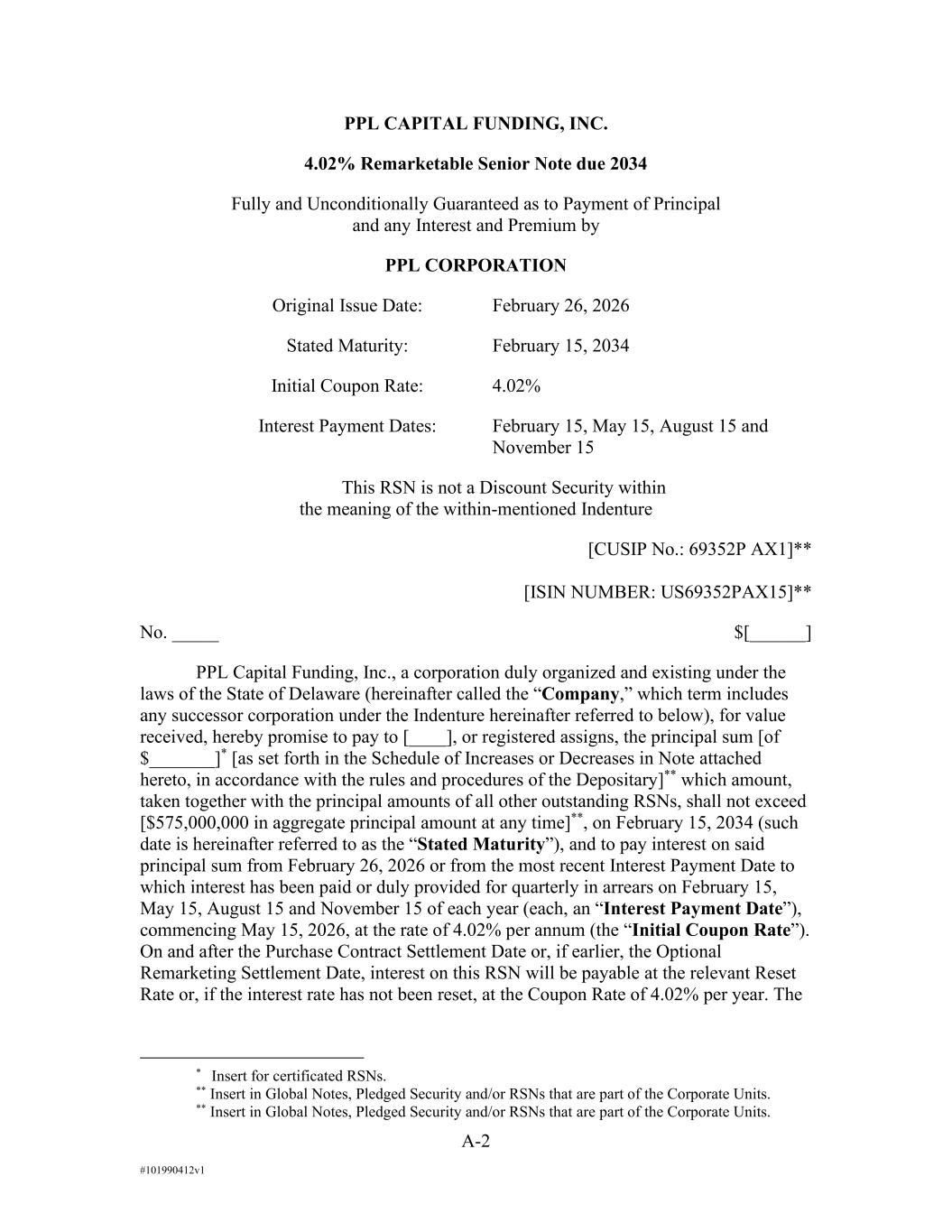 A-2 #101990412v1 PPL CAPITAL FUNDING, INC. 4.02% Remarketable Senior Note due 2034 Fully and Unconditionally Guaranteed as to Payment of Principal and any Interest and Premium by PPL CORPORATION Original Issue Date: February 26, 2026 Stated Maturity: February 15, 2034 Initial Coupon Rate: 4.02% Interest Payment Dates: February 15, May 15, August 15 and November 15 This RSN is not a Discount Security within the meaning of the within-mentioned Indenture [CUSIP No.: 69352P AX1]** [ISIN NUMBER: US69352PAX15]** No. _____ $[______] PPL Capital Funding, Inc., a corporation duly organized and existing under the laws of the State of Delaware (hereinafter called the “Company,” which term includes any successor corporation under the Indenture hereinafter referred to below), for value received, hereby promise to pay to [____], or registered assigns, the principal sum [of $_______]* [as set forth in the Schedule of Increases or Decreases in Note attached hereto, in accordance with the rules and procedures of the Depositary]** which amount, taken together with the principal amounts of all other outstanding RSNs, shall not exceed [$575,000,000 in aggregate principal amount at any time]**, on February 15, 2034 (such date is hereinafter referred to as the “Stated Maturity”), and to pay interest on said principal sum from February 26, 2026 or from the most recent Interest Payment Date to which interest has been paid or duly provided for quarterly in arrears on February 15, May 15, August 15 and November 15 of each year (each, an “Interest Payment Date”), commencing May 15, 2026, at the rate of 4.02% per annum (the “Initial Coupon Rate”). On and after the Purchase Contract Settlement Date or, if earlier, the Optional Remarketing Settlement Date, interest on this RSN will be payable at the relevant Reset Rate or, if the interest rate has not been reset, at the Coupon Rate of 4.02% per year. The * Insert for certificated RSNs. ** Insert in Global Notes, Pledged Security and/or RSNs that are part of the Corporate Units. ** Insert in Global Notes, Pledged Security and/or RSNs that are part of the Corporate Units.
