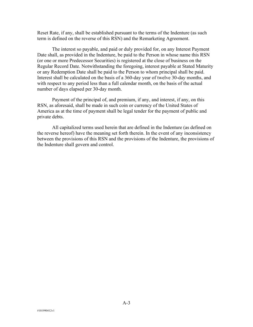 A-3 #101990412v1 Reset Rate, if any, shall be established pursuant to the terms of the Indenture (as such term is defined on the reverse of this RSN) and the Remarketing Agreement. The interest so payable, and paid or duly provided for, on any Interest Payment Date shall, as provided in the Indenture, be paid to the Person in whose name this RSN (or one or more Predecessor Securities) is registered at the close of business on the Regular Record Date. Notwithstanding the foregoing, interest payable at Stated Maturity or any Redemption Date shall be paid to the Person to whom principal shall be paid. Interest shall be calculated on the basis of a 360-day year of twelve 30-day months, and with respect to any period less than a full calendar month, on the basis of the actual number of days elapsed per 30-day month. Payment of the principal of, and premium, if any, and interest, if any, on this RSN, as aforesaid, shall be made in such coin or currency of the United States of America as at the time of payment shall be legal tender for the payment of public and private debts. All capitalized terms used herein that are defined in the Indenture (as defined on the reverse hereof) have the meaning set forth therein. In the event of any inconsistency between the provisions of this RSN and the provisions of the Indenture, the provisions of the Indenture shall govern and control.