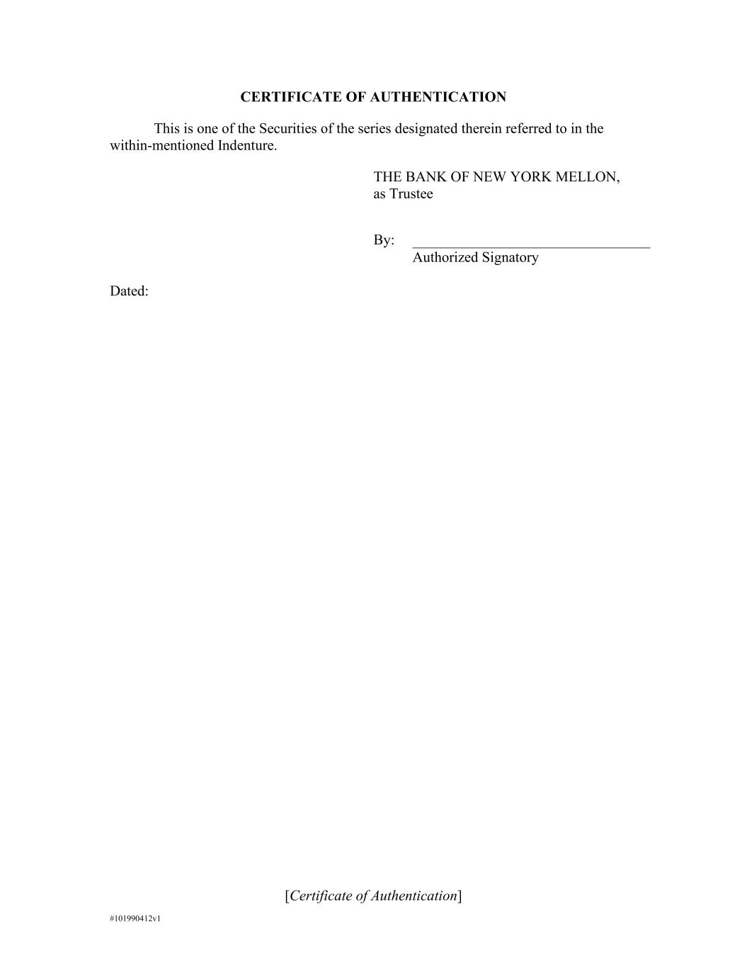 [Certificate of Authentication] #101990412v1 CERTIFICATE OF AUTHENTICATION This is one of the Securities of the series designated therein referred to in the within-mentioned Indenture. THE BANK OF NEW YORK MELLON, as Trustee By: Authorized Signatory Dated: