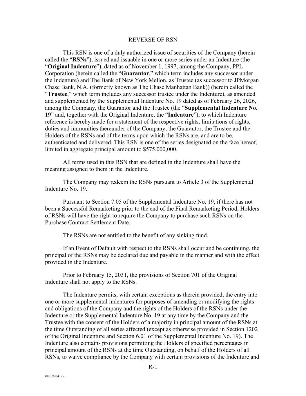 R-1 #101990412v1 REVERSE OF RSN This RSN is one of a duly authorized issue of securities of the Company (herein called the “RSNs”), issued and issuable in one or more series under an Indenture (the “Original Indenture”), dated as of November 1, 1997, among the Company, PPL Corporation (herein called the “Guarantor,” which term includes any successor under the Indenture) and The Bank of New York Mellon, as Trustee (as successor to JPMorgan Chase Bank, N.A. (formerly known as The Chase Manhattan Bank)) (herein called the “Trustee,” which term includes any successor trustee under the Indenture), as amended and supplemented by the Supplemental Indenture No. 19 dated as of February 26, 2026, among the Company, the Guarantor and the Trustee (the “Supplemental Indenture No. 19” and, together with the Original Indenture, the “Indenture”), to which Indenture reference is hereby made for a statement of the respective rights, limitations of rights, duties and immunities thereunder of the Company, the Guarantor, the Trustee and the Holders of the RSNs and of the terms upon which the RSNs are, and are to be, authenticated and delivered. This RSN is one of the series designated on the face hereof, limited in aggregate principal amount to $575,000,000. All terms used in this RSN that are defined in the Indenture shall have the meaning assigned to them in the Indenture. The Company may redeem the RSNs pursuant to Article 3 of the Supplemental Indenture No. 19. Pursuant to Section 7.05 of the Supplemental Indenture No. 19, if there has not been a Successful Remarketing prior to the end of the Final Remarketing Period, Holders of RSNs will have the right to require the Company to purchase such RSNs on the Purchase Contract Settlement Date. The RSNs are not entitled to the benefit of any sinking fund. If an Event of Default with respect to the RSNs shall occur and be continuing, the principal of the RSNs may be declared due and payable in the manner and with the effect provided in the Indenture. Prior to February 15, 2031, the provisions of Section 701 of the Original Indenture shall not apply to the RSNs. The Indenture permits, with certain exceptions as therein provided, the entry into one or more supplemental indentures for purposes of amending or modifying the rights and obligations of the Company and the rights of the Holders of the RSNs under the Indenture or the Supplemental Indenture No. 19 at any time by the Company and the Trustee with the consent of the Holders of a majority in principal amount of the RSNs at the time Outstanding of all series affected (except as otherwise provided in Section 1202 of the Original Indenture and Section 6.01 of the Supplemental Indenture No. 19). The Indenture also contains provisions permitting the Holders of specified percentages in principal amount of the RSNs at the time Outstanding, on behalf of the Holders of all RSNs, to waive compliance by the Company with certain provisions of the Indenture and