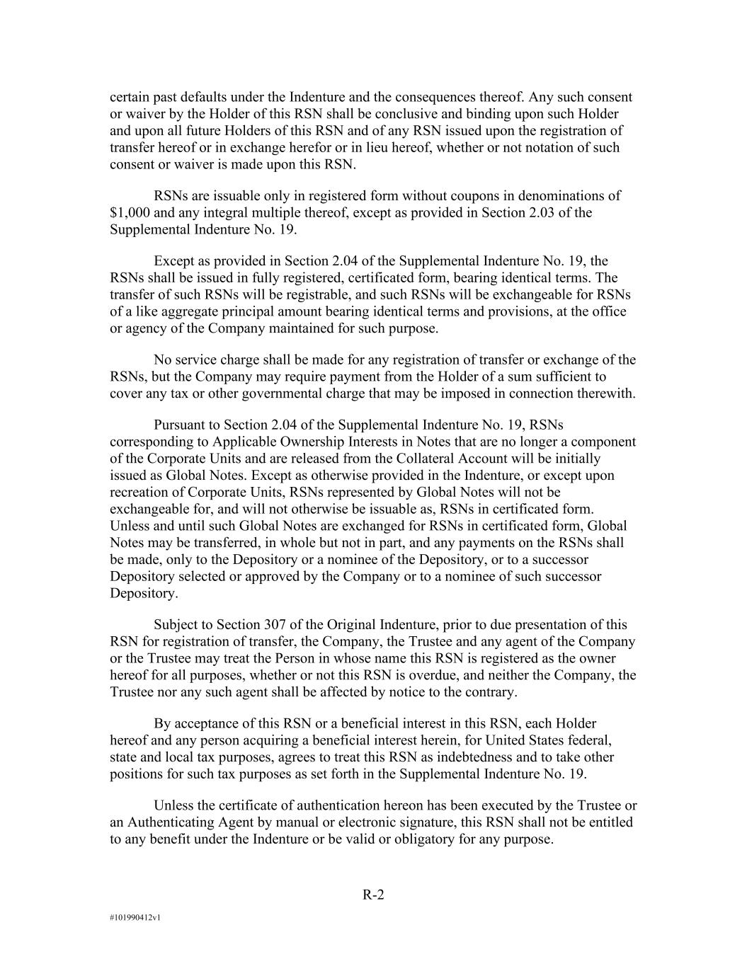 R-2 #101990412v1 certain past defaults under the Indenture and the consequences thereof. Any such consent or waiver by the Holder of this RSN shall be conclusive and binding upon such Holder and upon all future Holders of this RSN and of any RSN issued upon the registration of transfer hereof or in exchange herefor or in lieu hereof, whether or not notation of such consent or waiver is made upon this RSN. RSNs are issuable only in registered form without coupons in denominations of $1,000 and any integral multiple thereof, except as provided in Section 2.03 of the Supplemental Indenture No. 19. Except as provided in Section 2.04 of the Supplemental Indenture No. 19, the RSNs shall be issued in fully registered, certificated form, bearing identical terms. The transfer of such RSNs will be registrable, and such RSNs will be exchangeable for RSNs of a like aggregate principal amount bearing identical terms and provisions, at the office or agency of the Company maintained for such purpose. No service charge shall be made for any registration of transfer or exchange of the RSNs, but the Company may require payment from the Holder of a sum sufficient to cover any tax or other governmental charge that may be imposed in connection therewith. Pursuant to Section 2.04 of the Supplemental Indenture No. 19, RSNs corresponding to Applicable Ownership Interests in Notes that are no longer a component of the Corporate Units and are released from the Collateral Account will be initially issued as Global Notes. Except as otherwise provided in the Indenture, or except upon recreation of Corporate Units, RSNs represented by Global Notes will not be exchangeable for, and will not otherwise be issuable as, RSNs in certificated form. Unless and until such Global Notes are exchanged for RSNs in certificated form, Global Notes may be transferred, in whole but not in part, and any payments on the RSNs shall be made, only to the Depository or a nominee of the Depository, or to a successor Depository selected or approved by the Company or to a nominee of such successor Depository. Subject to Section 307 of the Original Indenture, prior to due presentation of this RSN for registration of transfer, the Company, the Trustee and any agent of the Company or the Trustee may treat the Person in whose name this RSN is registered as the owner hereof for all purposes, whether or not this RSN is overdue, and neither the Company, the Trustee nor any such agent shall be affected by notice to the contrary. By acceptance of this RSN or a beneficial interest in this RSN, each Holder hereof and any person acquiring a beneficial interest herein, for United States federal, state and local tax purposes, agrees to treat this RSN as indebtedness and to take other positions for such tax purposes as set forth in the Supplemental Indenture No. 19. Unless the certificate of authentication hereon has been executed by the Trustee or an Authenticating Agent by manual or electronic signature, this RSN shall not be entitled to any benefit under the Indenture or be valid or obligatory for any purpose.