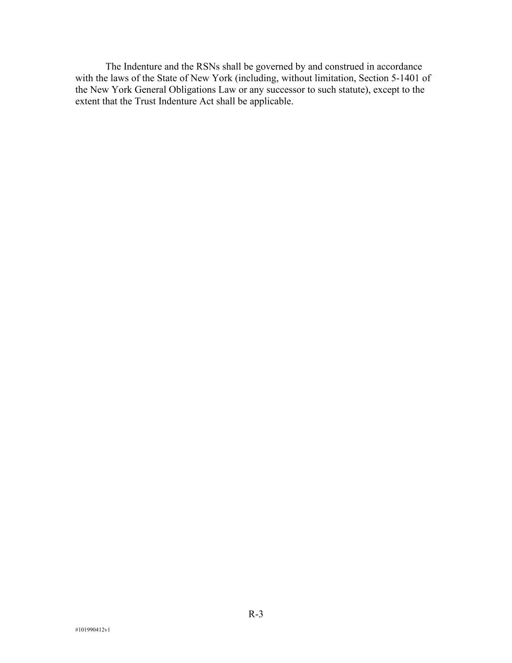 R-3 #101990412v1 The Indenture and the RSNs shall be governed by and construed in accordance with the laws of the State of New York (including, without limitation, Section 5-1401 of the New York General Obligations Law or any successor to such statute), except to the extent that the Trust Indenture Act shall be applicable.